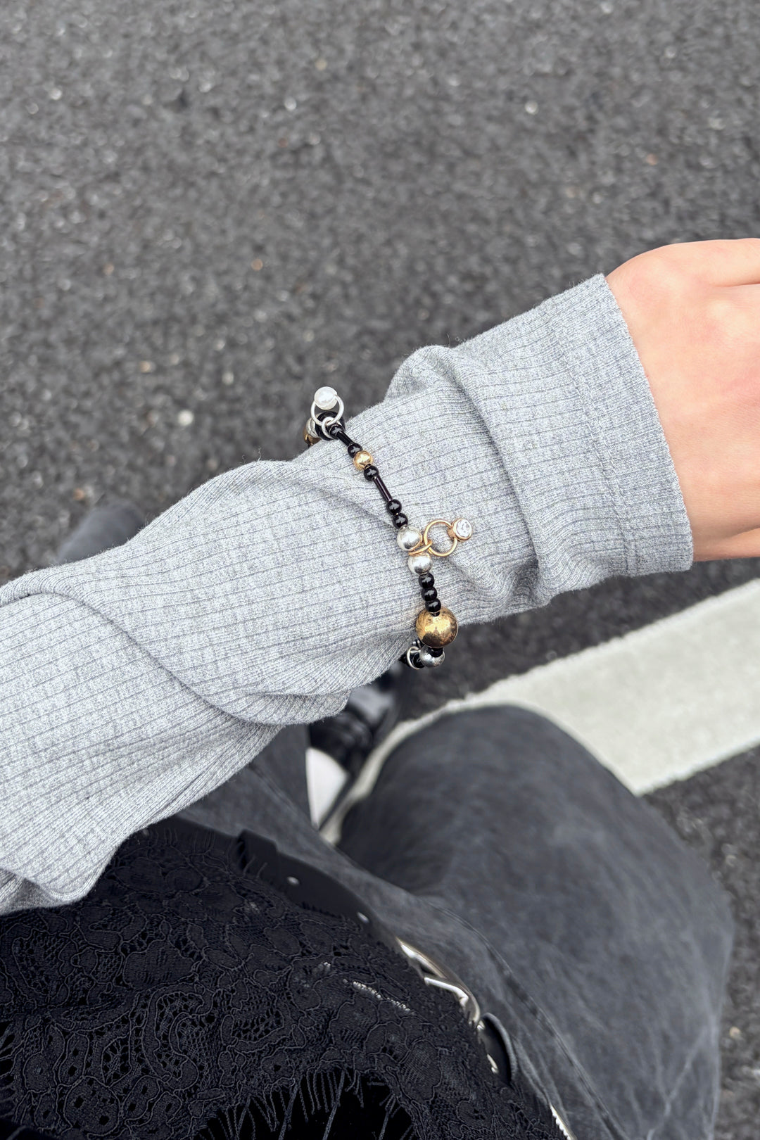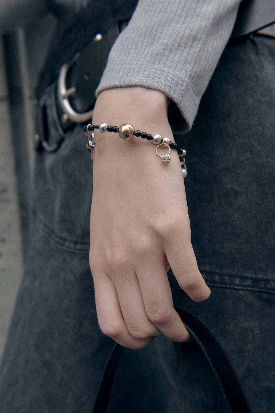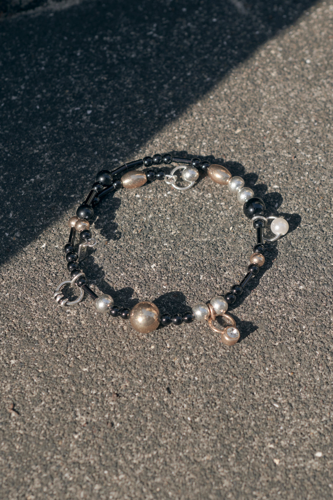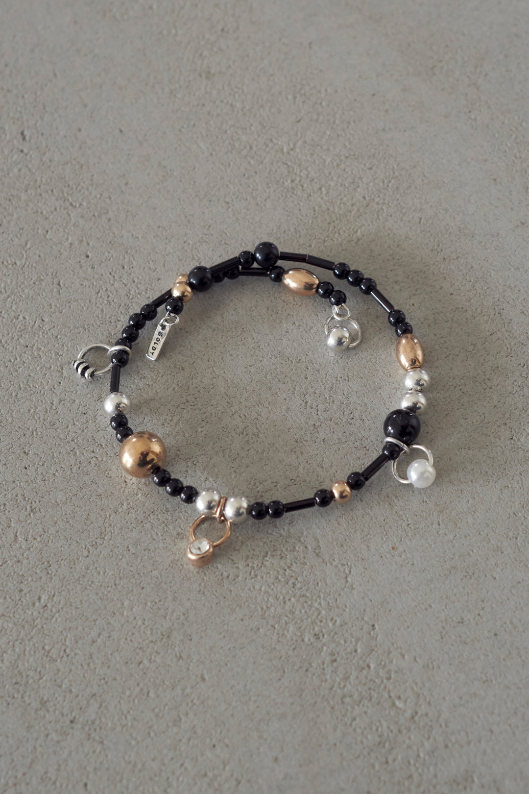 パールやビーズをあしらったバングルに、さまざまなモチーフのチャームを組み合わせたデザイン。