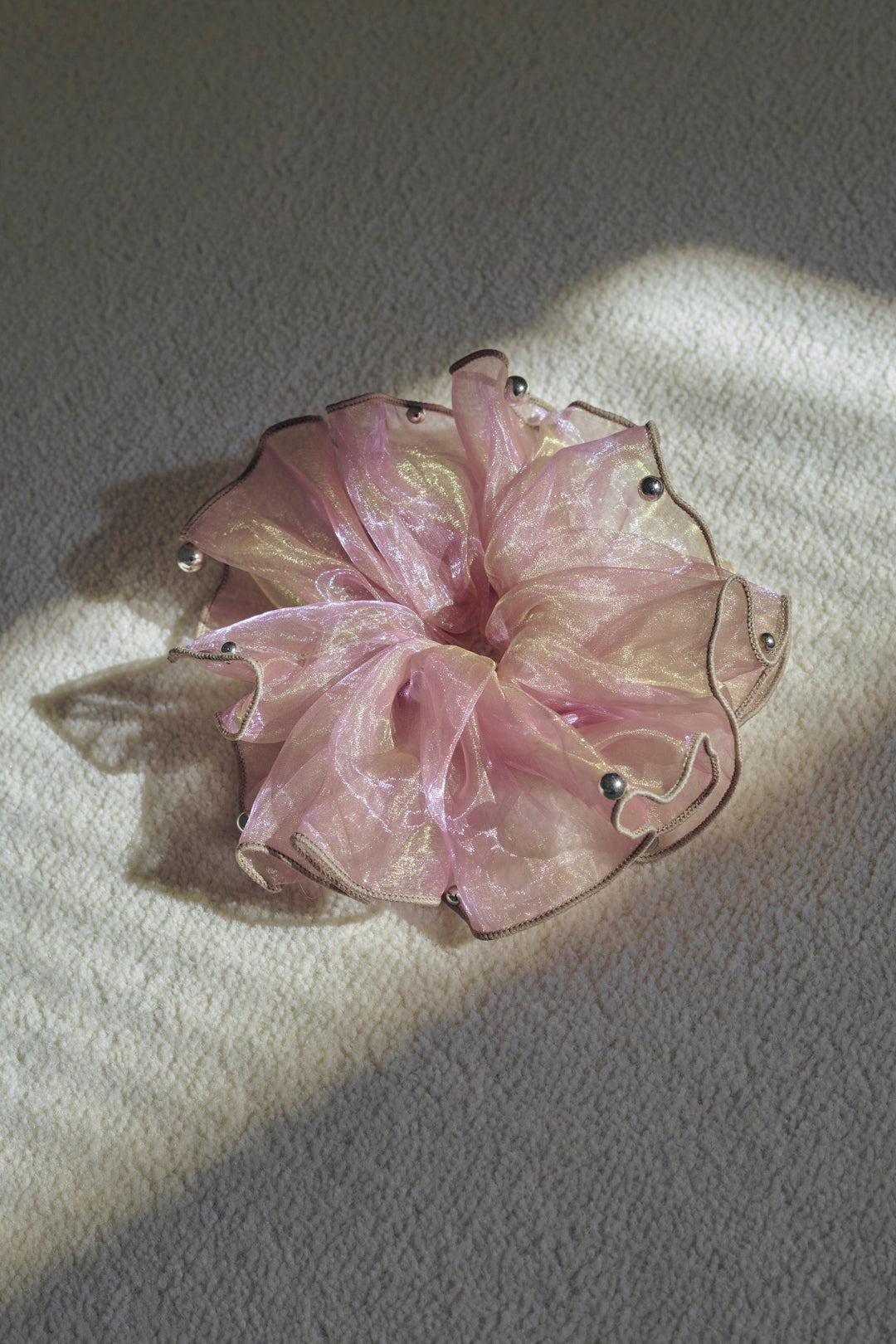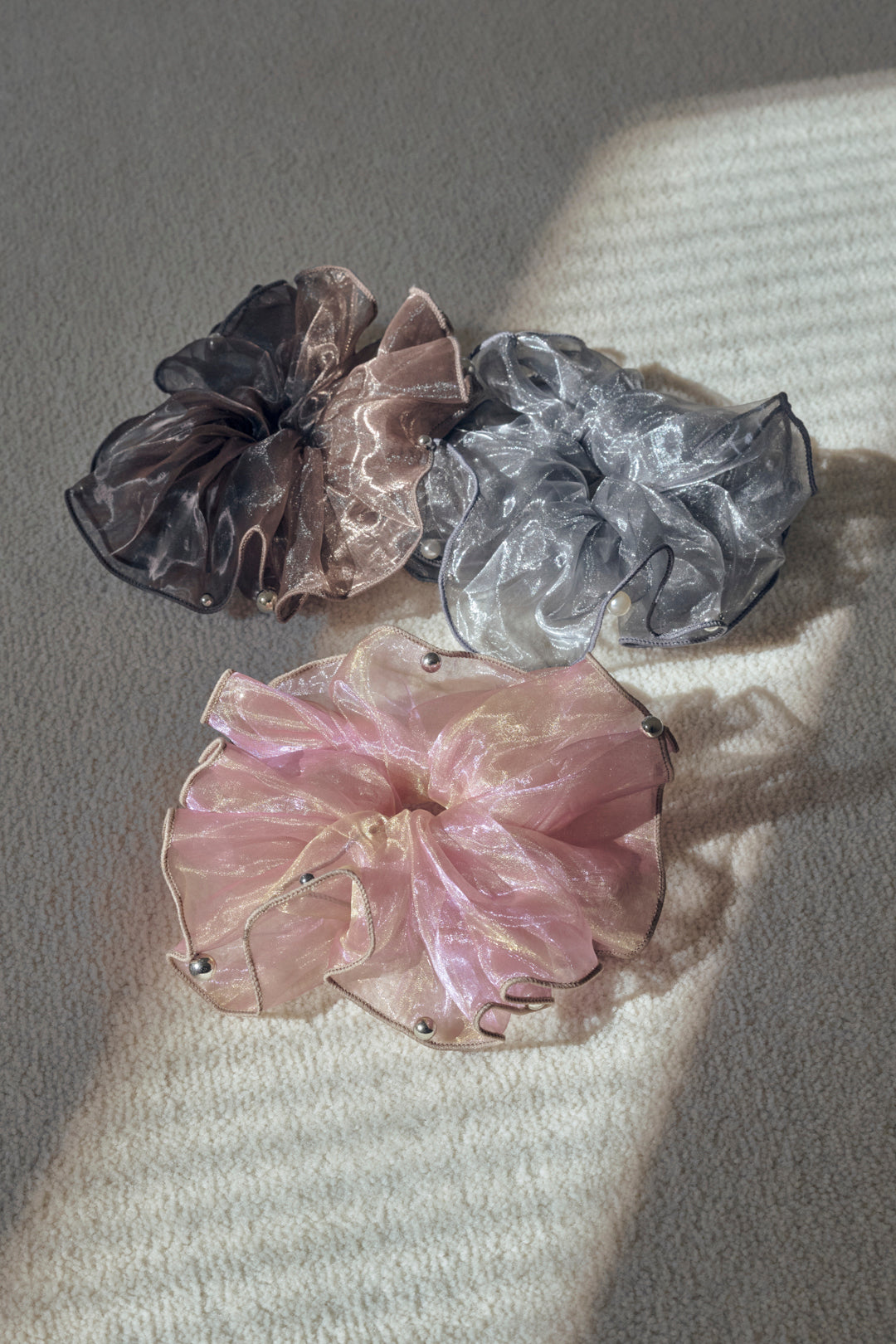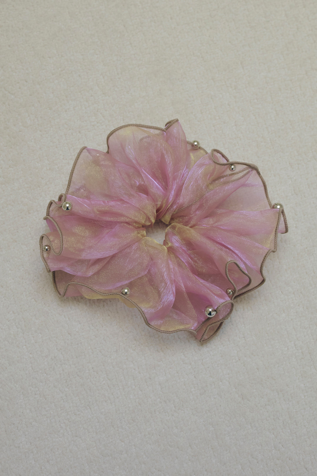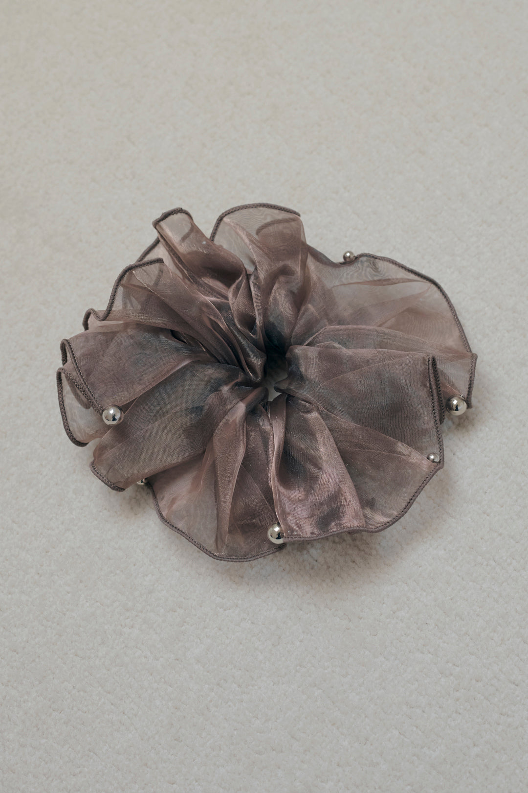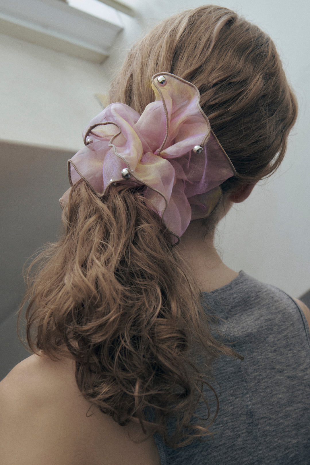 シアー生地のシュシュに、パールやメタルボールが散りばめられたデザイン。