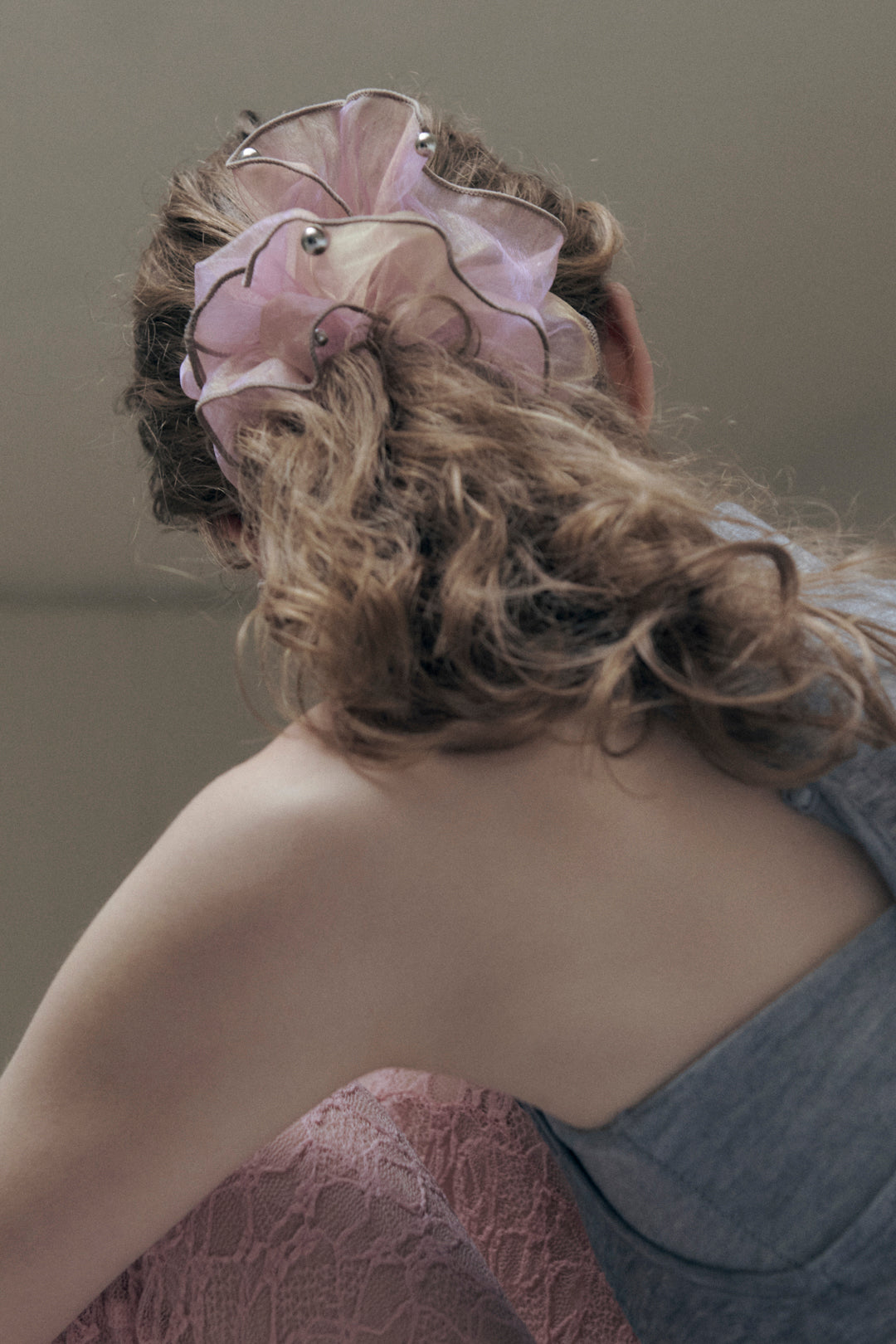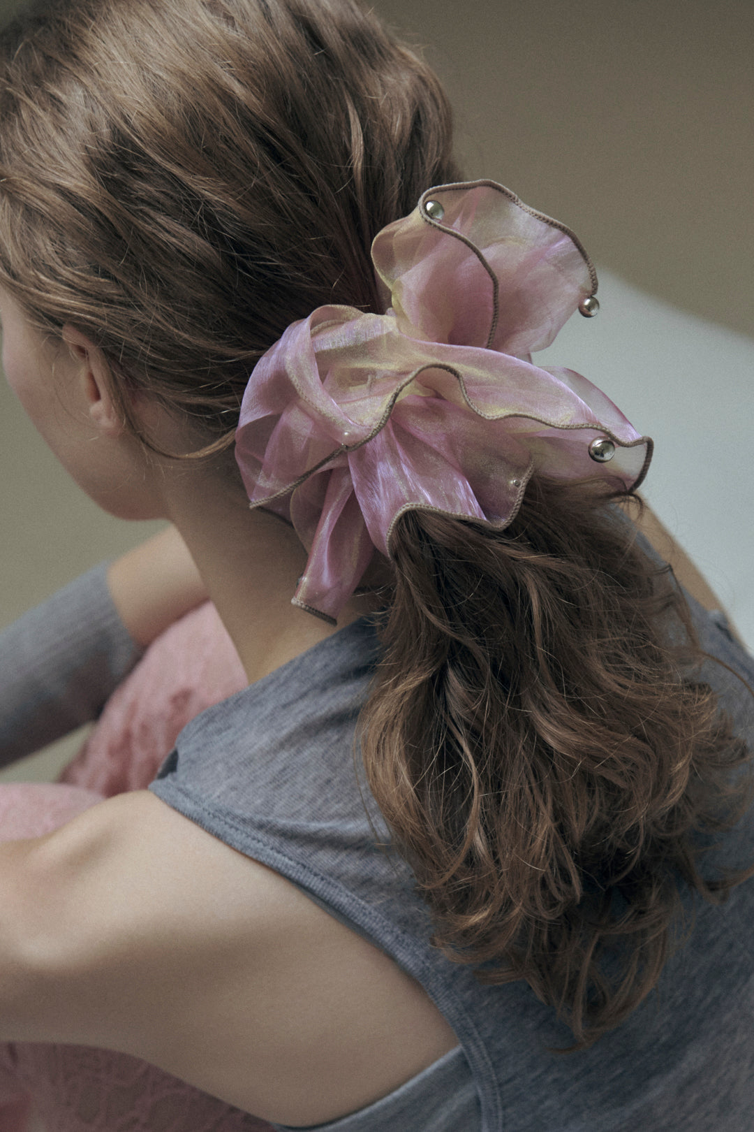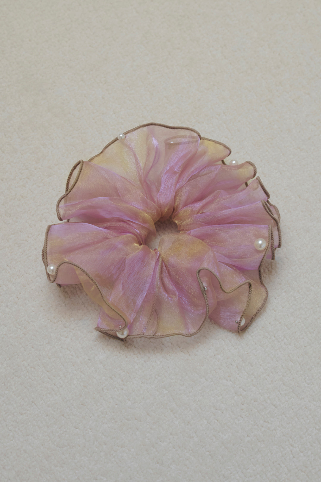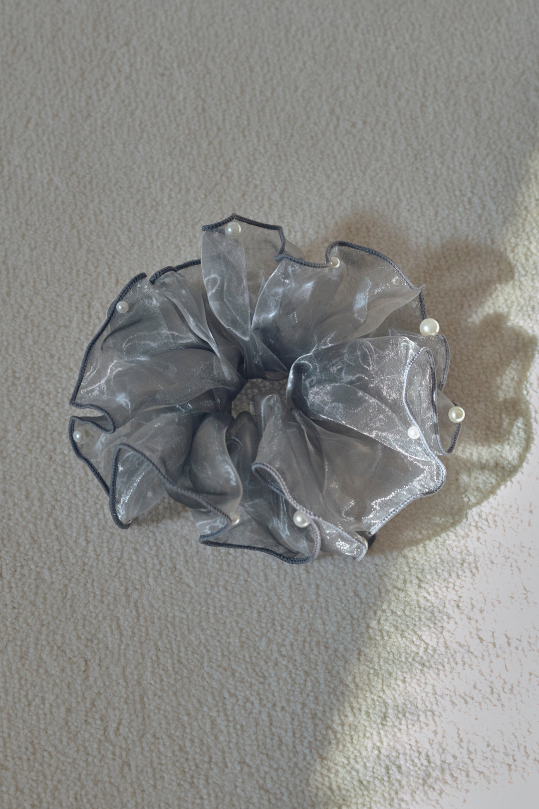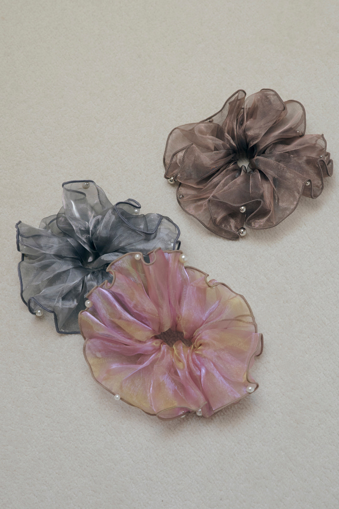 シアー生地のシュシュに、パールやメタルボールが散りばめられたデザイン。