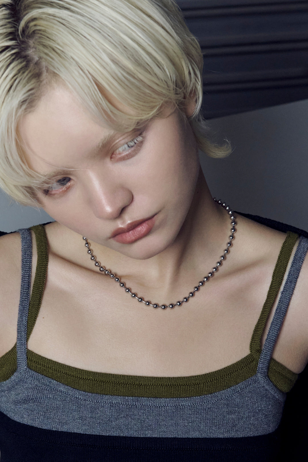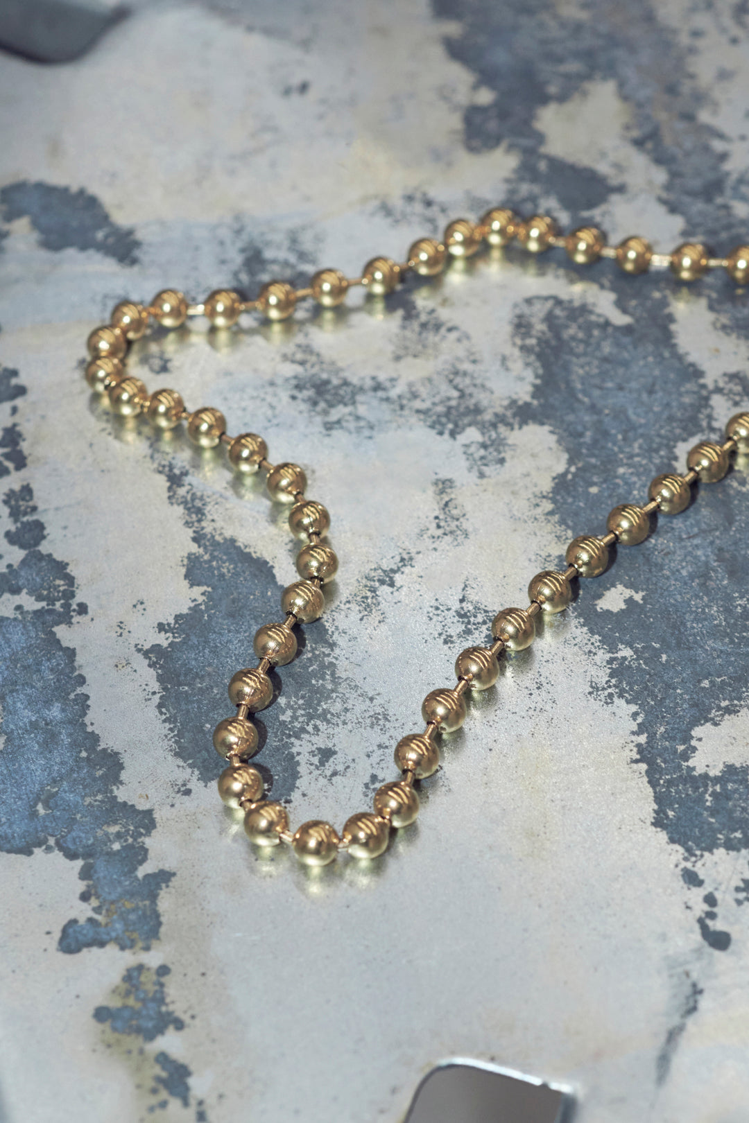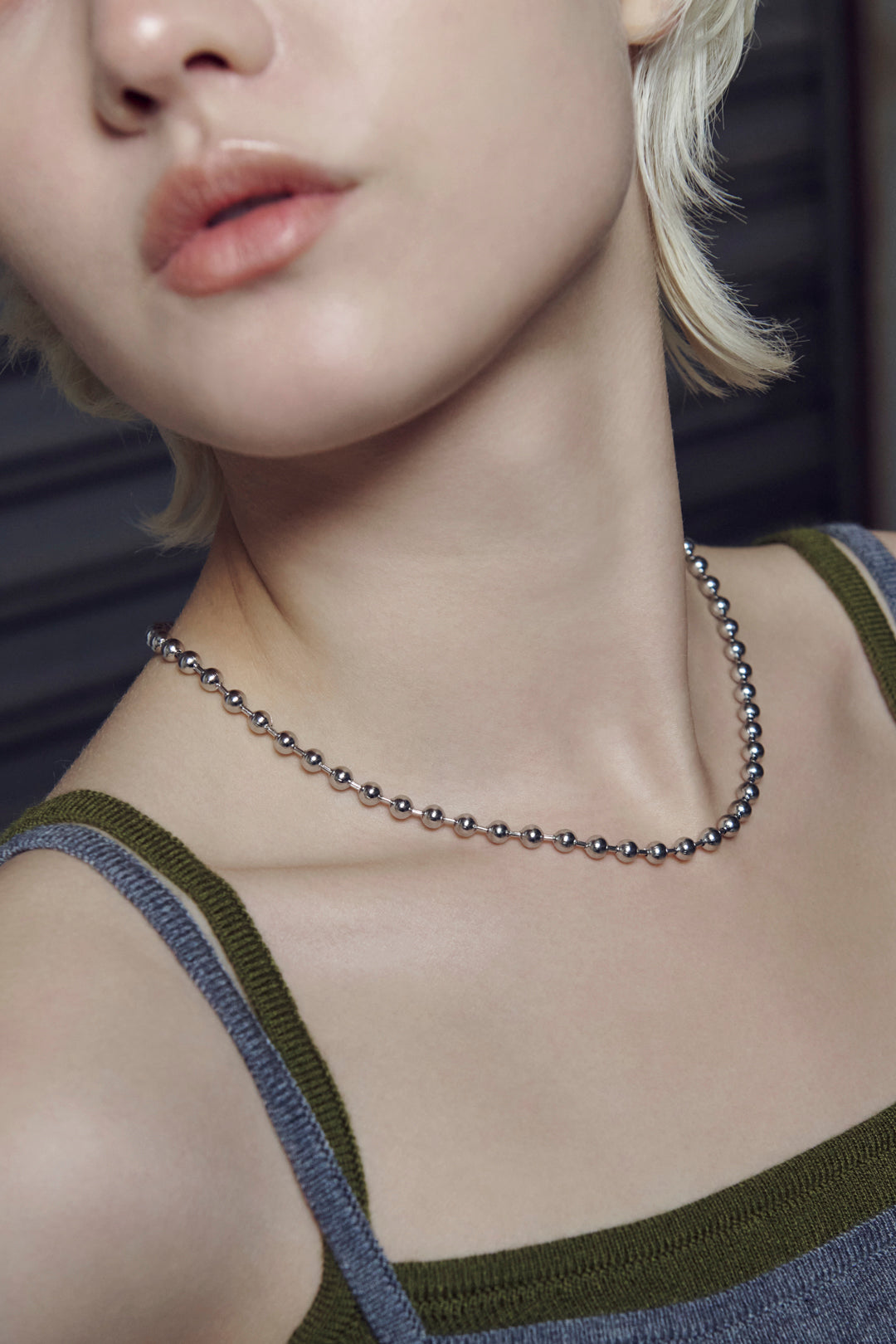 シンプルなボールチェーンのネックレスは、程よいボリューム感で首元のアクセントに。