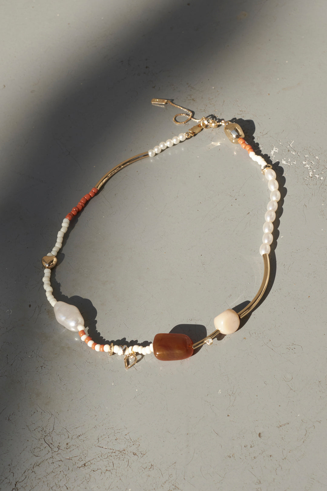 メタルやカラービーズ、パールをランダムに組み合わせたネックレス。