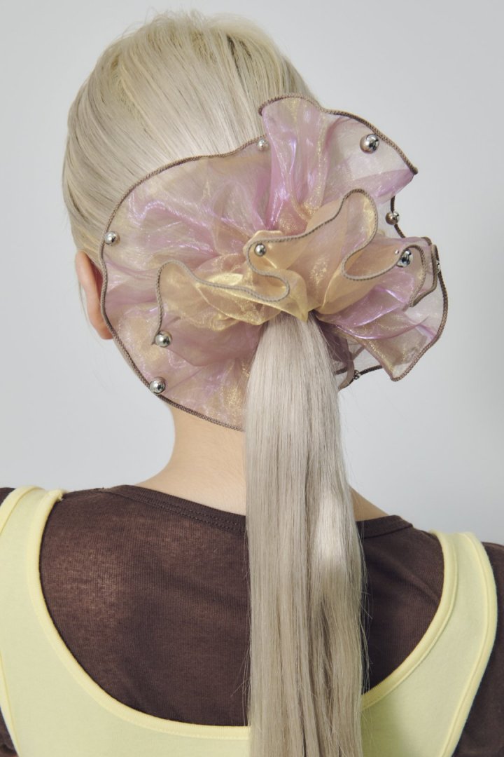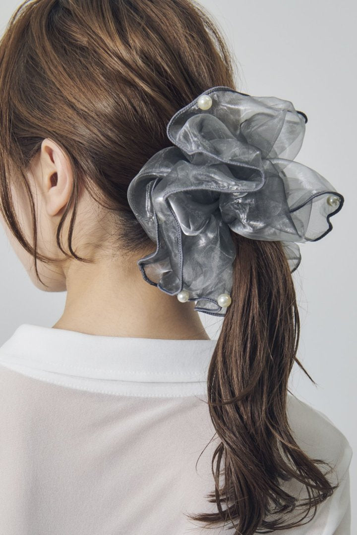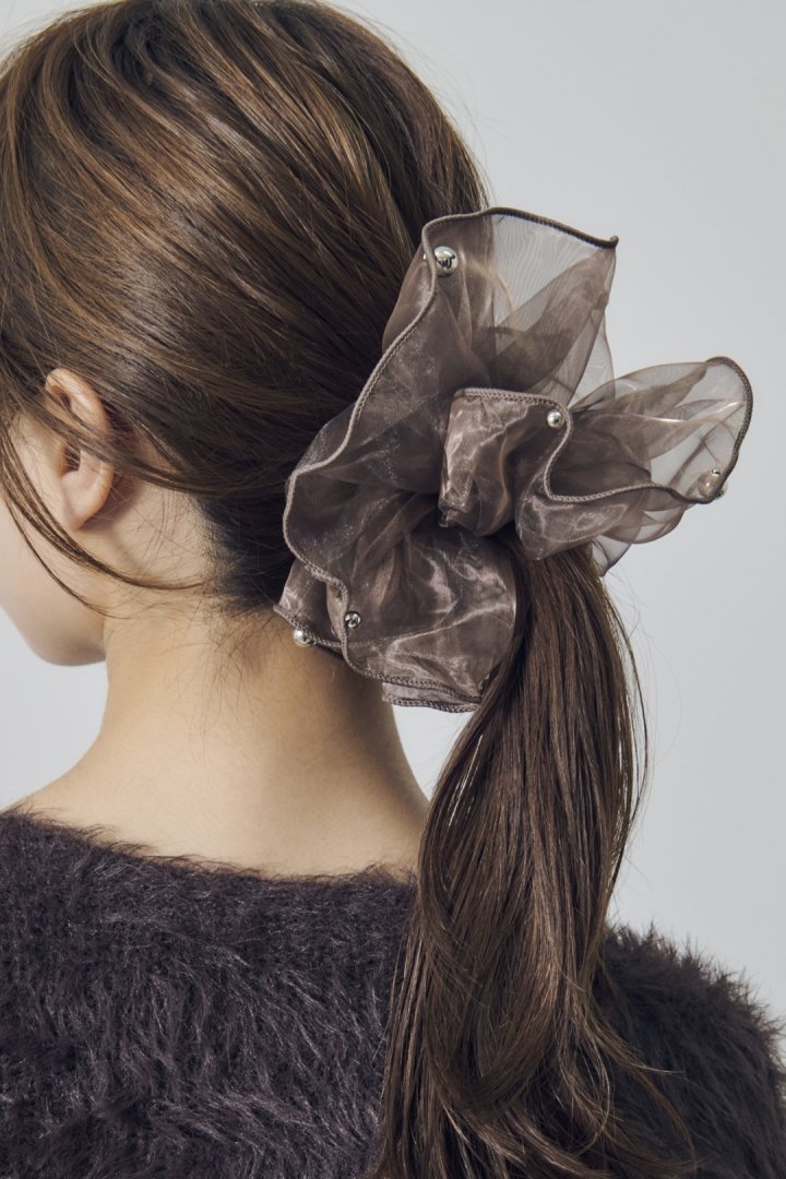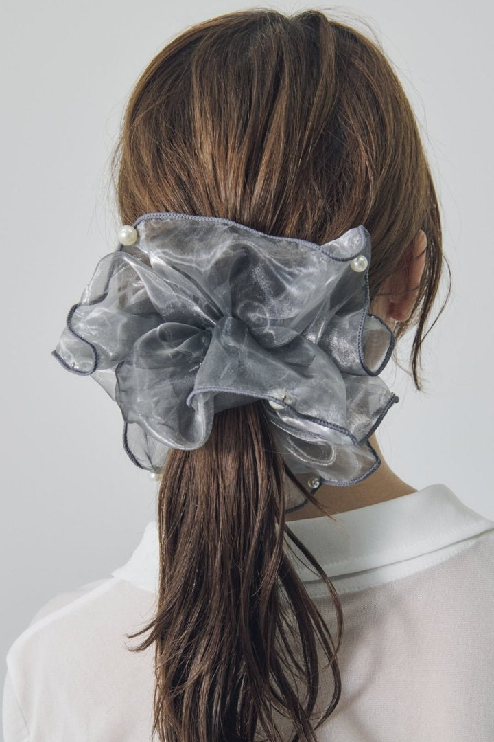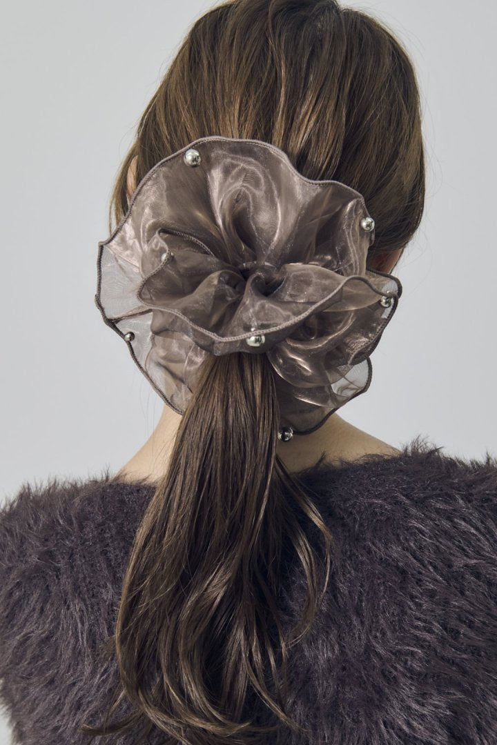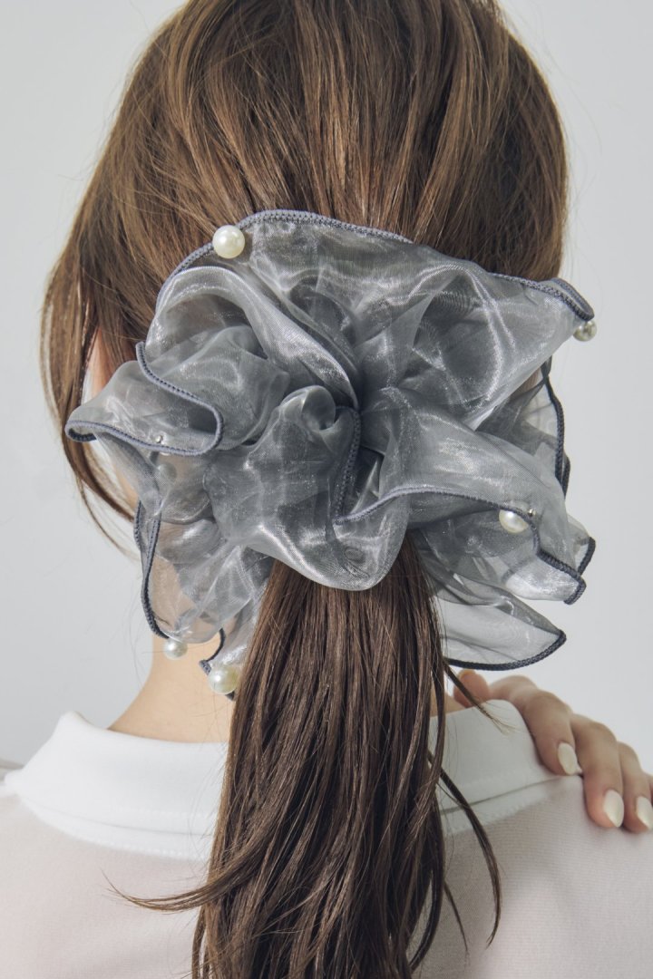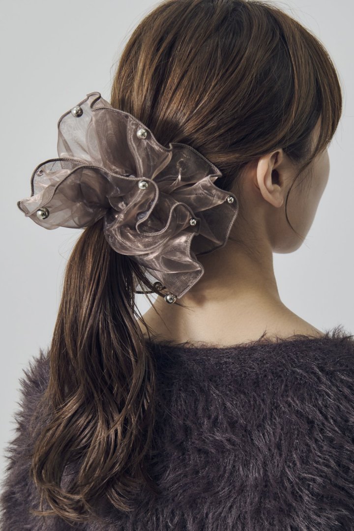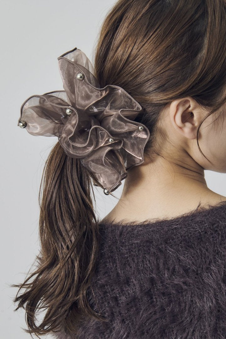 シアー生地のシュシュに、パールやメタルボールが散りばめられたデザイン。