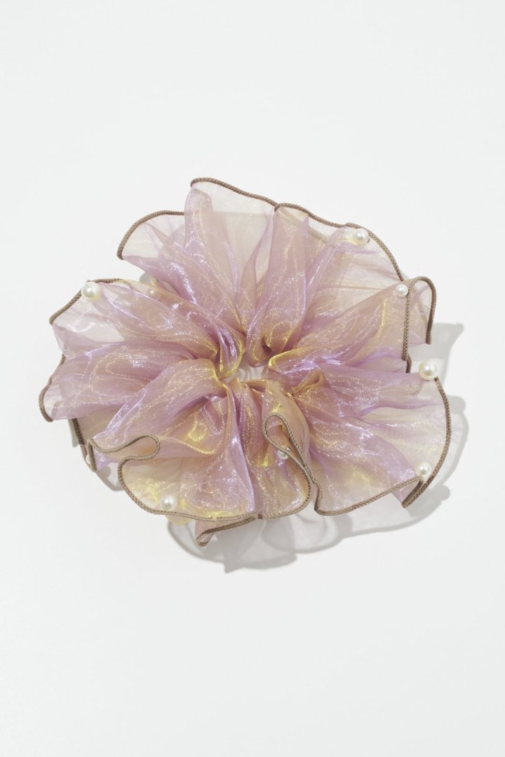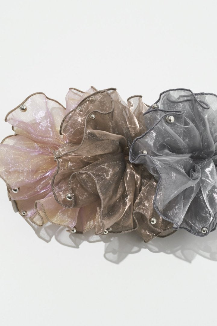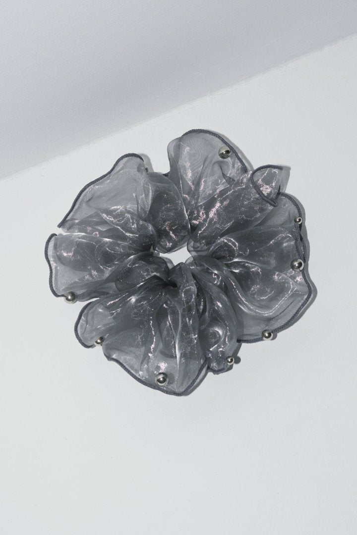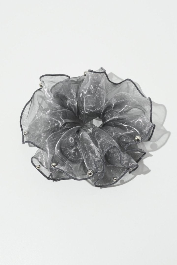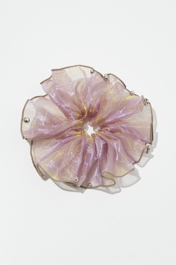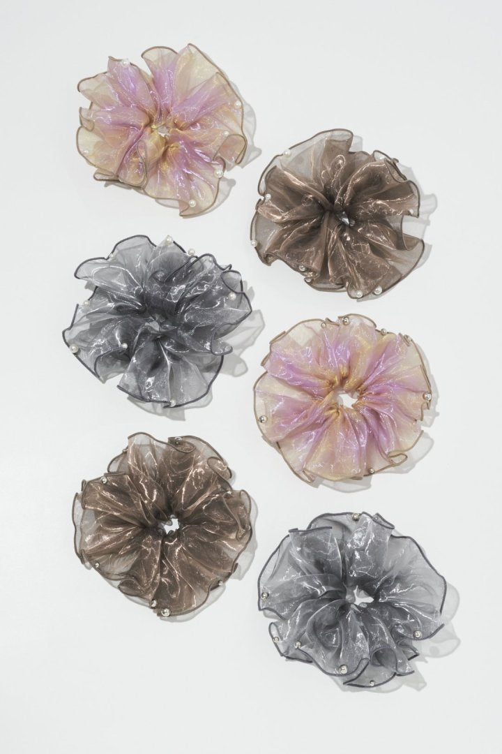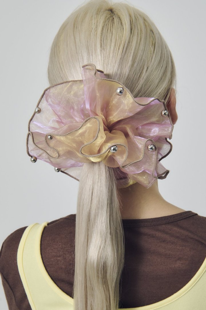 シアー生地のシュシュに、パールやメタルボールが散りばめられたデザイン。