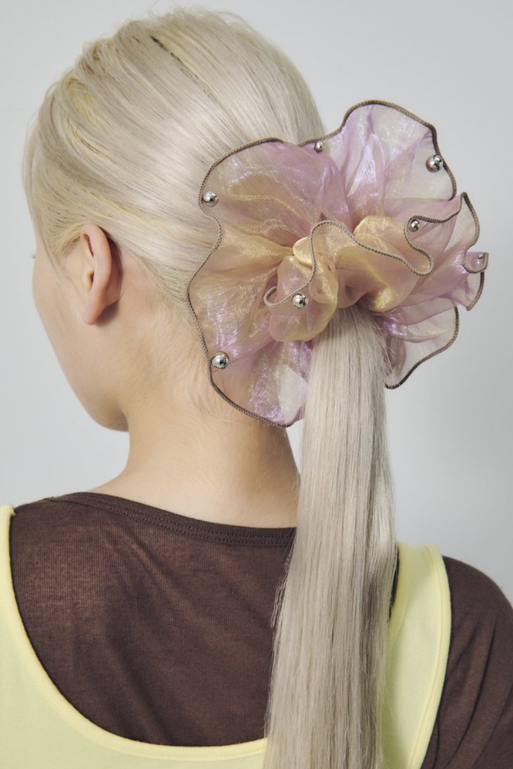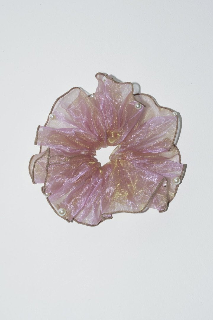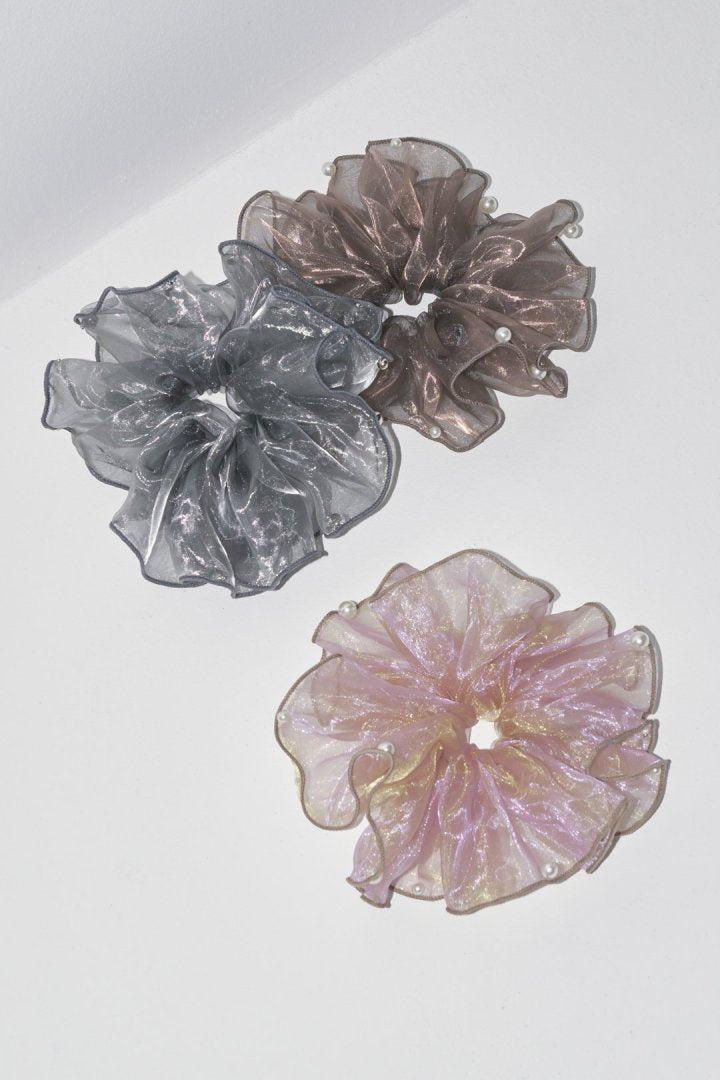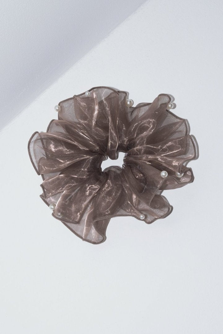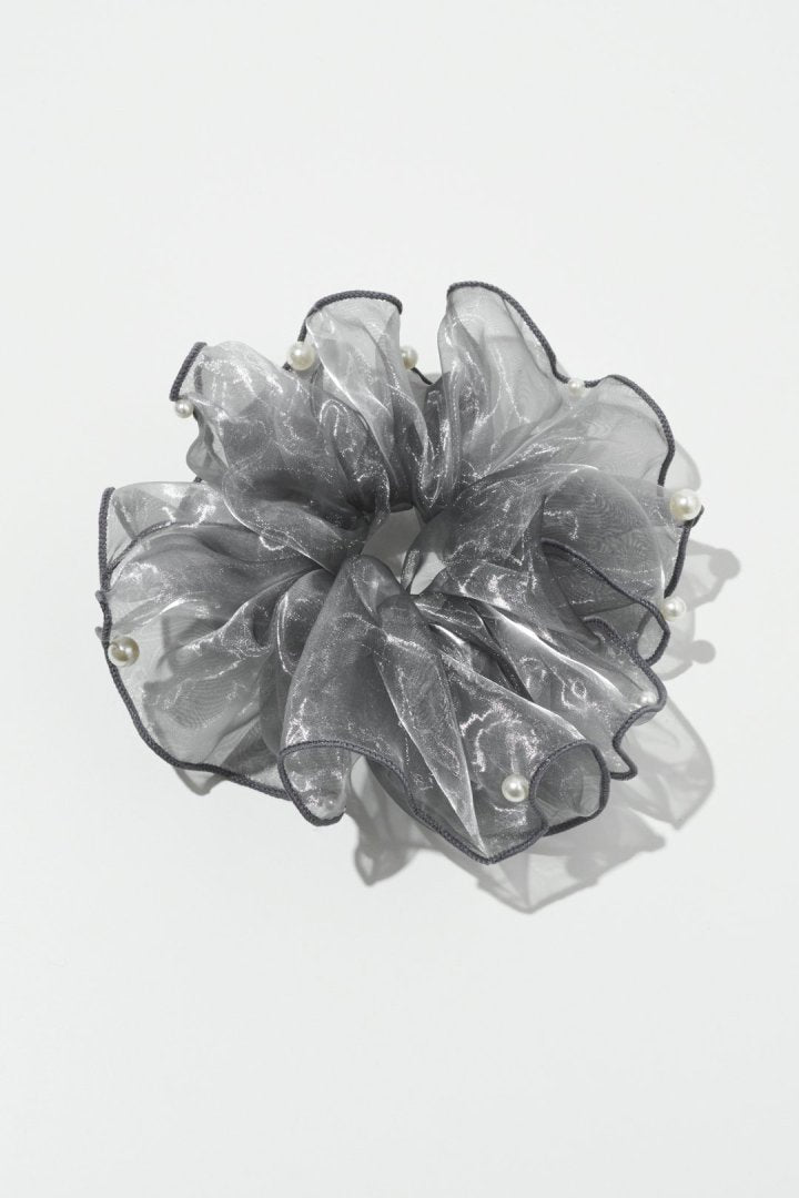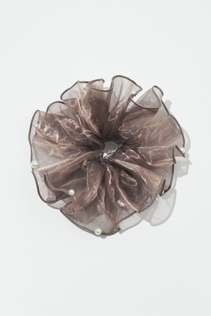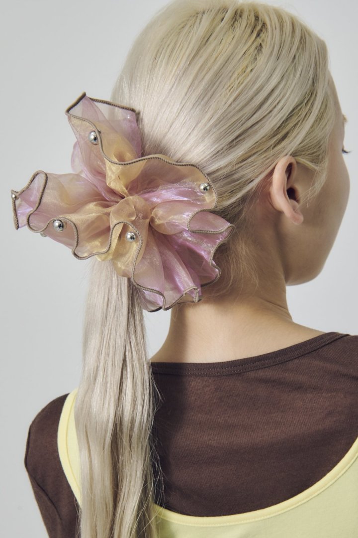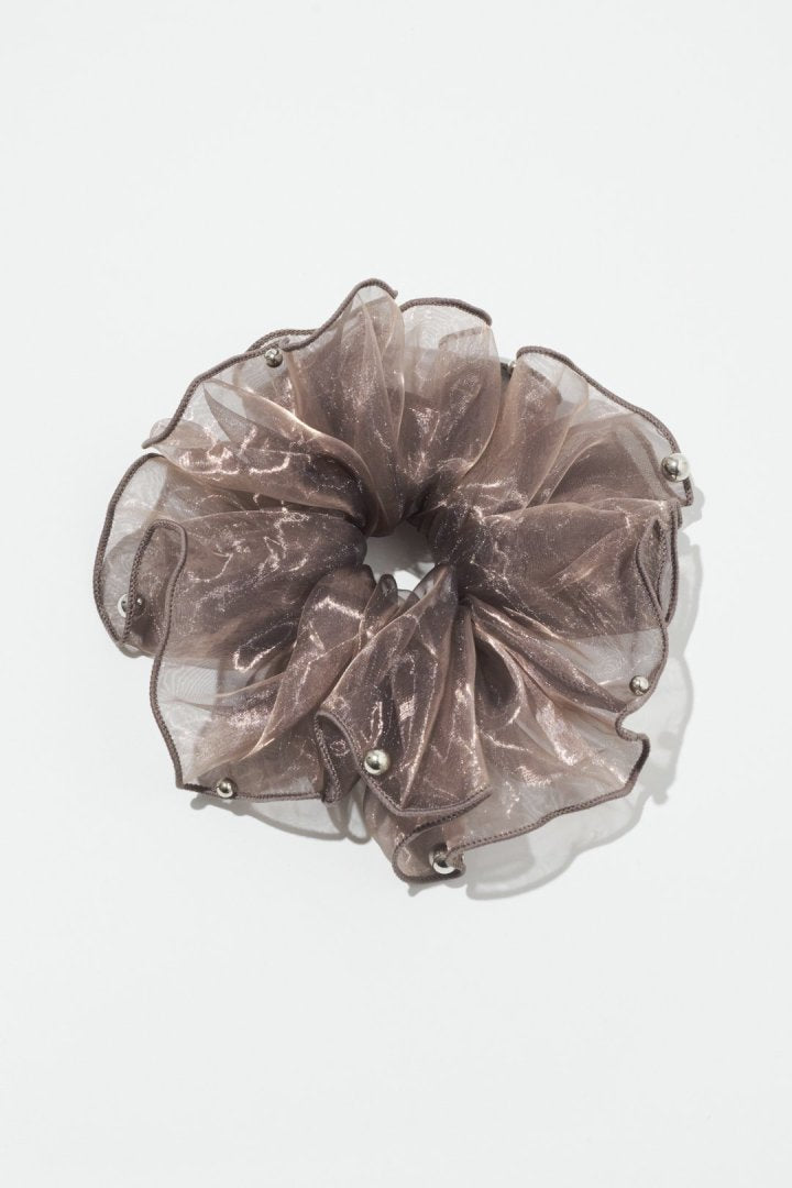 シアー生地のシュシュに、パールやメタルボールが散りばめられたデザイン。