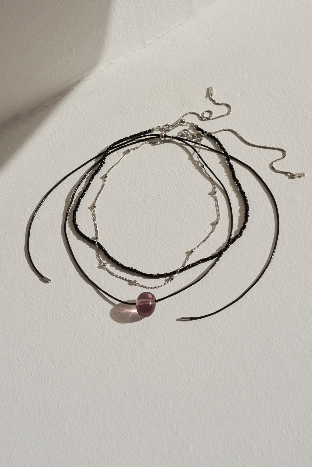 【GOLDYオリジナル】GOLDYオリジナルデザインのネックレス・コード×ビーズ×チェーンネックレスの3本セット・じゃらっとしたレイヤードスタイルがトレンド感◎・スライドビーズでお好みの長さに調節できますカラーパーツがワンポイントになったブラックのコードチョーカー、ガラスビーズネックレス、メタルのチェーンネックレスが3本セットに。