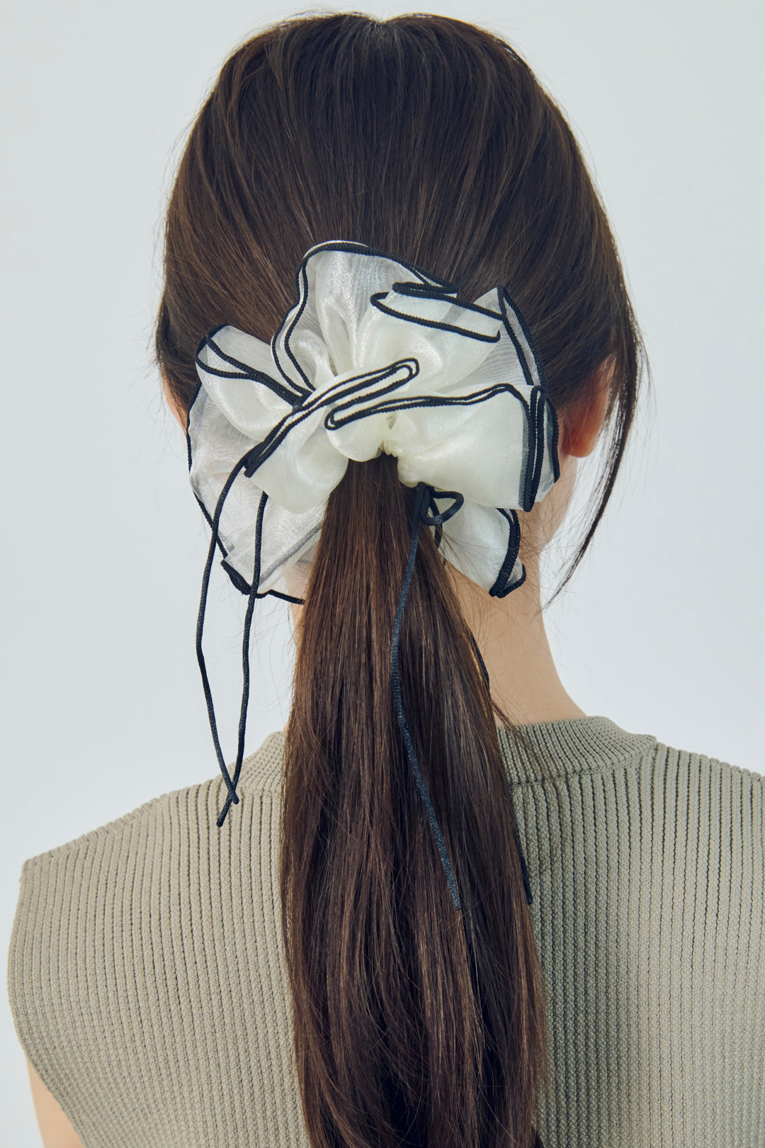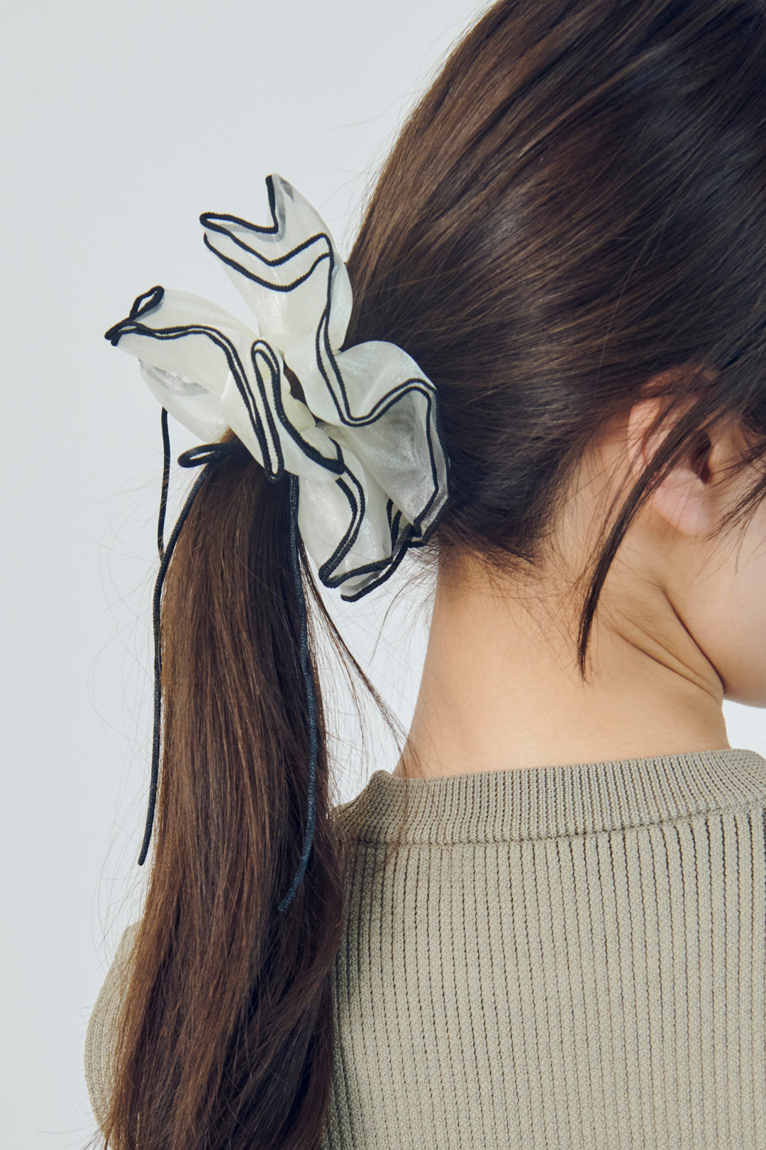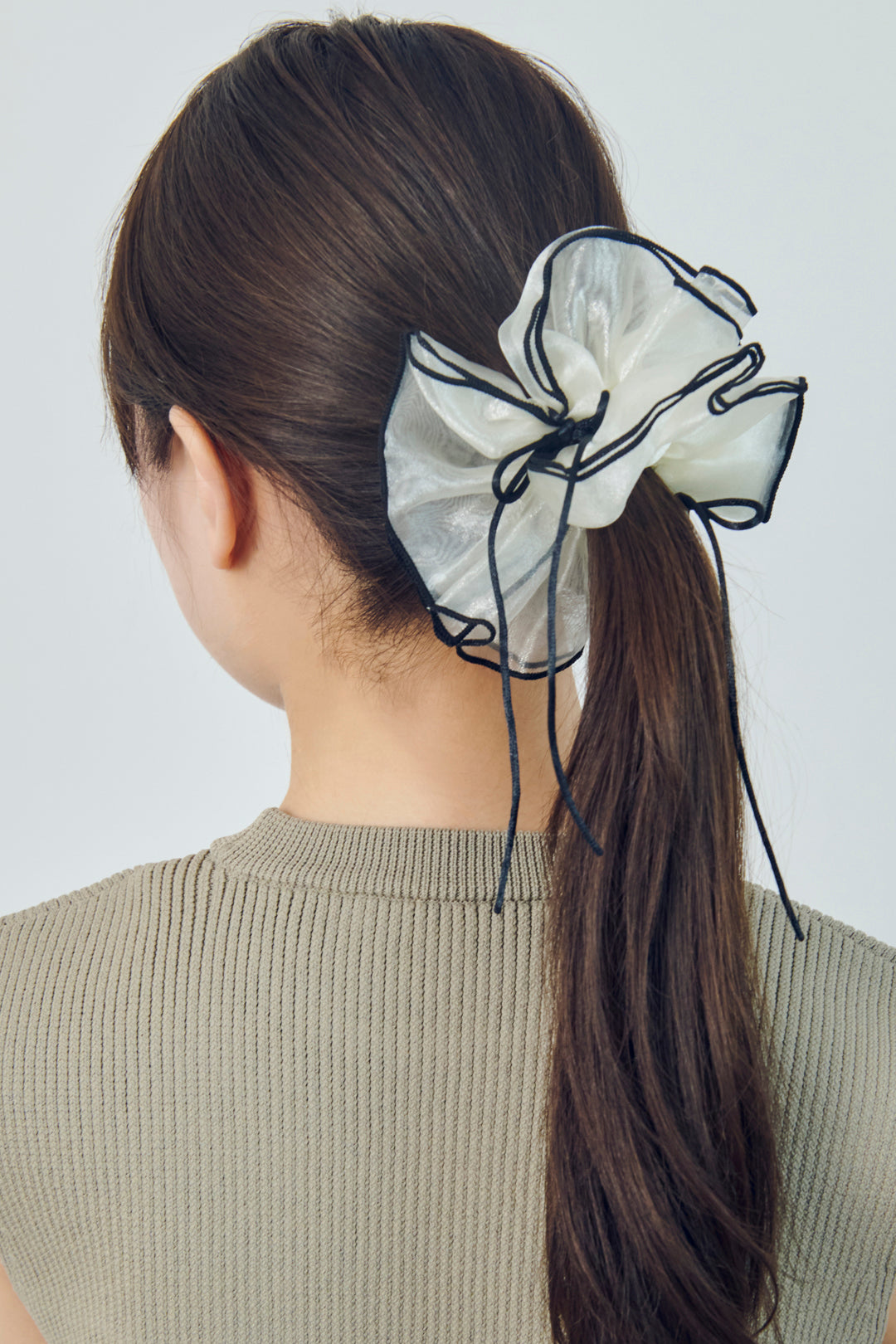 【GOLDYオリジナル】GOLDYオリジナルデザインのシュシュです。透け感のあるボリューミーなシュシュに、華奢なリボンとパイピングのカラーがアクセントになったデザイン。差し色になる"レッド・ベージュ・ブラウン"と、どんなスタイルにも合わせやすい、"オフホワイト・ブラック"の計5色をご用意いたしました。つけるだけでトレンド感があり、大人可愛く今らしいヘアアレンジをお楽しみいただけます。
