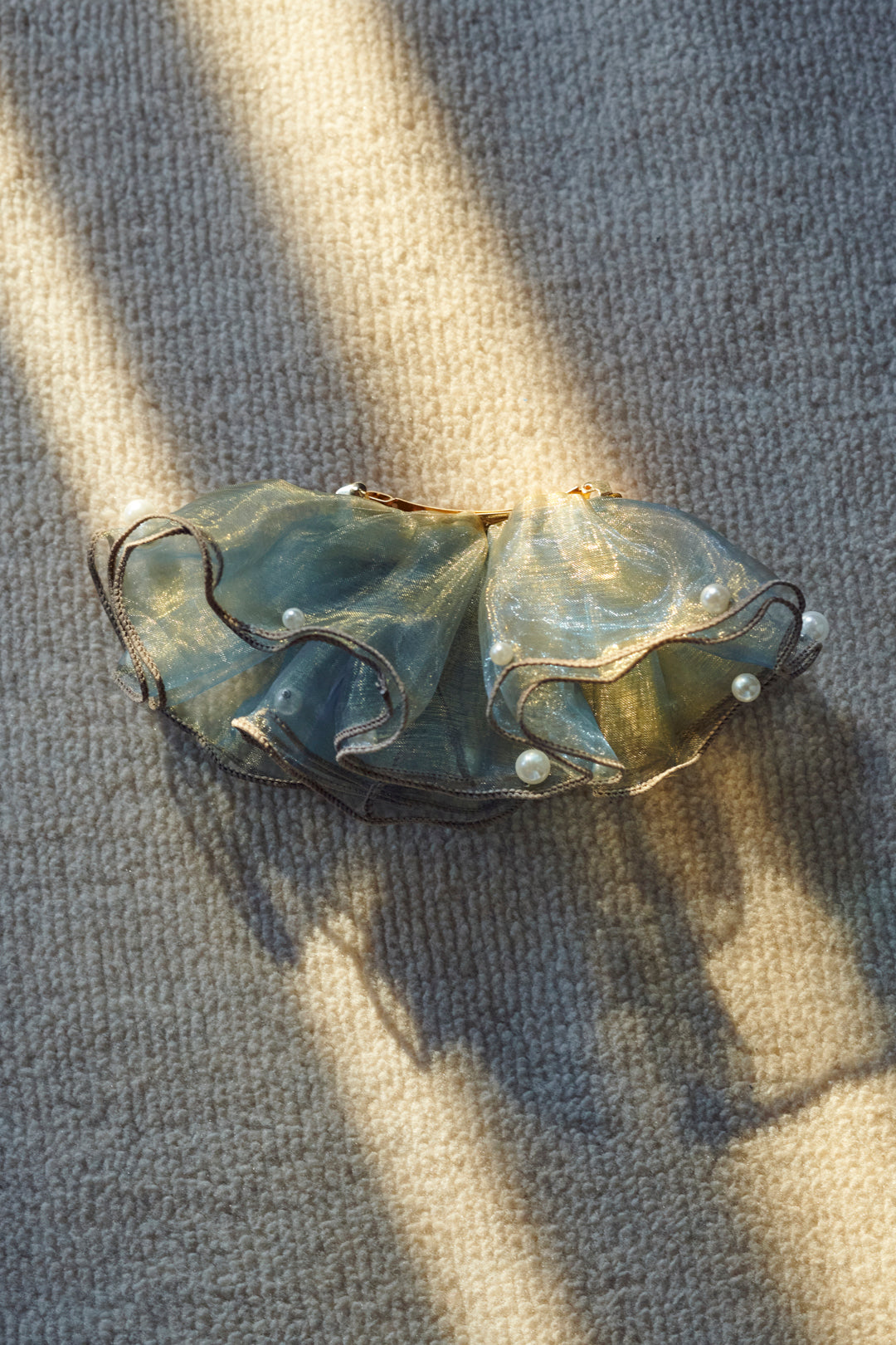 シアー生地のフリルに、パールやメタルボールが散りばめられたデザイン。