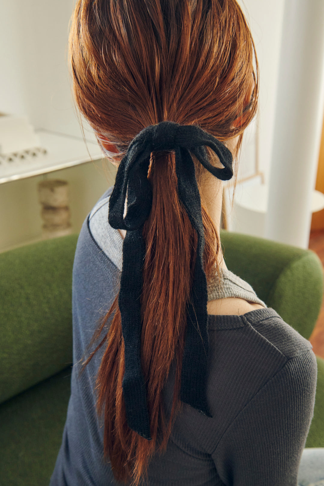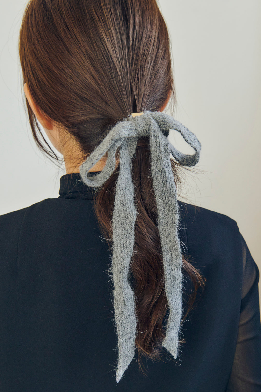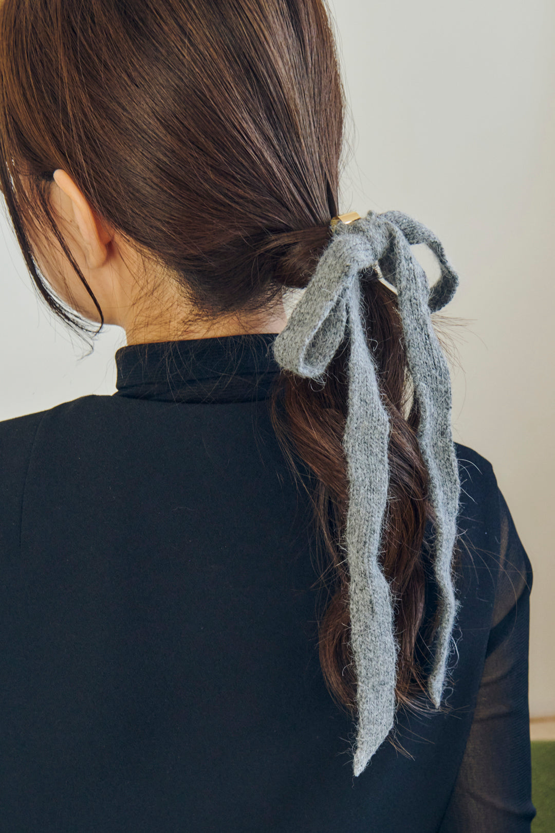 ニット素材のリボンをヘアカフに仕上げたデザイン。首元で揺れるリボンが女性らしさを演出します。