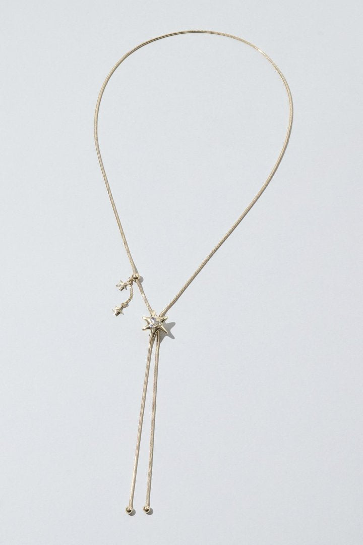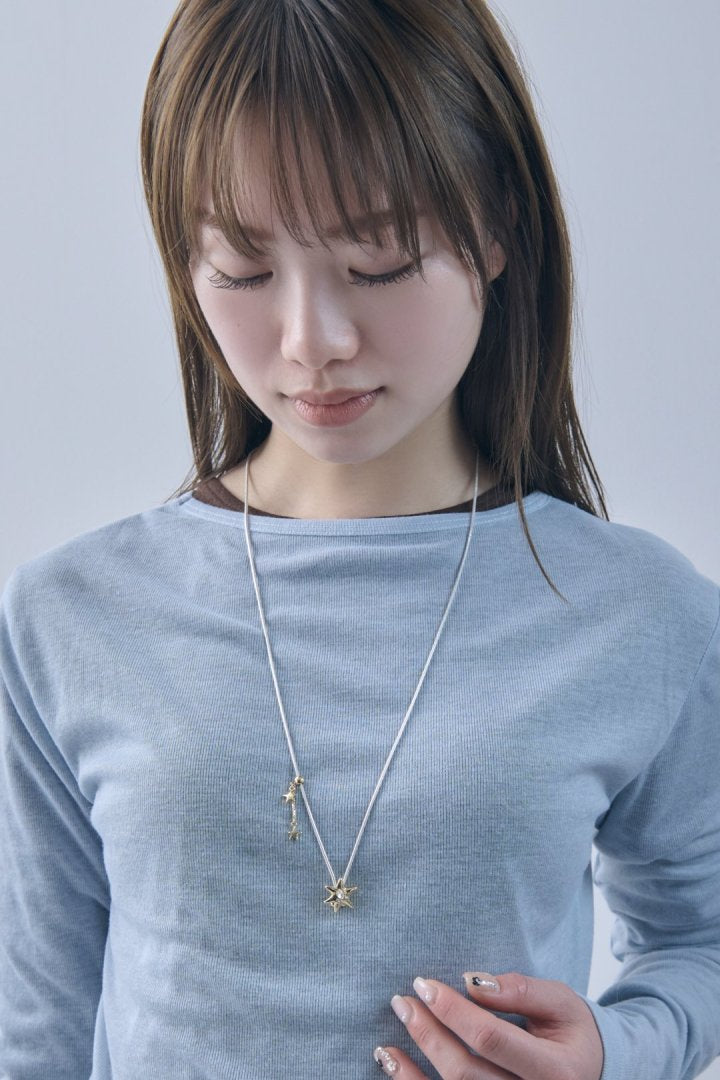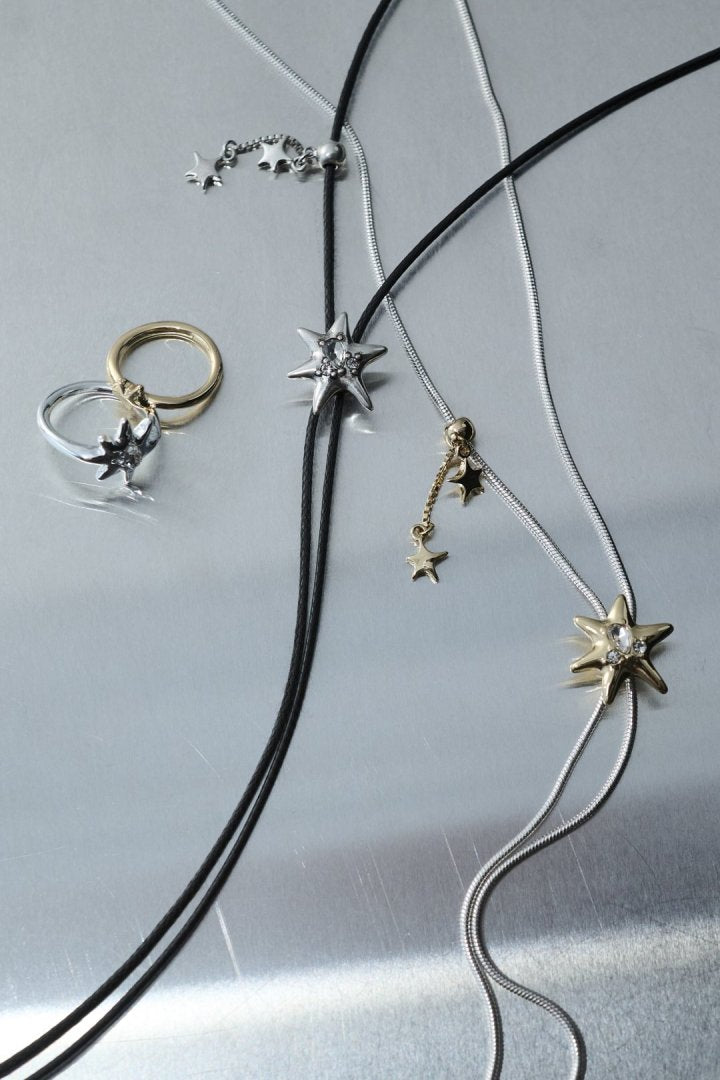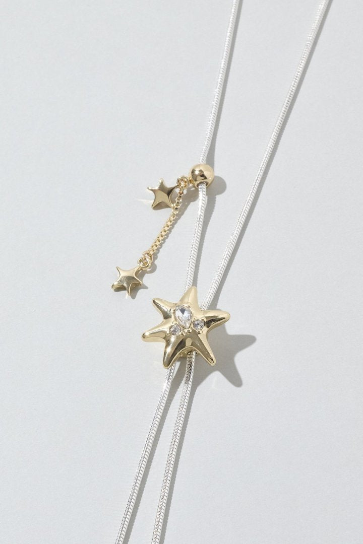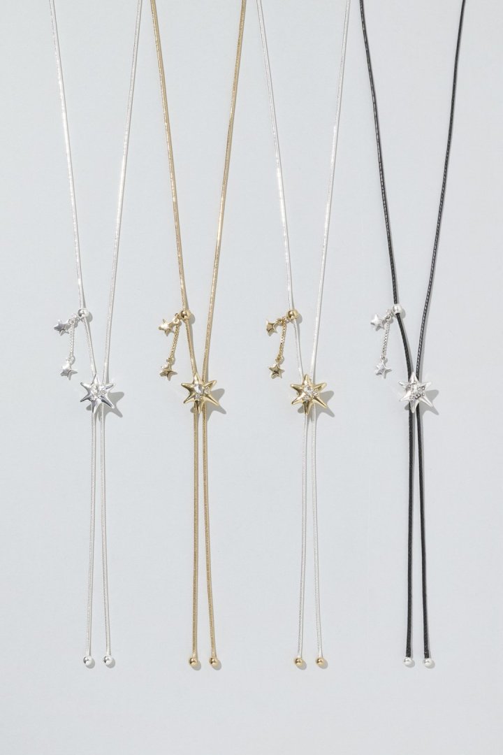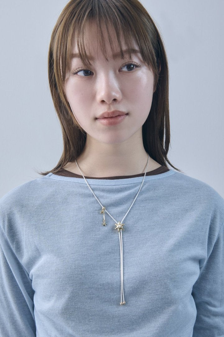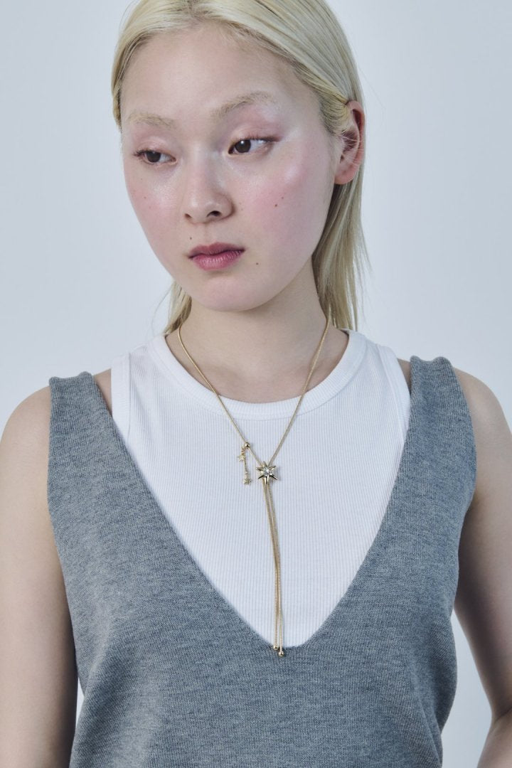【GOLDYオリジナル】GOLDYオリジナルデザインのネックレス・ループタイ調のY字シルエット・エッジの効いたモチーフがポイント・モチーフの位置はスライドして調節できます◎ビジューがアクセントになったキラキラモチーフや、星のチャームを組み合わせたループタイ調のネックレス。モチーフはスライドビーズ仕様なので、その日のトップスに合わせて位置を調節したり、ロングネックレスにシルエットを変えたり…と、マルチなスタイリングを楽しめるアイテムです。〇 同シリーズ リング:5260402※お使いのモニター環境により、実際の色味と異なって見える場合がございます。※こちらの商品は、色味に多少の個体差がございます。メッキ製品の特性として、予めご了承くださいませ。