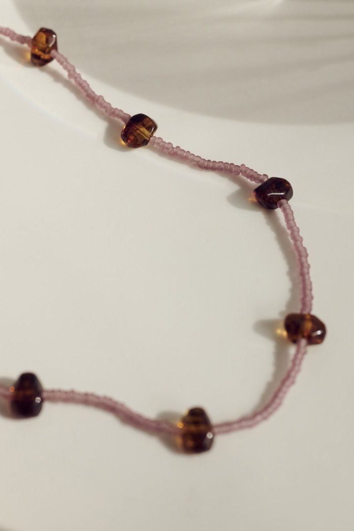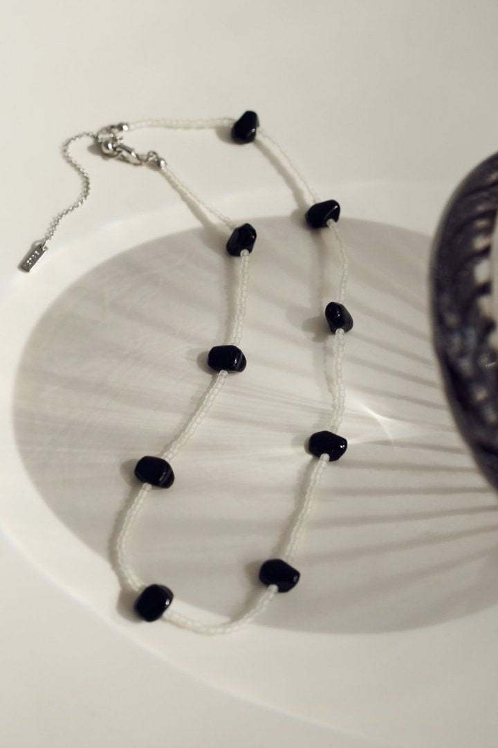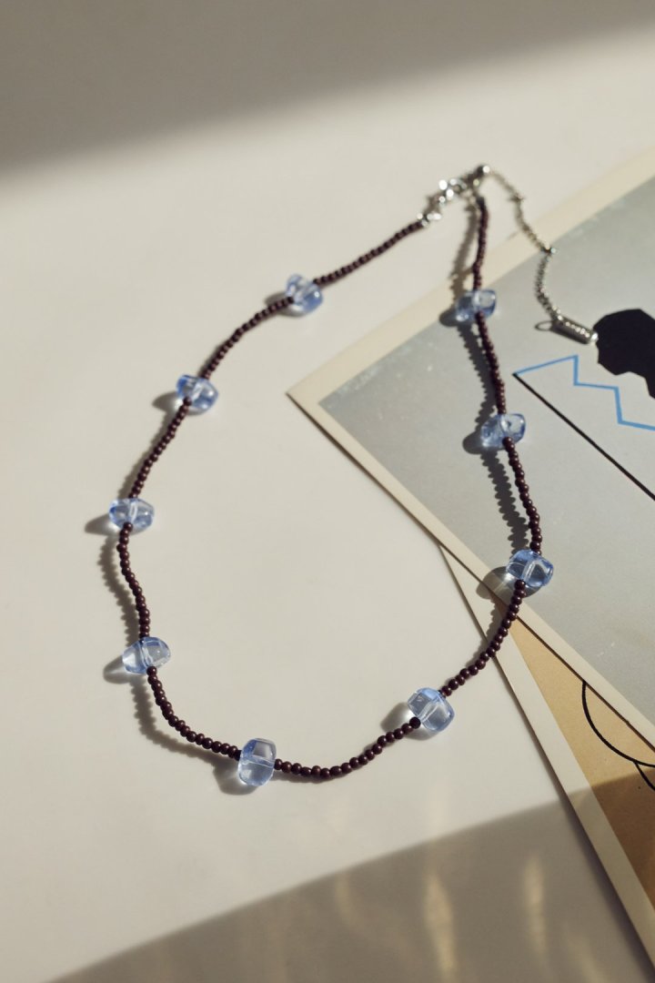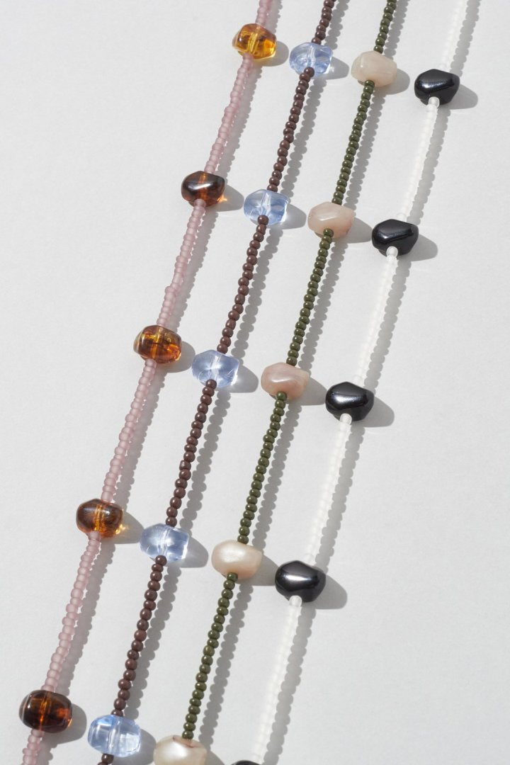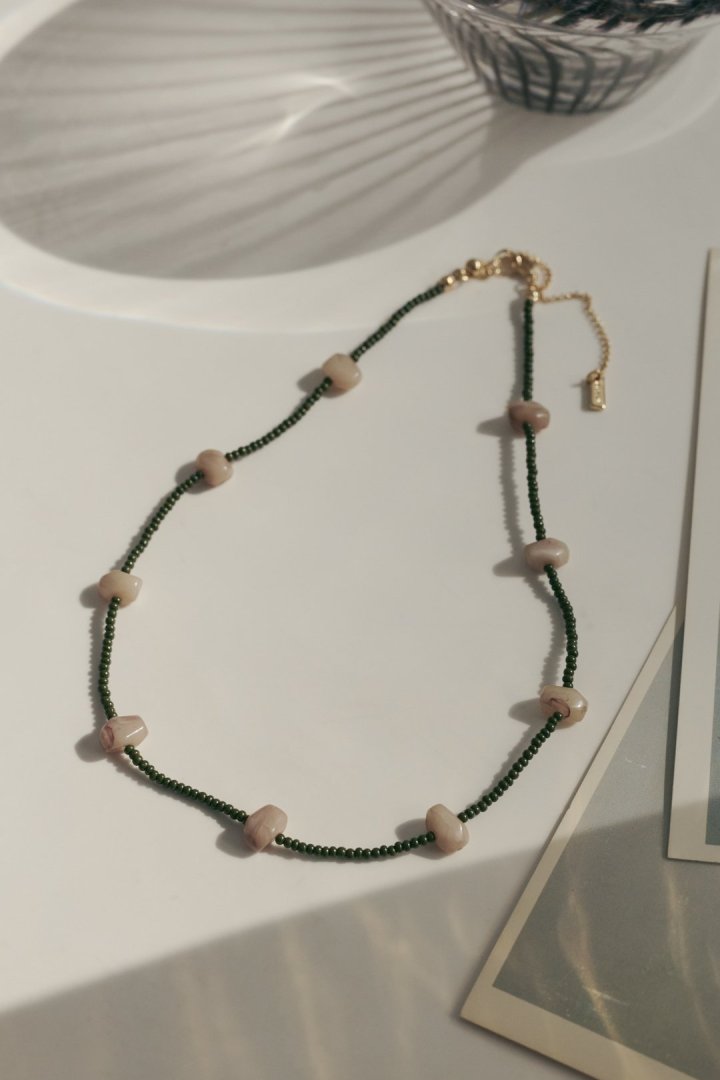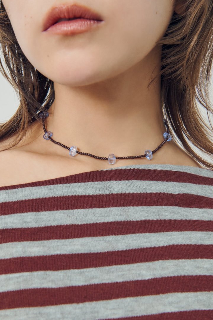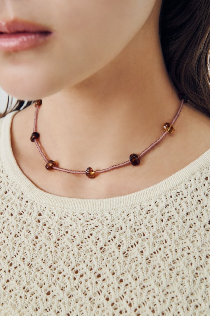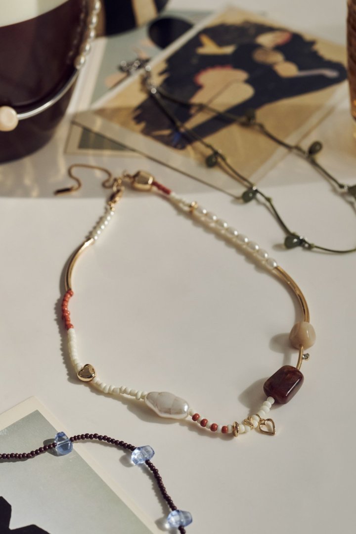 サイズやカラーの異なるビーズを交互にあしらったネックレス。