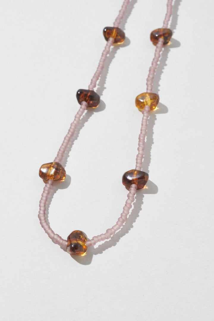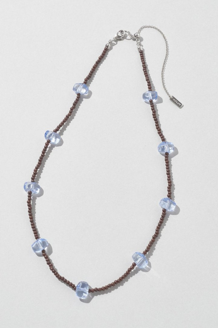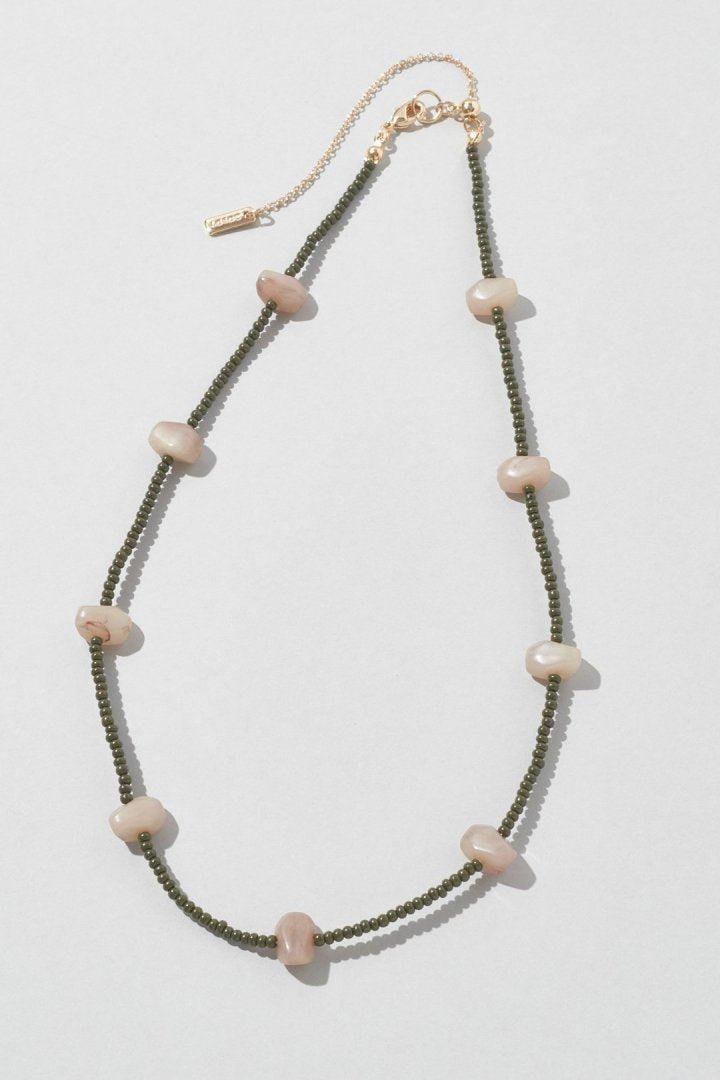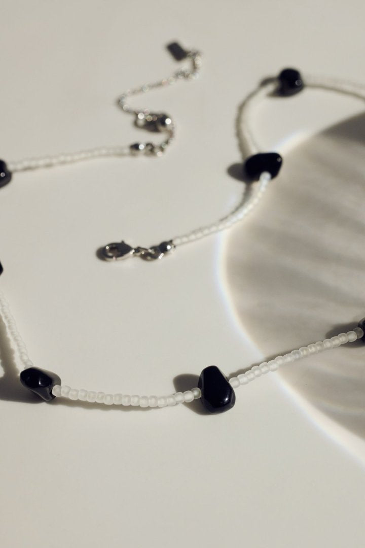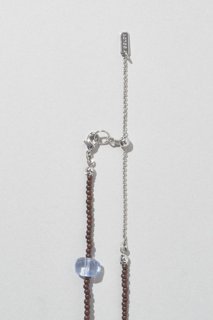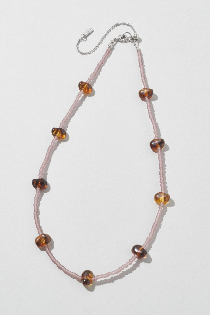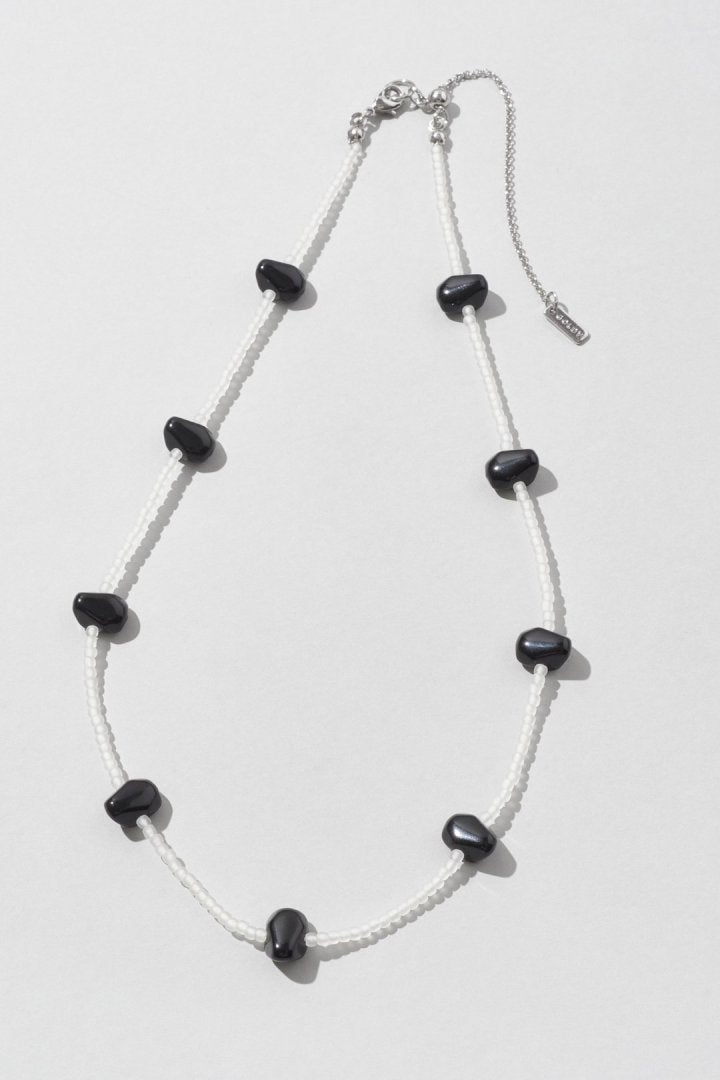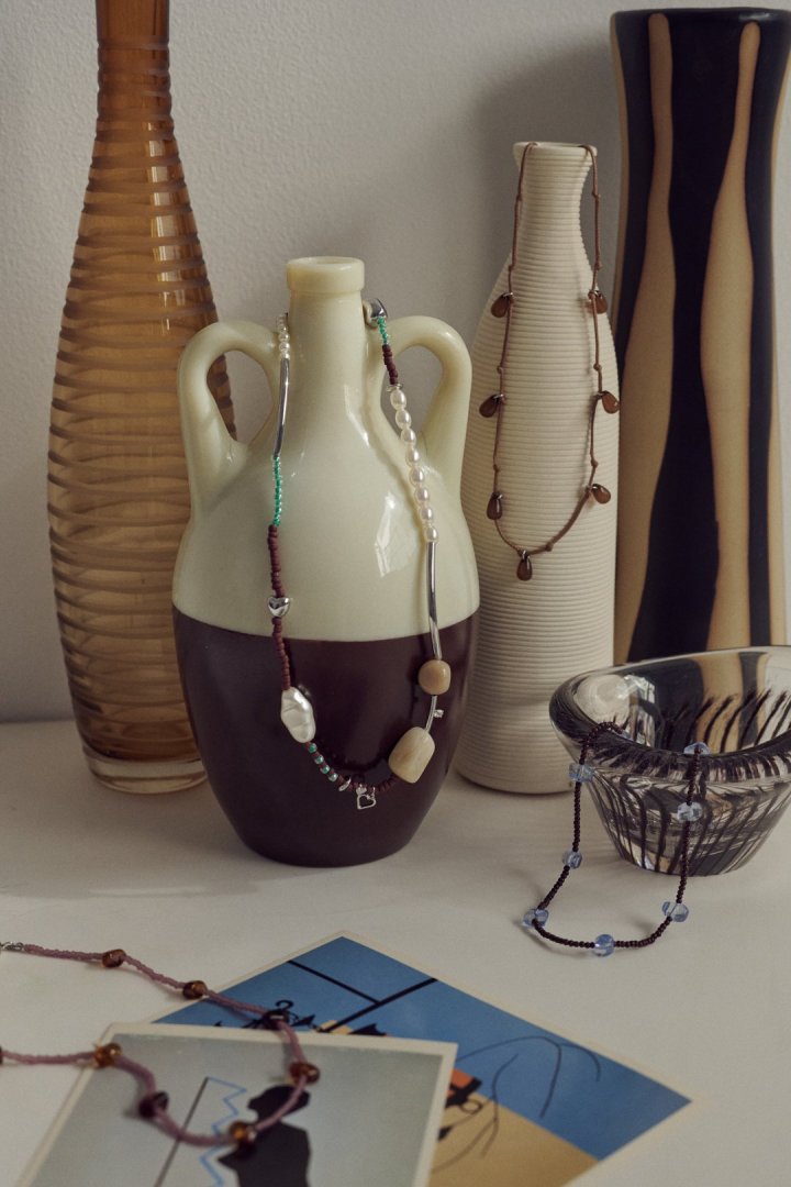 サイズやカラーの異なるビーズを交互にあしらったネックレス。