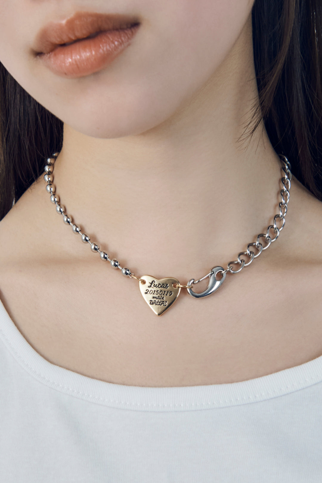 【GOLDYオリジナル】GOLDYオリジナルデザインのネックレス・刻印入りのハートモチーフがポイント・2種類のチェーンを組み合わせたアシンメトリーデザイン・程よいボリューム感で首元のアクセントに『ダラスに住む犬“ルーカス”』のドッグタグをイメージした遊び心のあるチャームと、フックモチーフをチェーンに組み合わせたデザイン。
