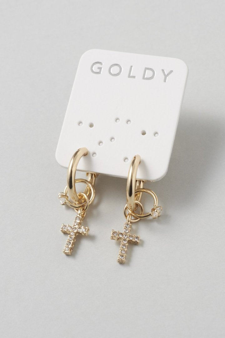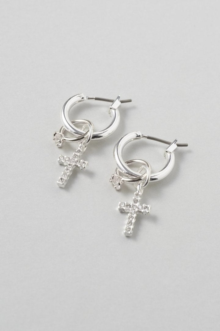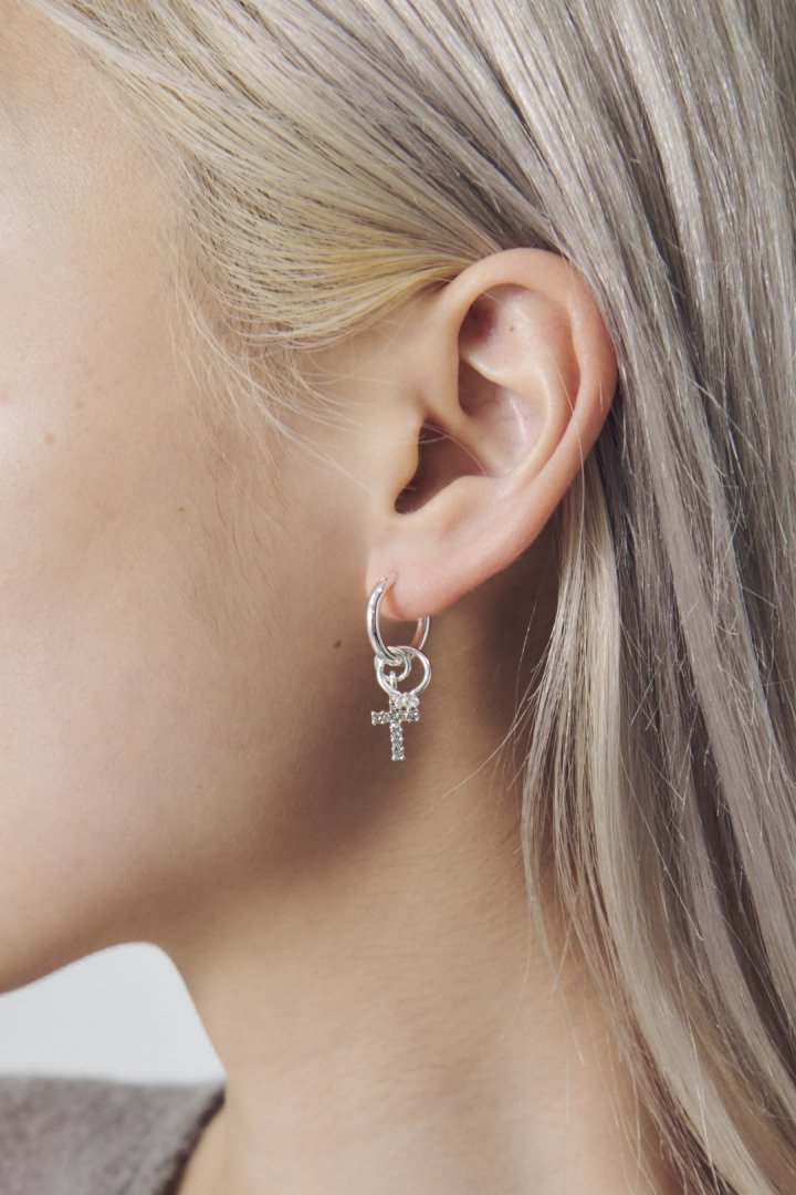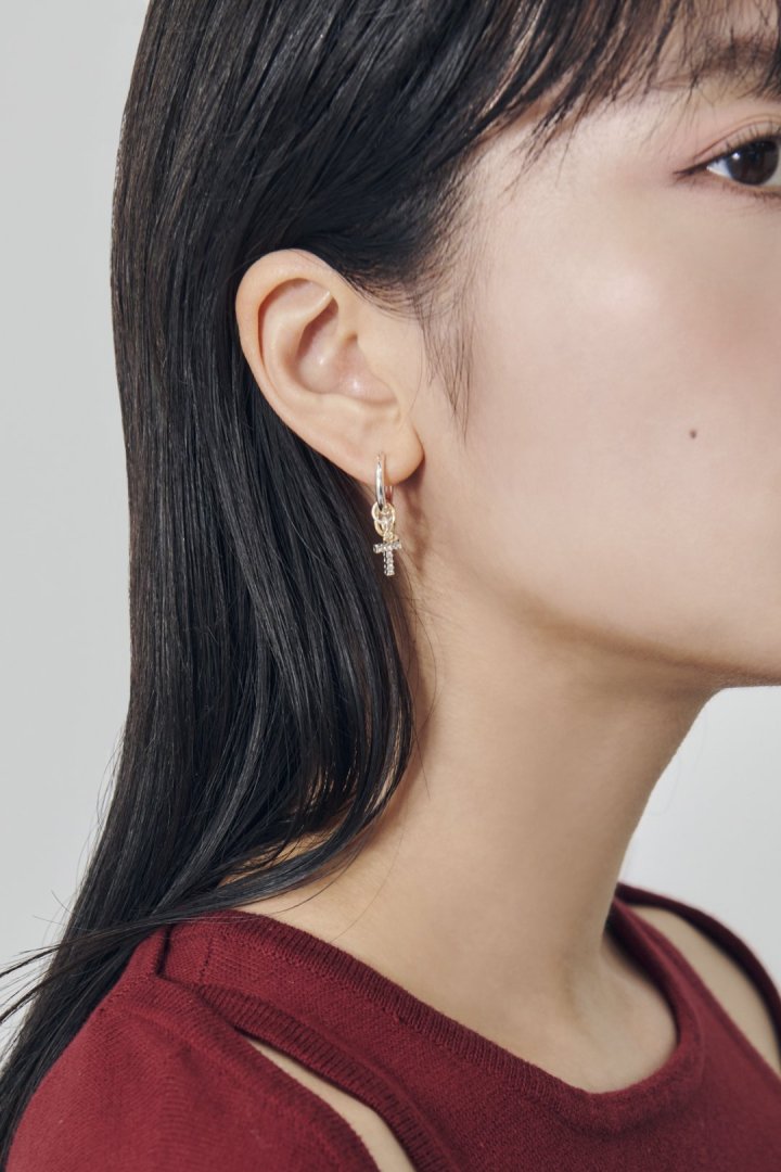 クロスモチーフとキュービックジルコニアのチャームをフープに通して組み合わせた、シンプルでトレンド感のあるデザイン。