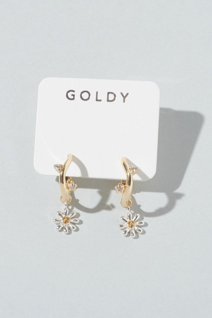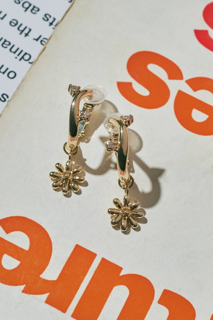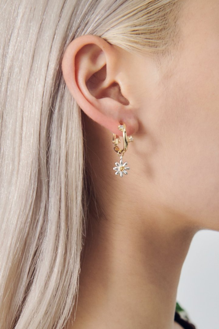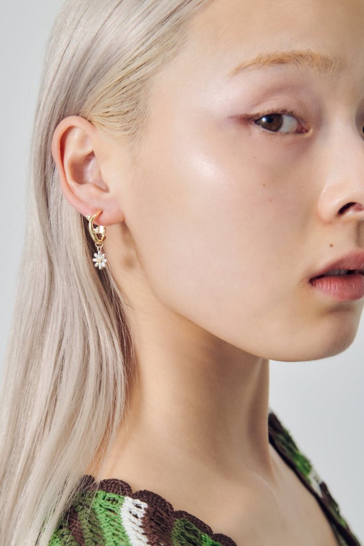キュービックジルコニアがあしらわれたフープイヤリングに、フラワーモチーフのチャームを組み合わせたデザイン。