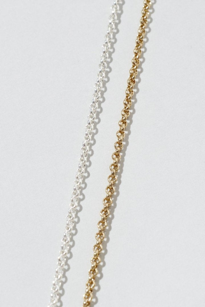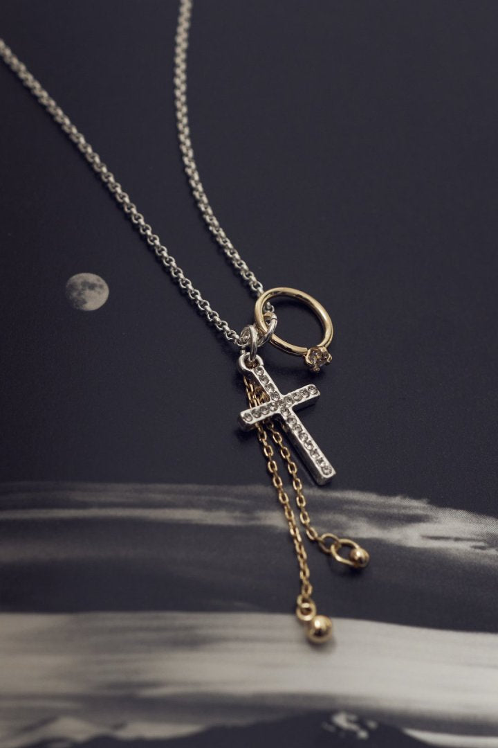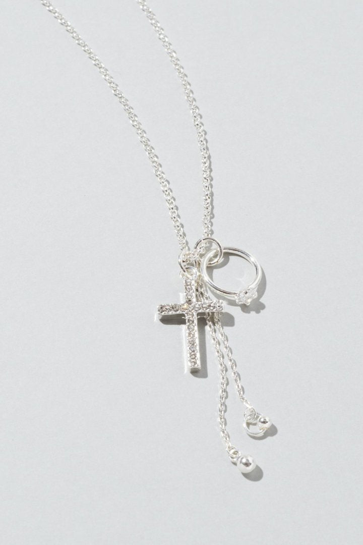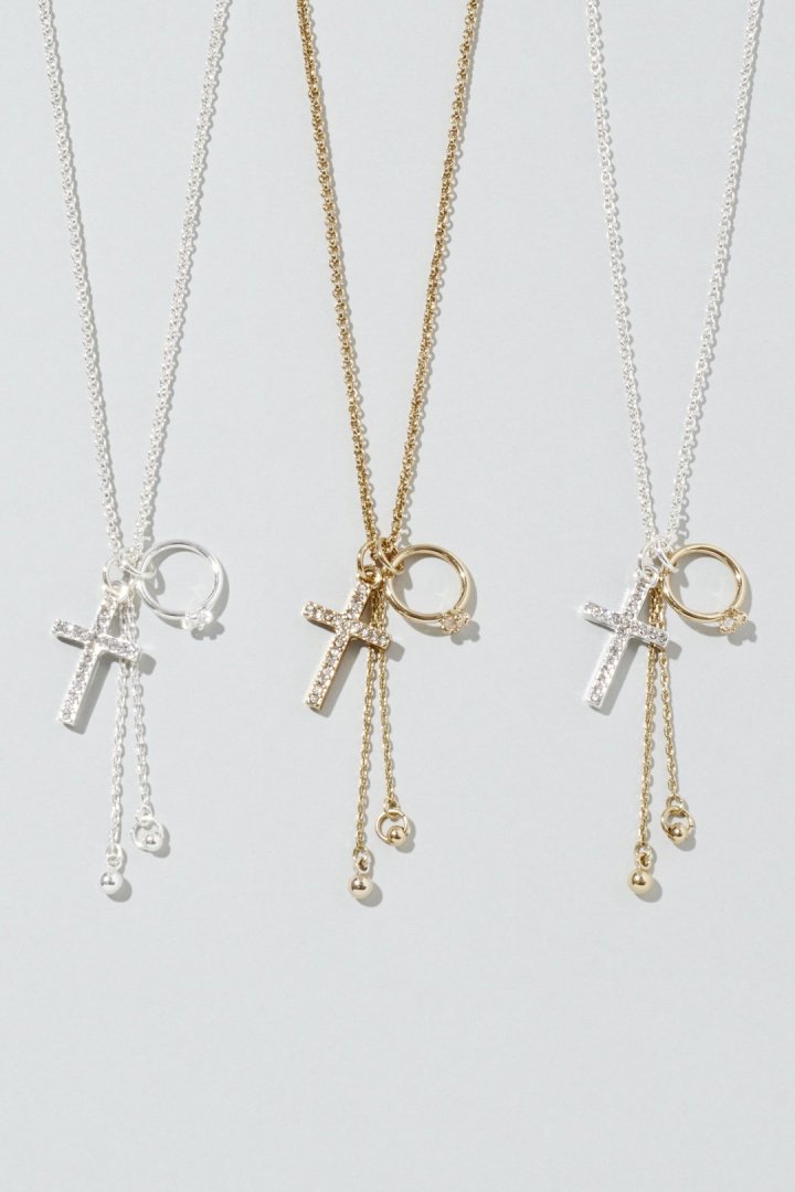 華奢なチェーンネックレスに、クロスモチーフやキュービックジルコニアなどのチャームをあしらったデザイン。