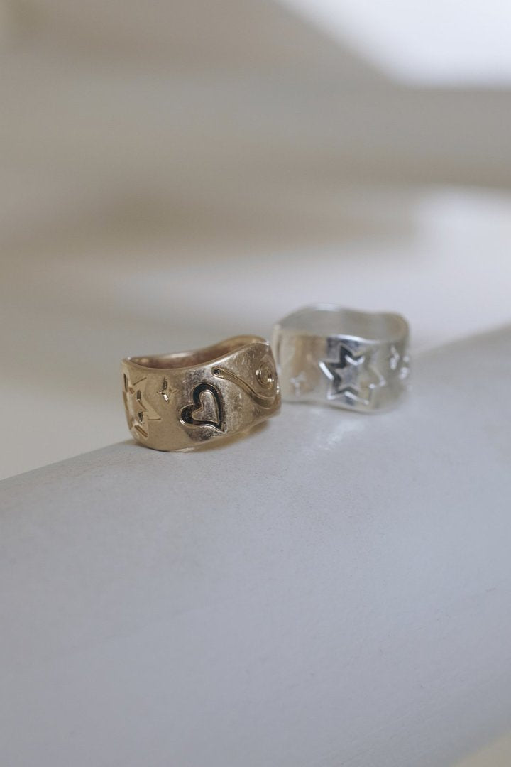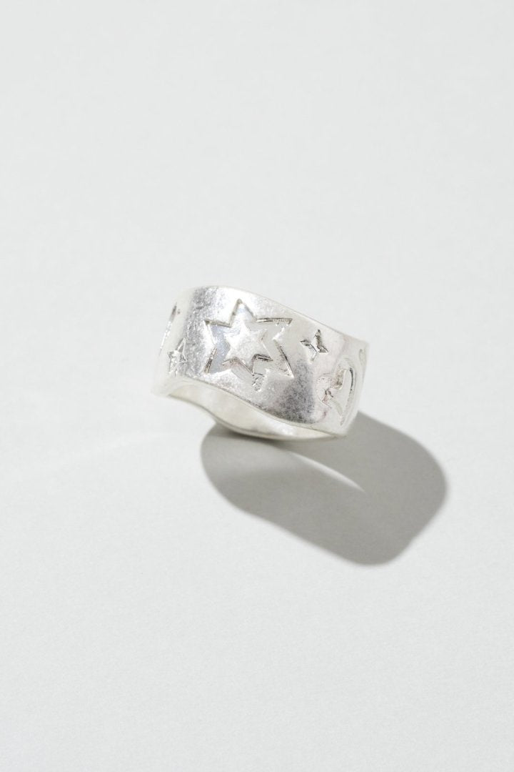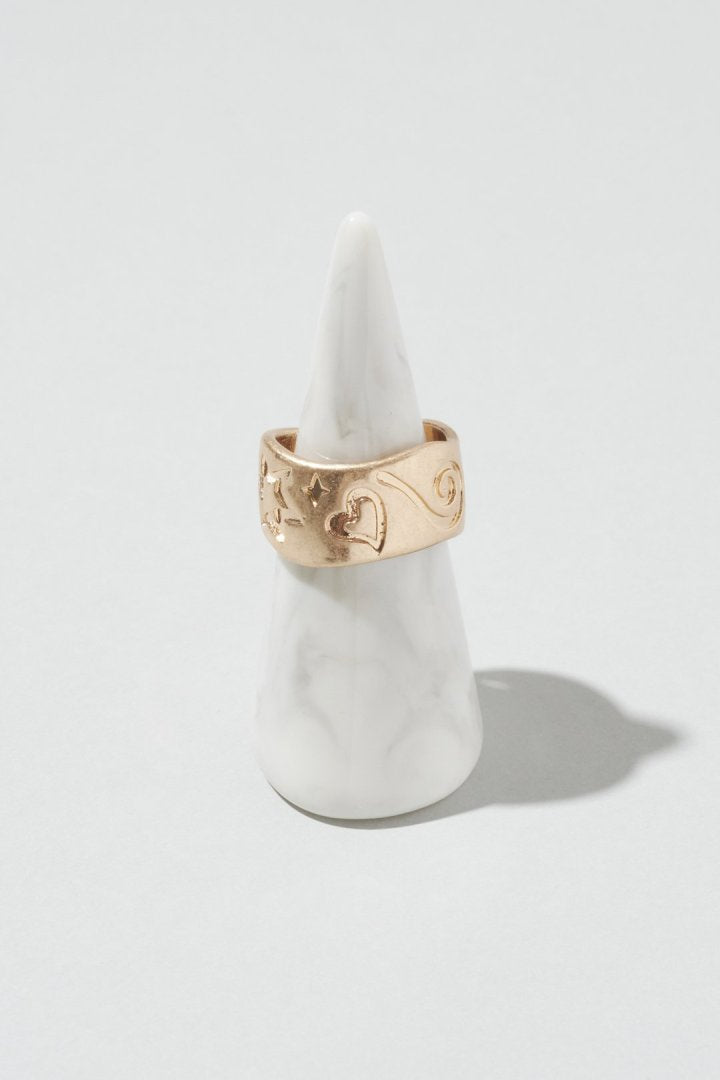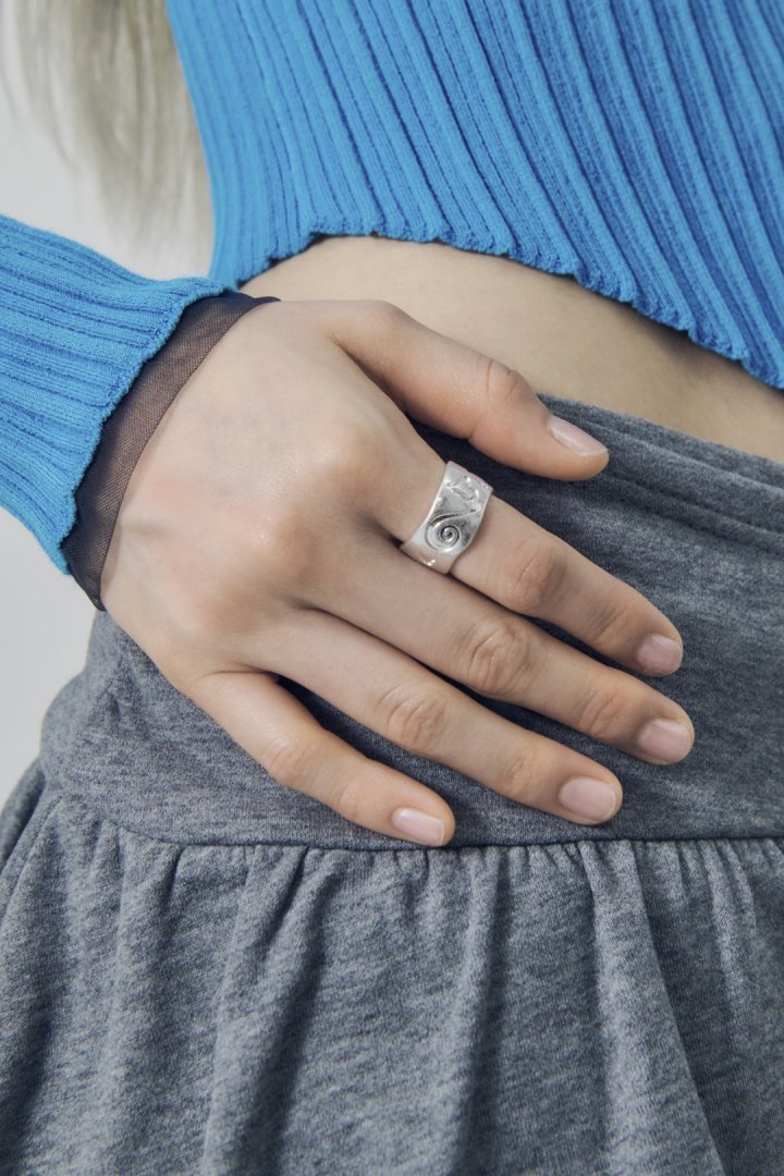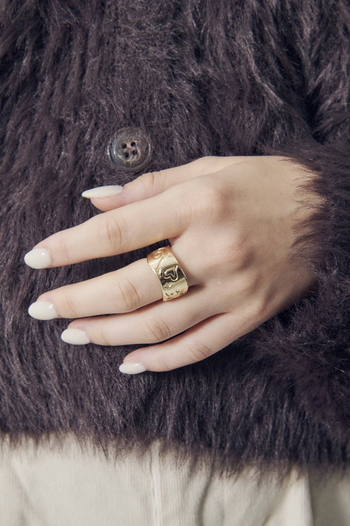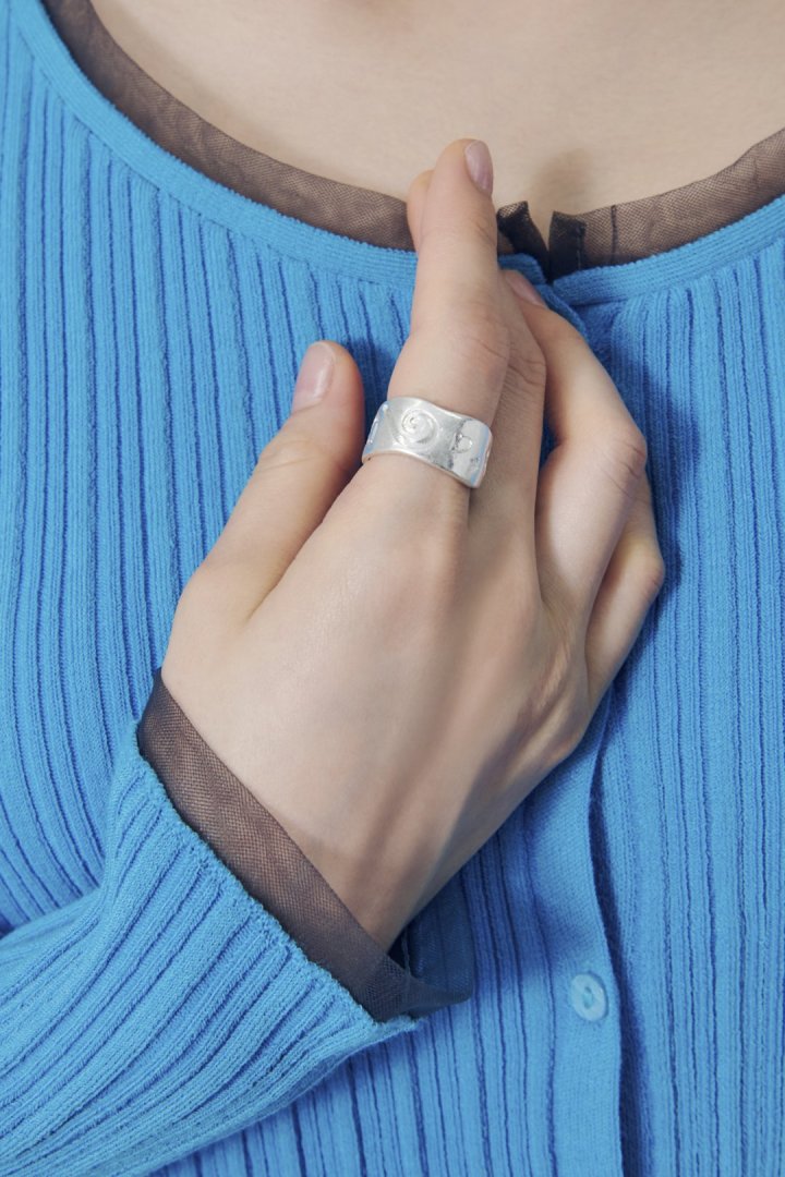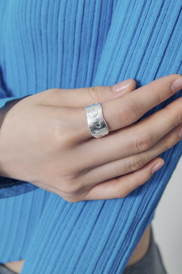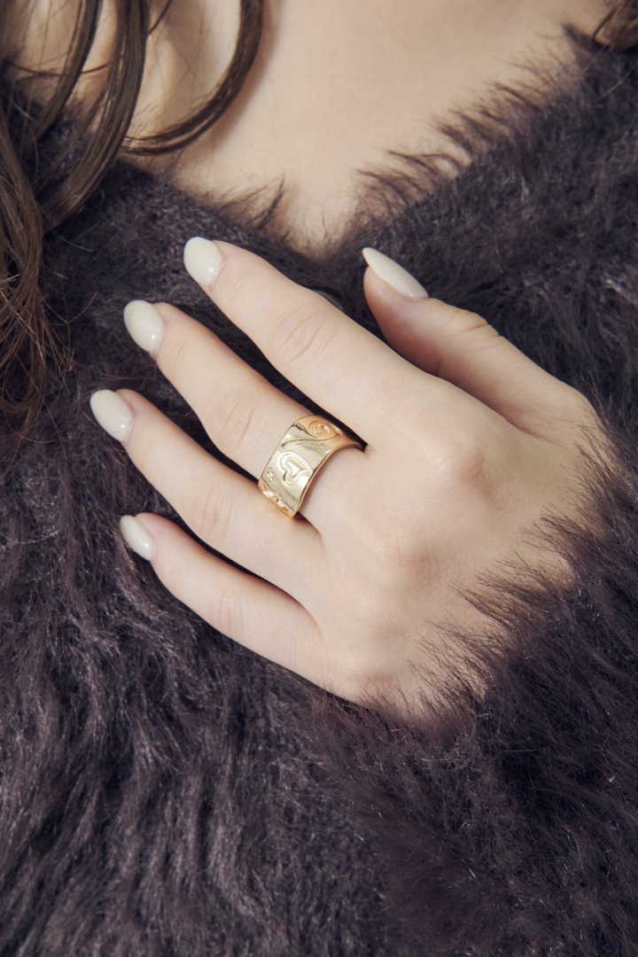 ニュアンス感のあるワイドなフォルムと、凹凸で描かれたモチーフが印象的なリング。
