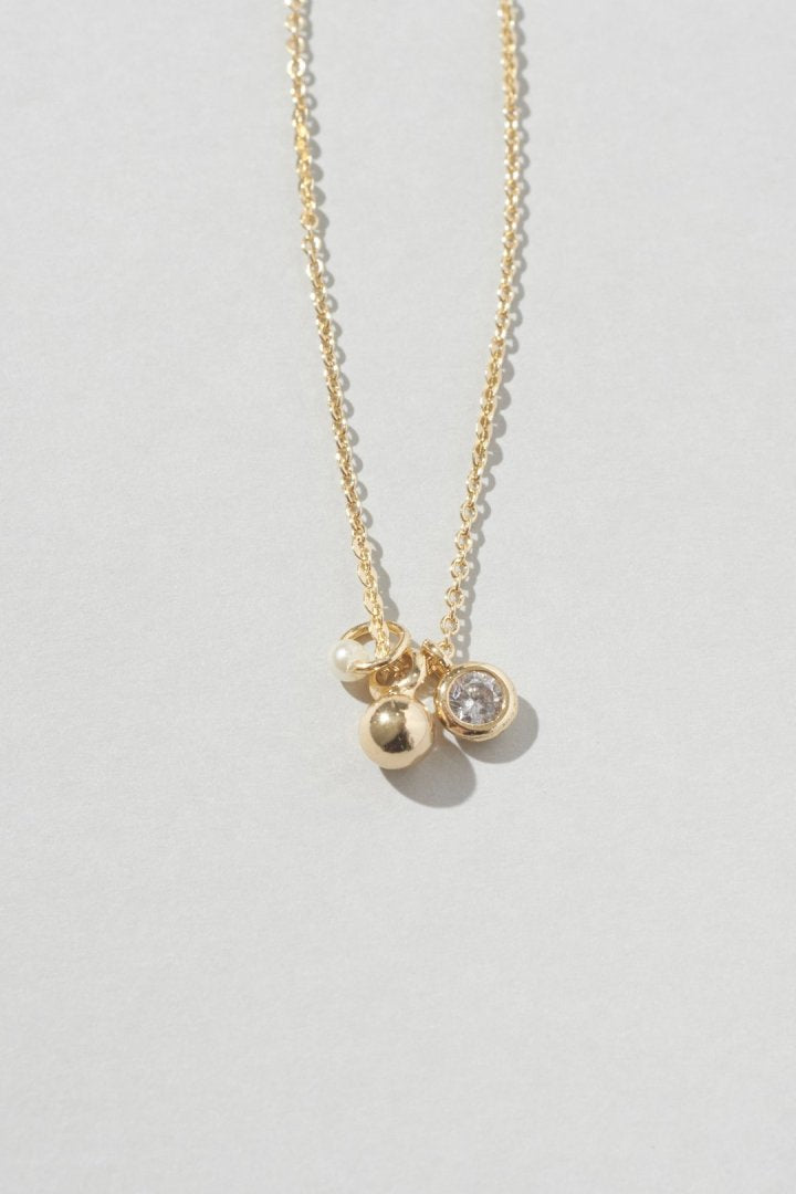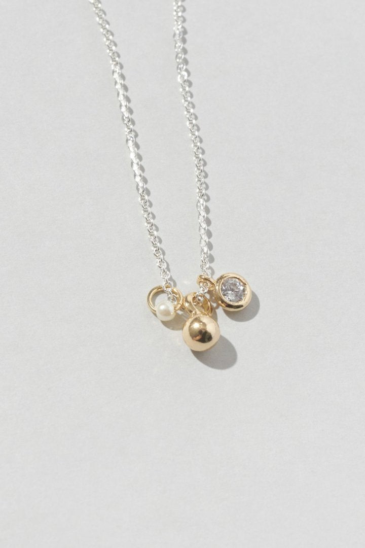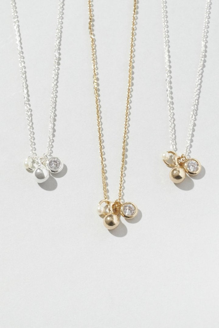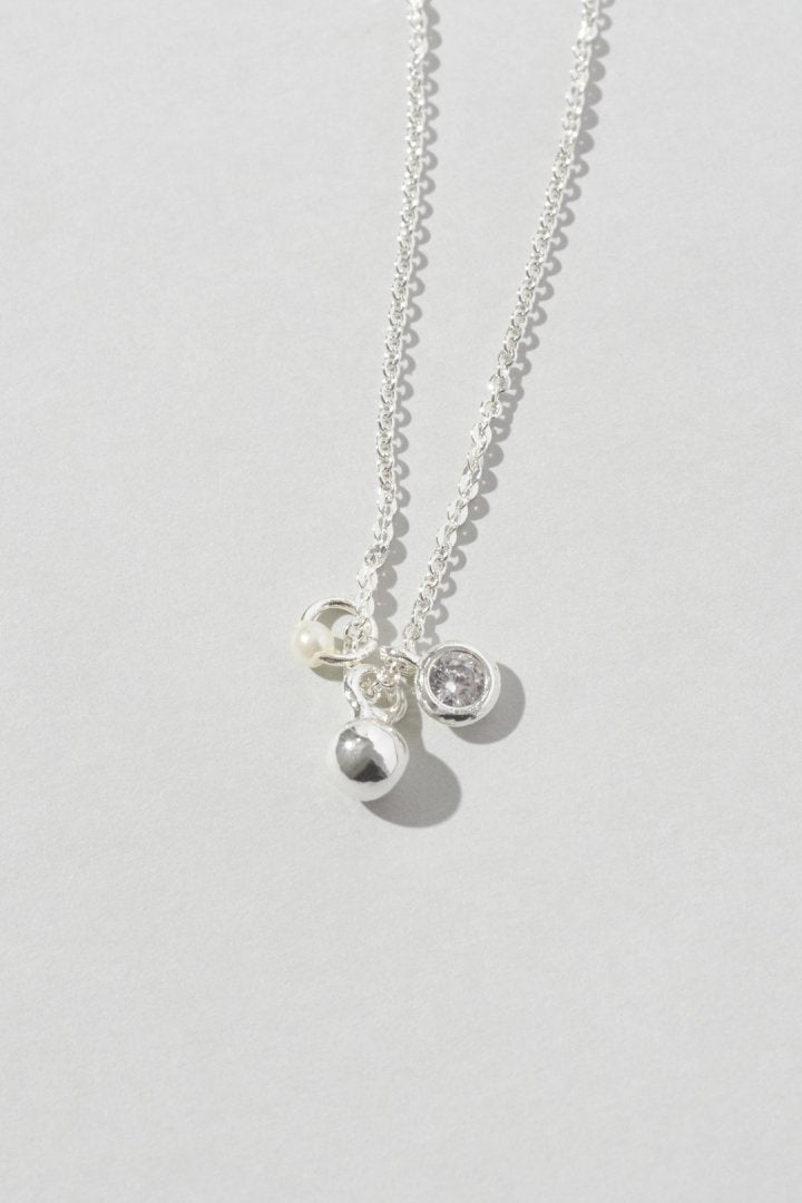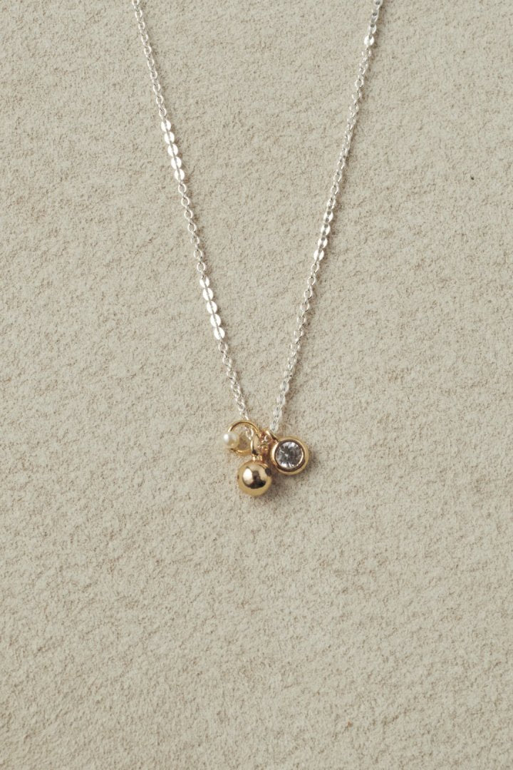 パールやビジュー、メタルボールを華奢なチェーンに通して組み合わせたネックレス。