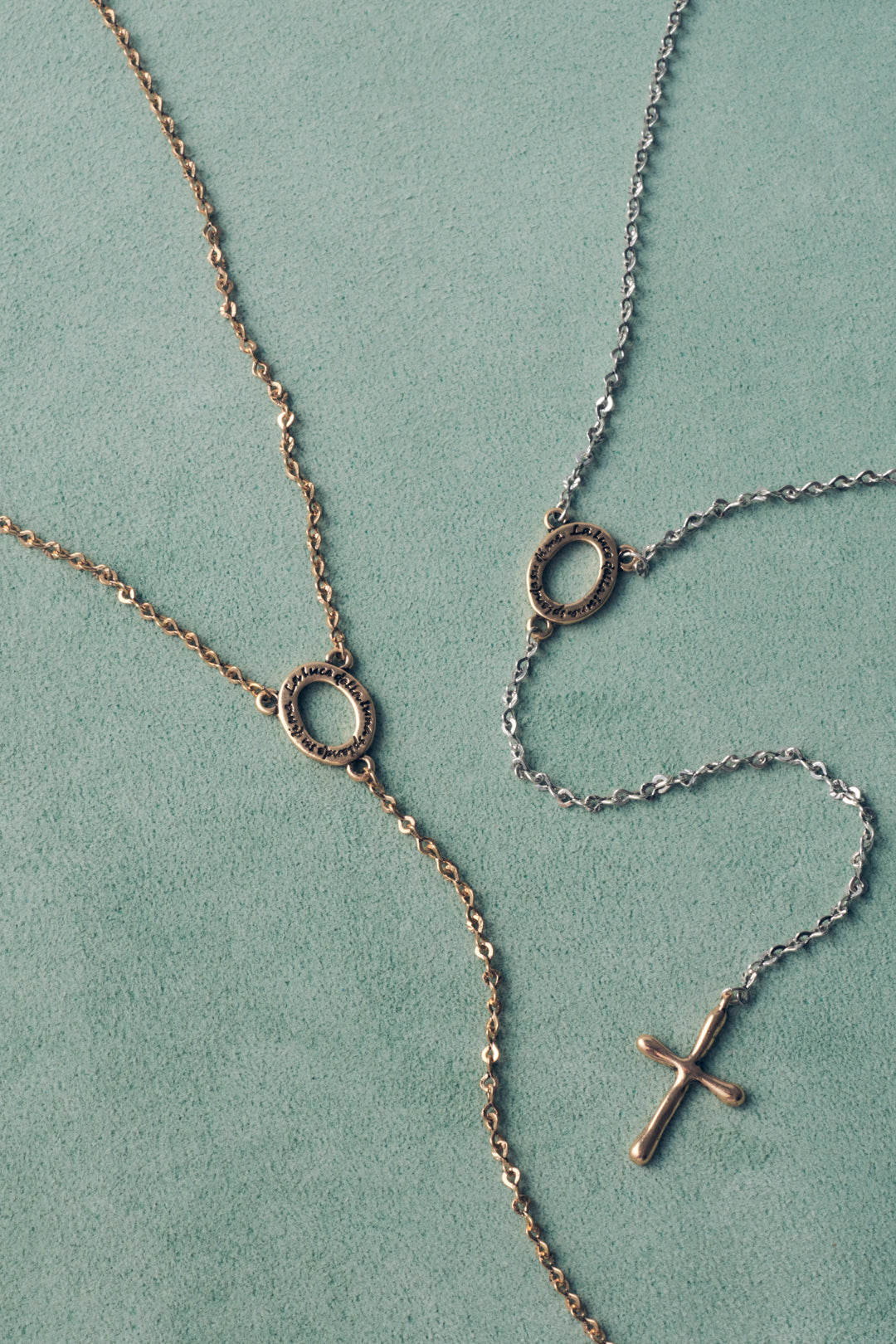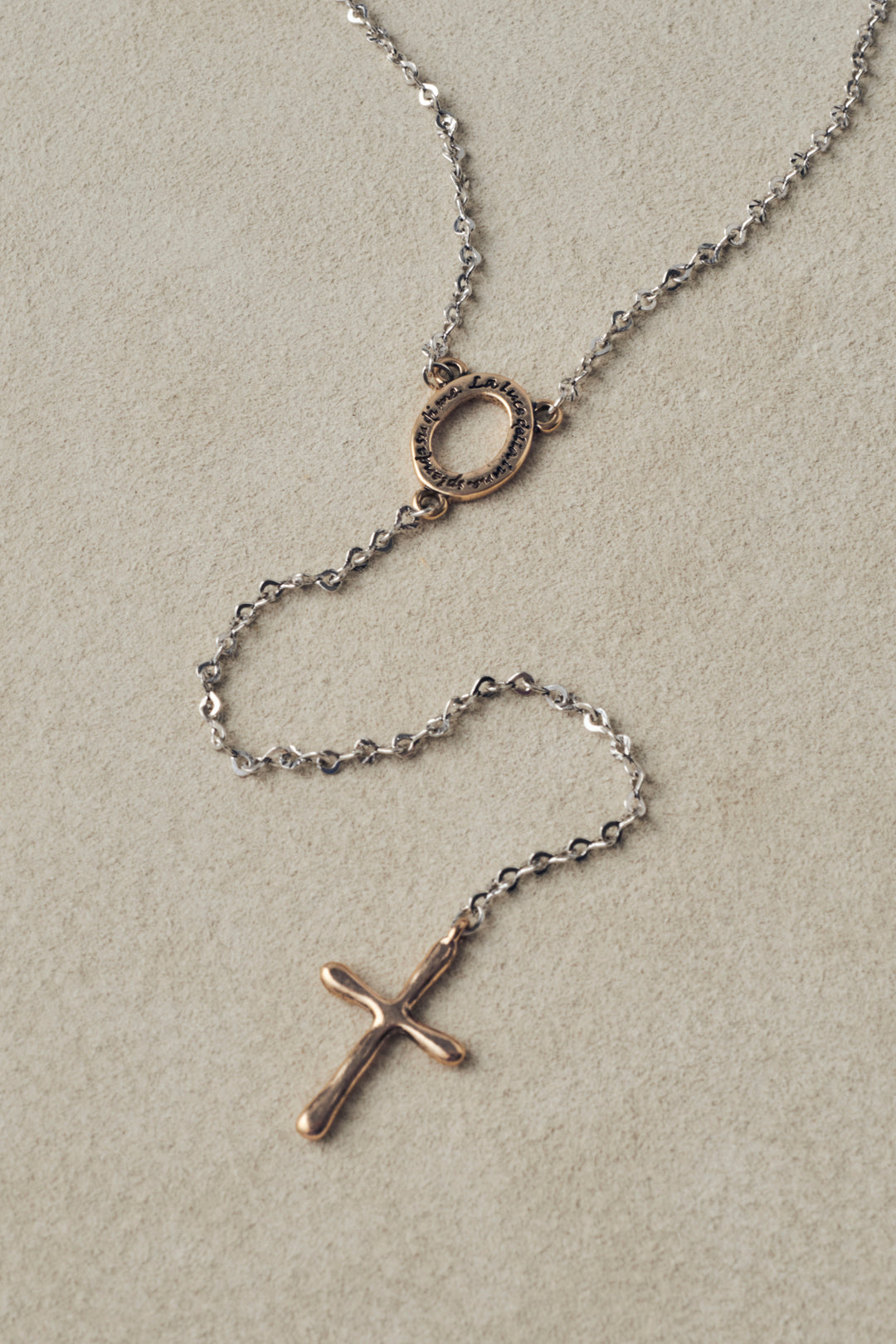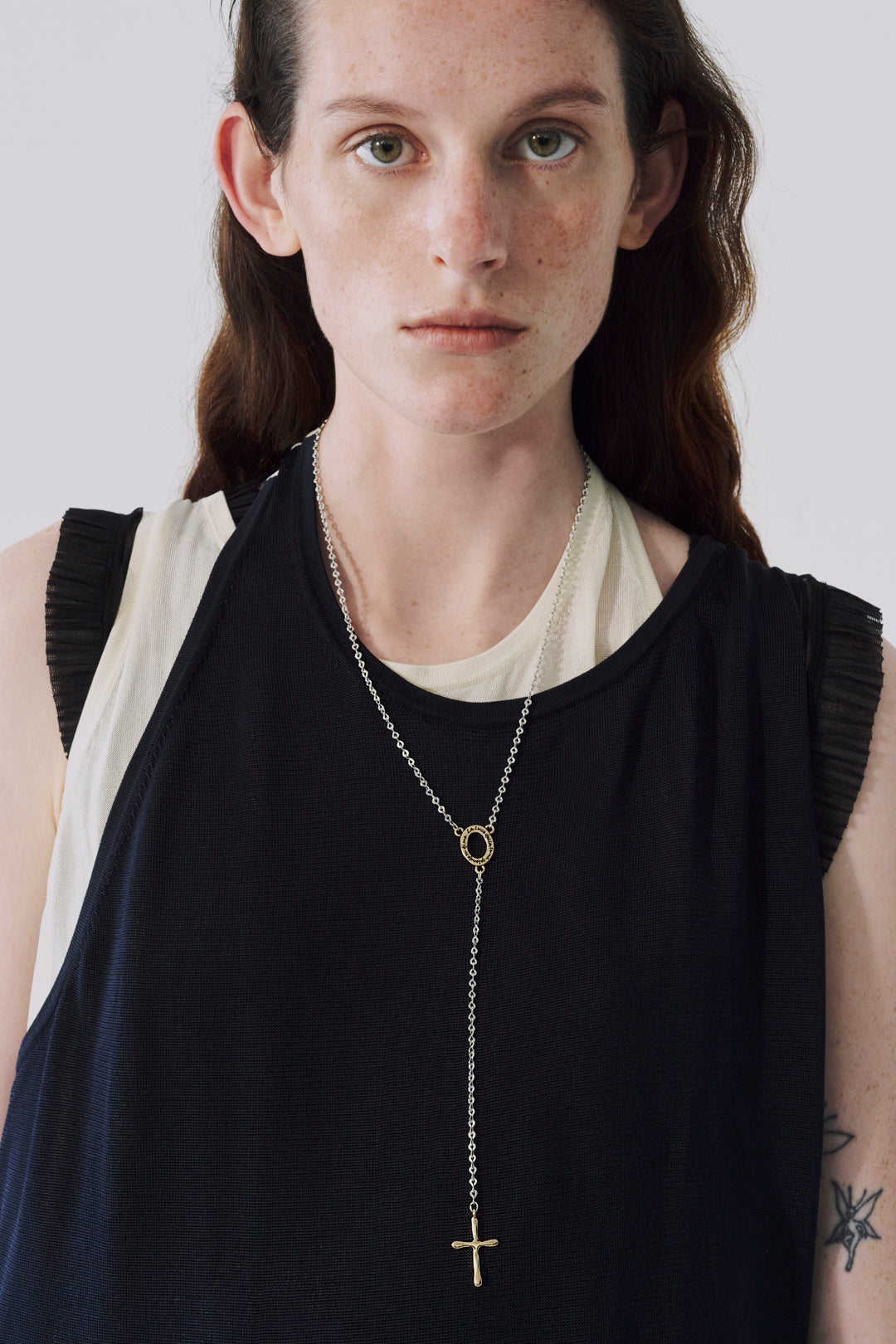 【GOLDYオリジナル】GOLDYオリジナルデザインのネックレス・ヴィンテージ風の質感・刻印入りのオーバルモチーフがポイント・こなれ感のあるY字シルエットクロスモチーフ×レタリングがクラシカルな雰囲気のネックレス。