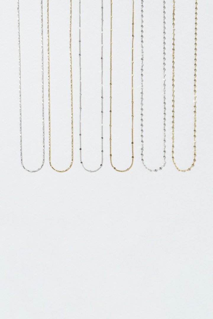 【GOLDYオリジナル】GOLDYオリジナルデザインのネックレス・さりげなく煌めくチェーンネックレス・スタイルを選ばないシンプルなデザイン・スライドビーズで長さ調節が可能◎光を受けてさりげなく煌めく、華奢なチェーンネックレス。質感の異なる3種類のチェーンで、それぞれシルバーとゴールドをご用意いたしました。カジュアルな普段使いはもちろん、結婚式や卒業式・入学式などのオケージョンシーンやパーティーシーンにもオススメです。※お使いのモニター環境により、実際の色味と異なって見える場合がございます。※こちらの商品は、色味に多少の個体差がございます。メッキ製品の特性として、予めご了承くださいませ。