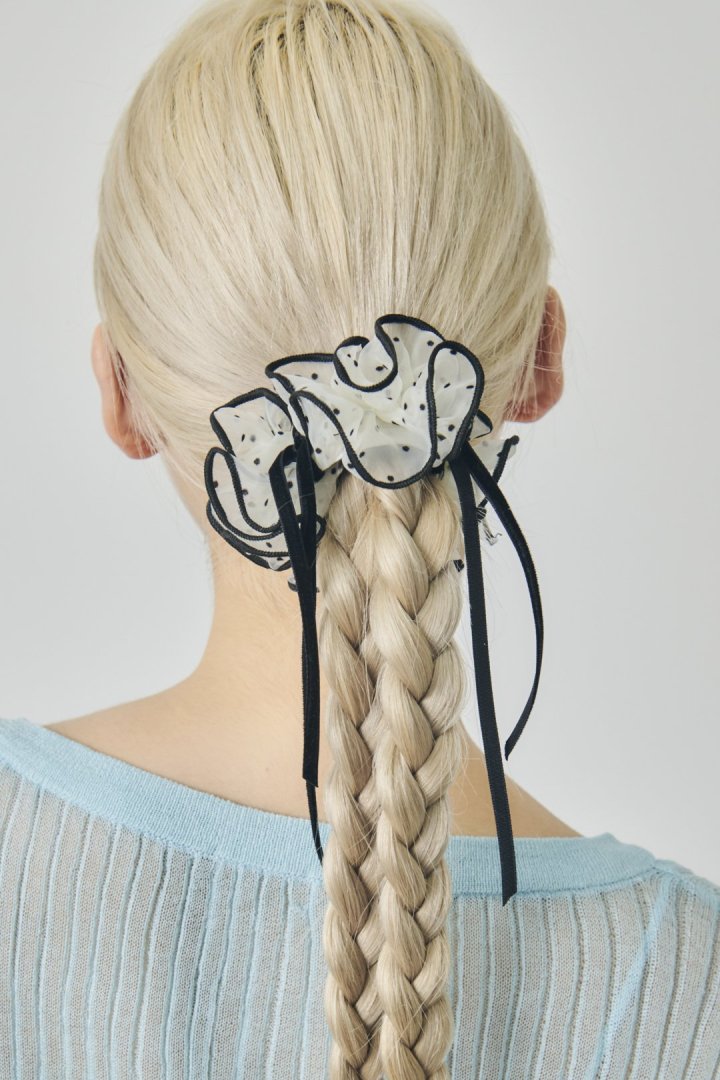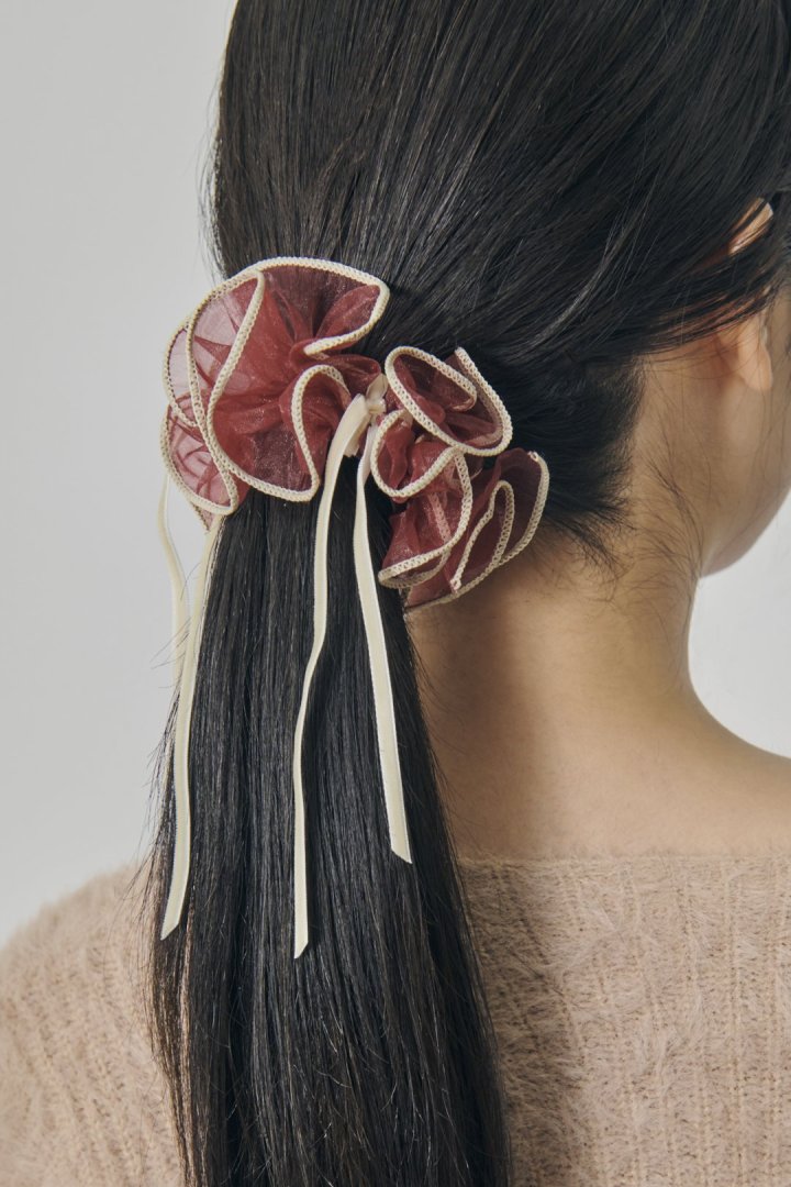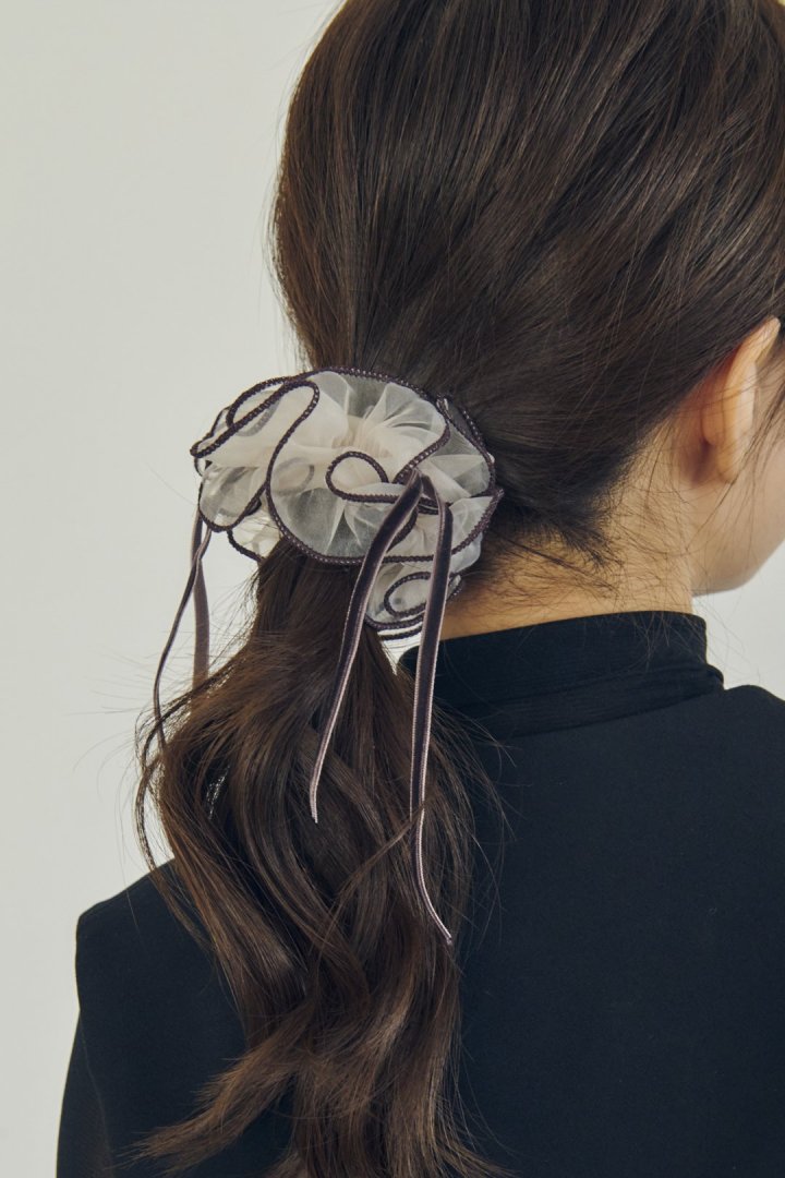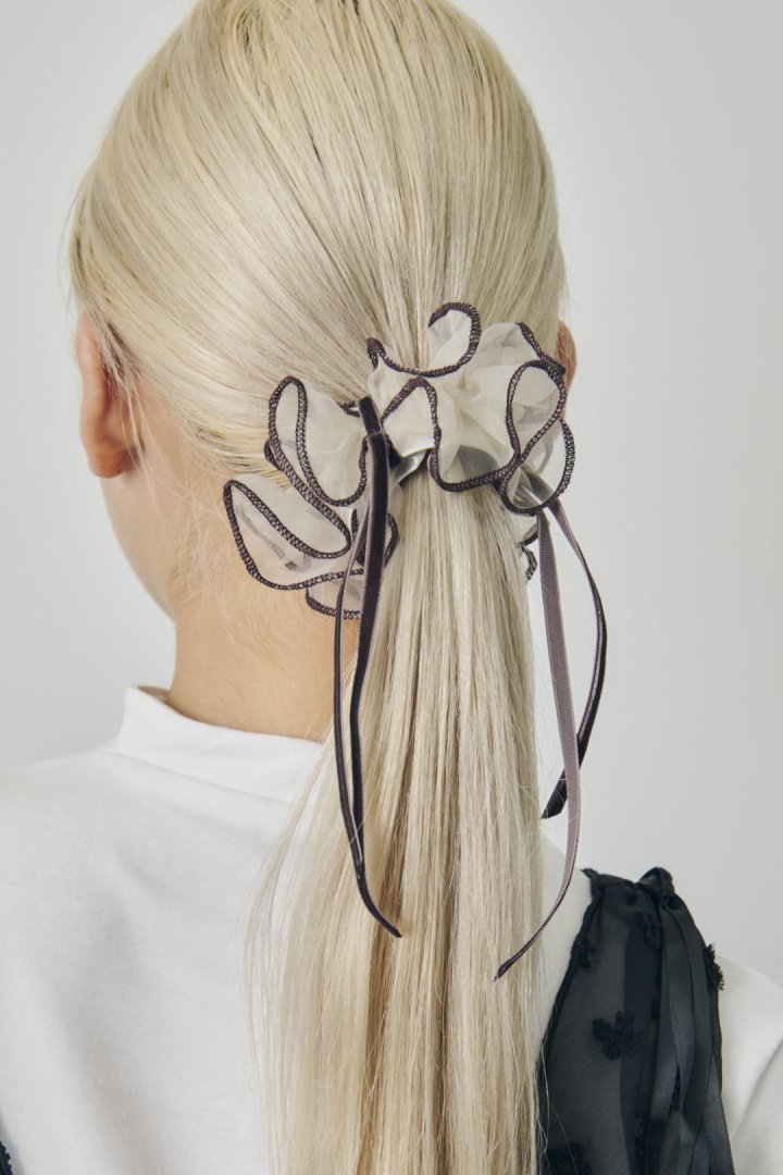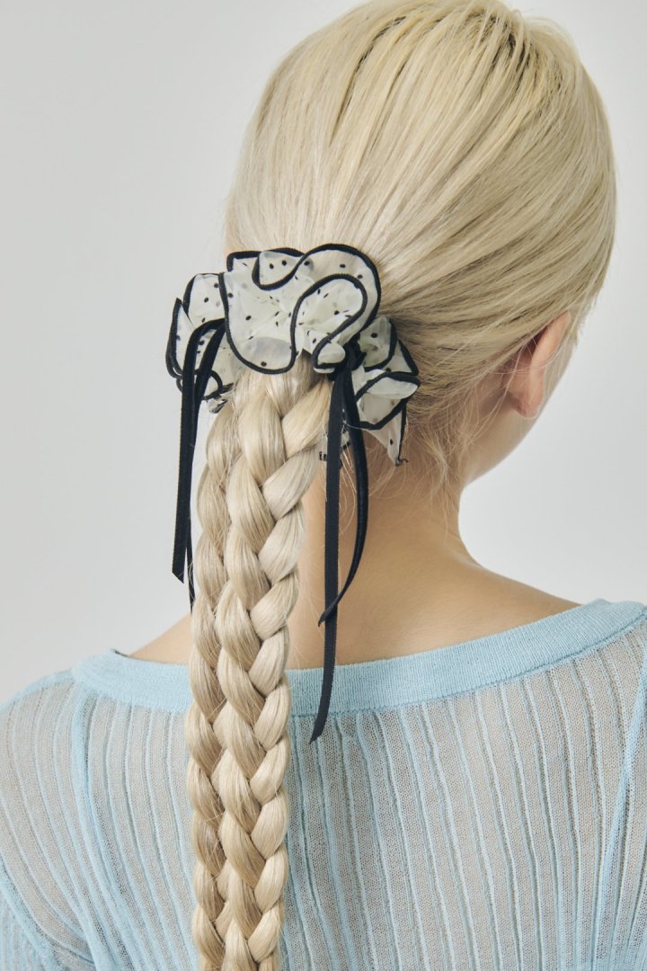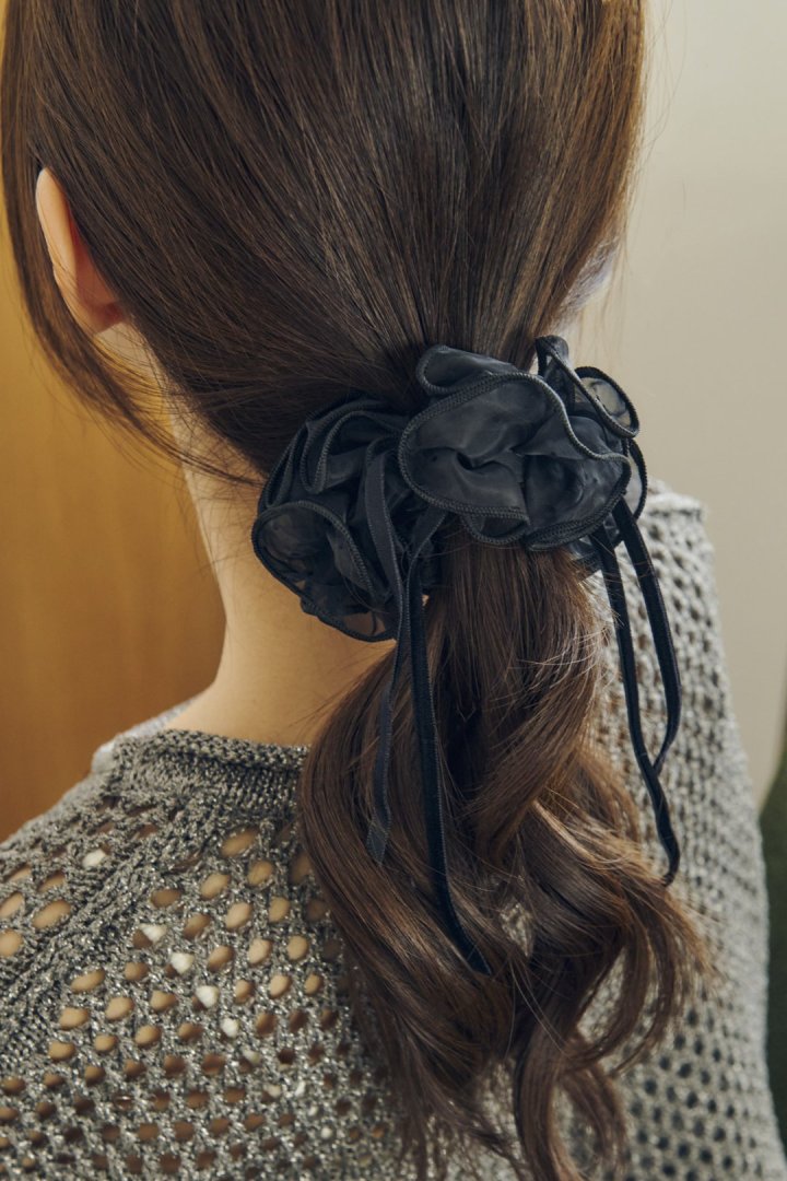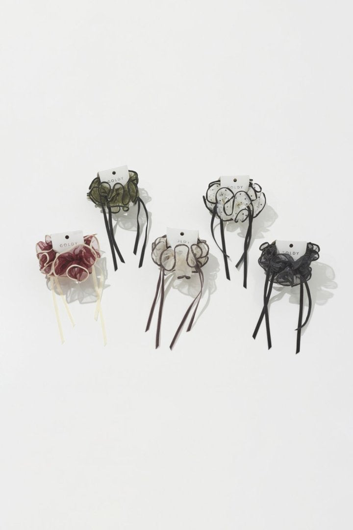 【GOLDYオリジナル】GOLDYオリジナルデザインのポニーフック・結び目を隠せるワンタッチ式ヘアカフ・シアー×華奢なリボンが大人可愛い・普段使いはもちろん、結婚式などオケージョンシーンや、パーティーシーンのヘアアレンジにも◎カチッとなるまで広げて伸ばし、まとめ髪のヘアゴムにフックを掛けるだけで簡単に着用できるポニーフック。