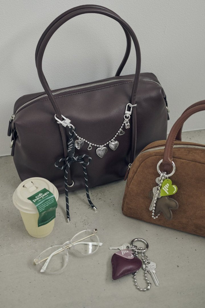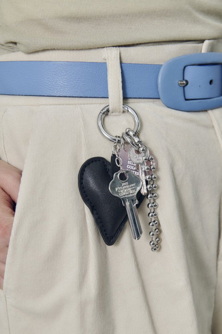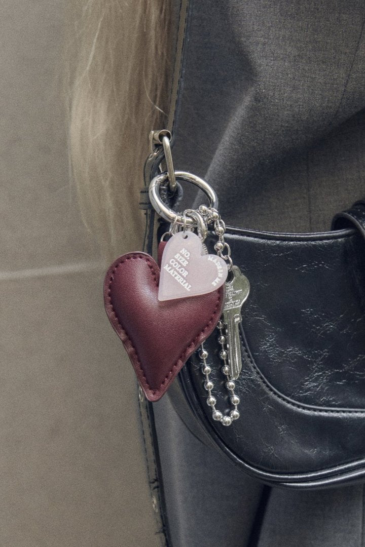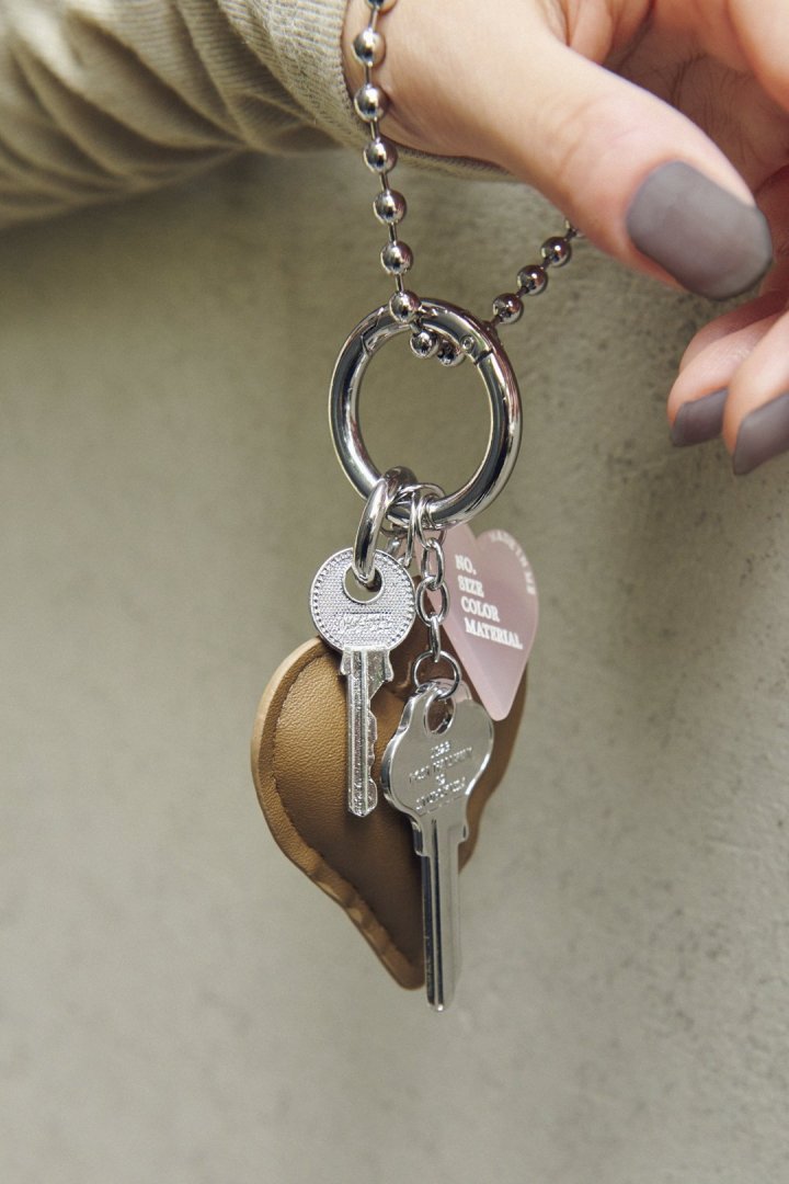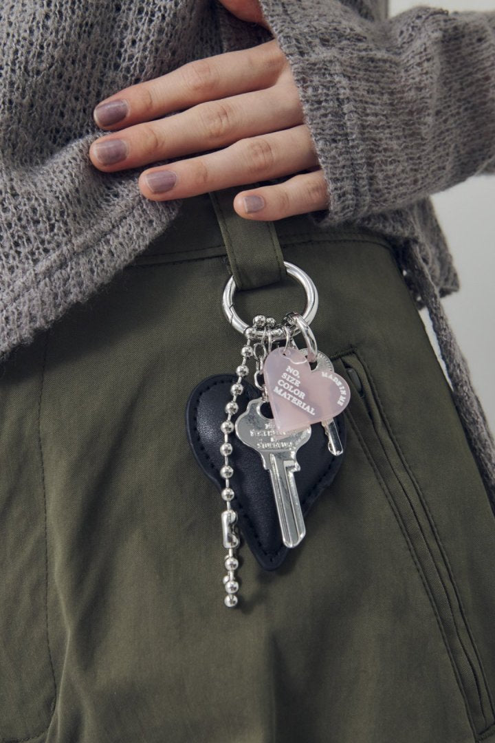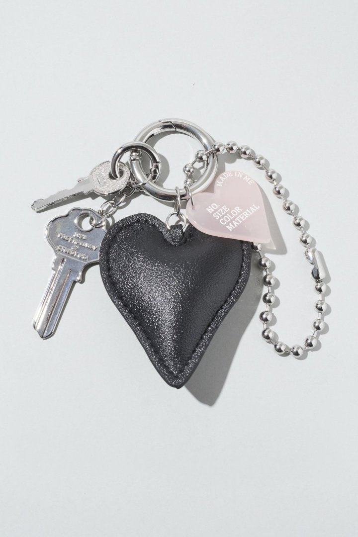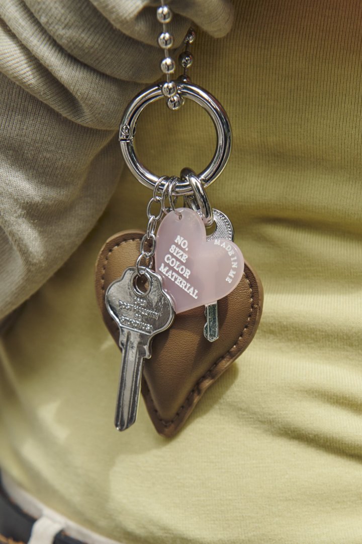 レザー調のハートや鍵モチーフ、ボールチェーンなどさまざまなチャームを組み合わせたトレンド感のあるデザイン。
