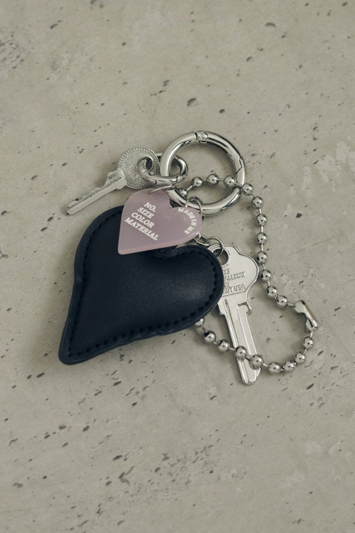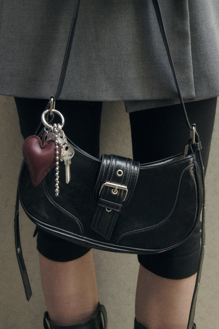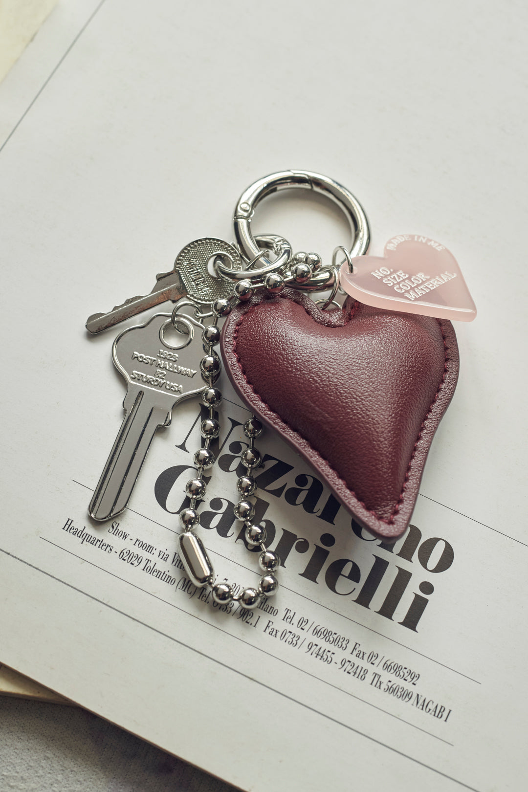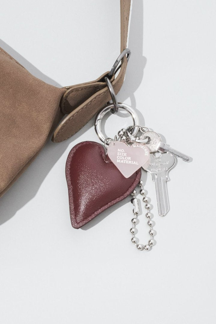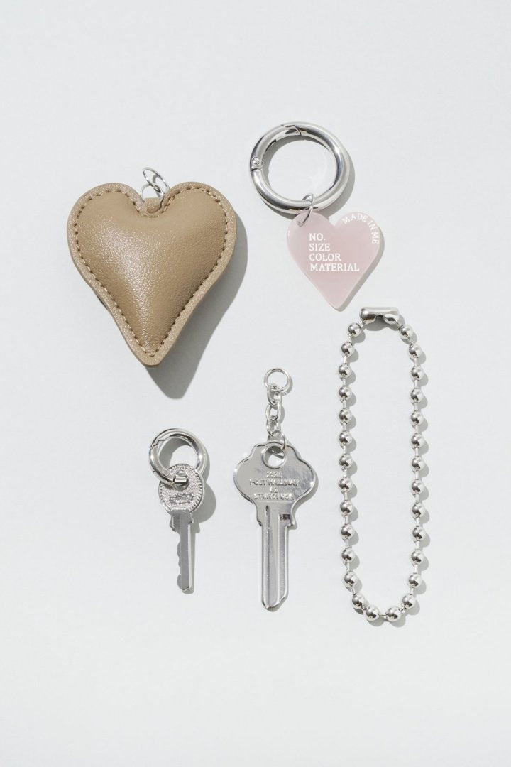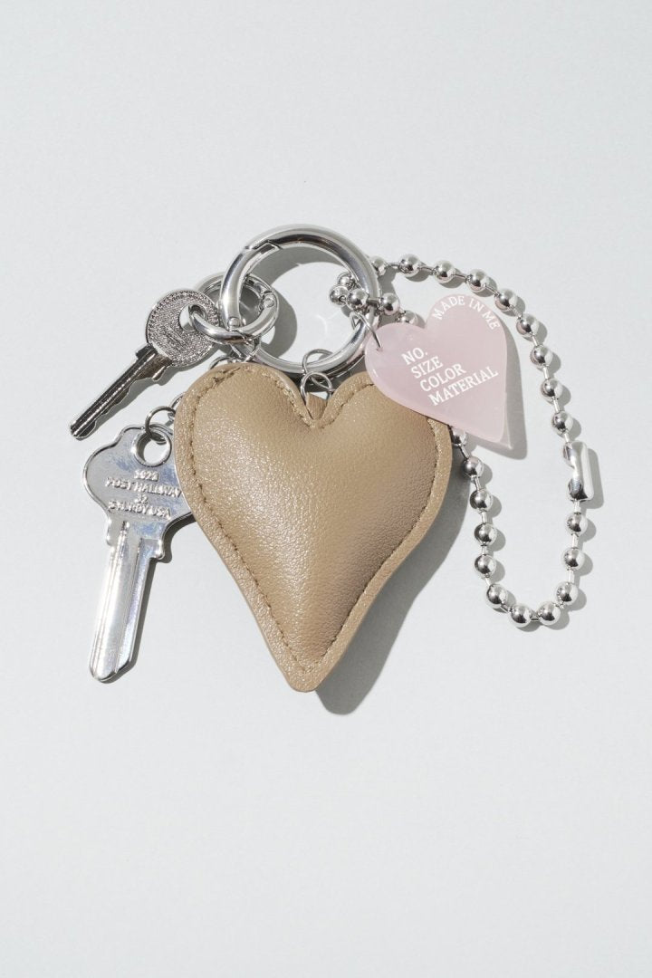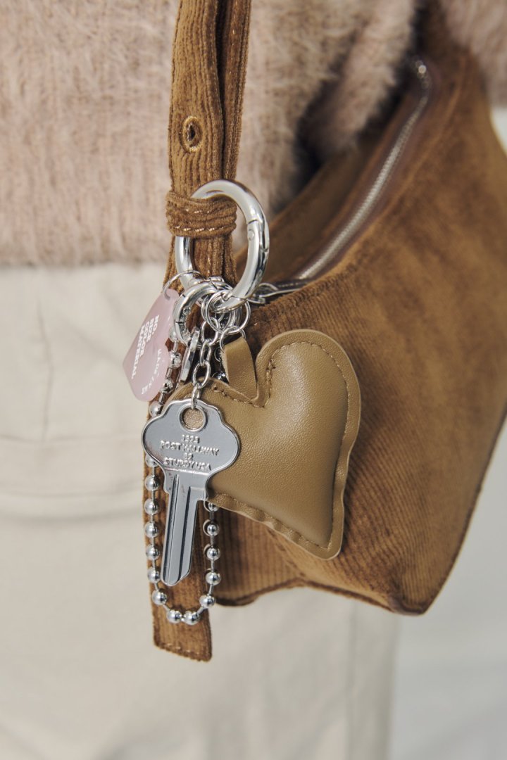 レザー調のハートや鍵モチーフ、ボールチェーンなどさまざまなチャームを組み合わせたトレンド感のあるデザイン。