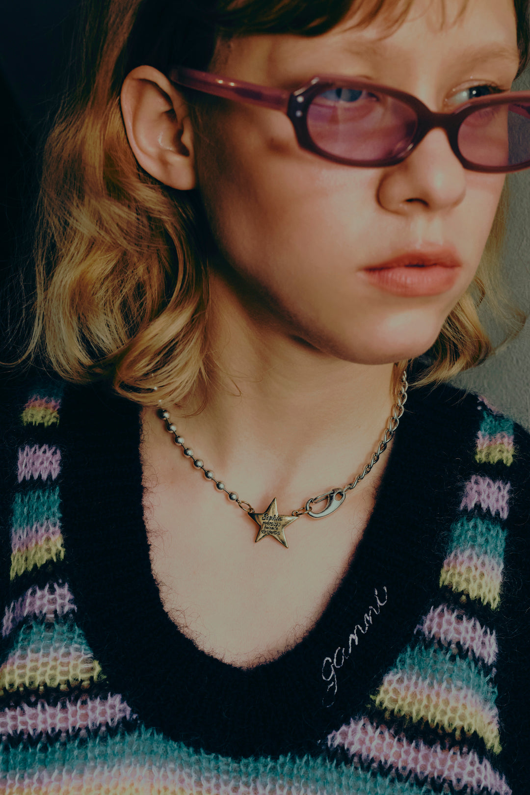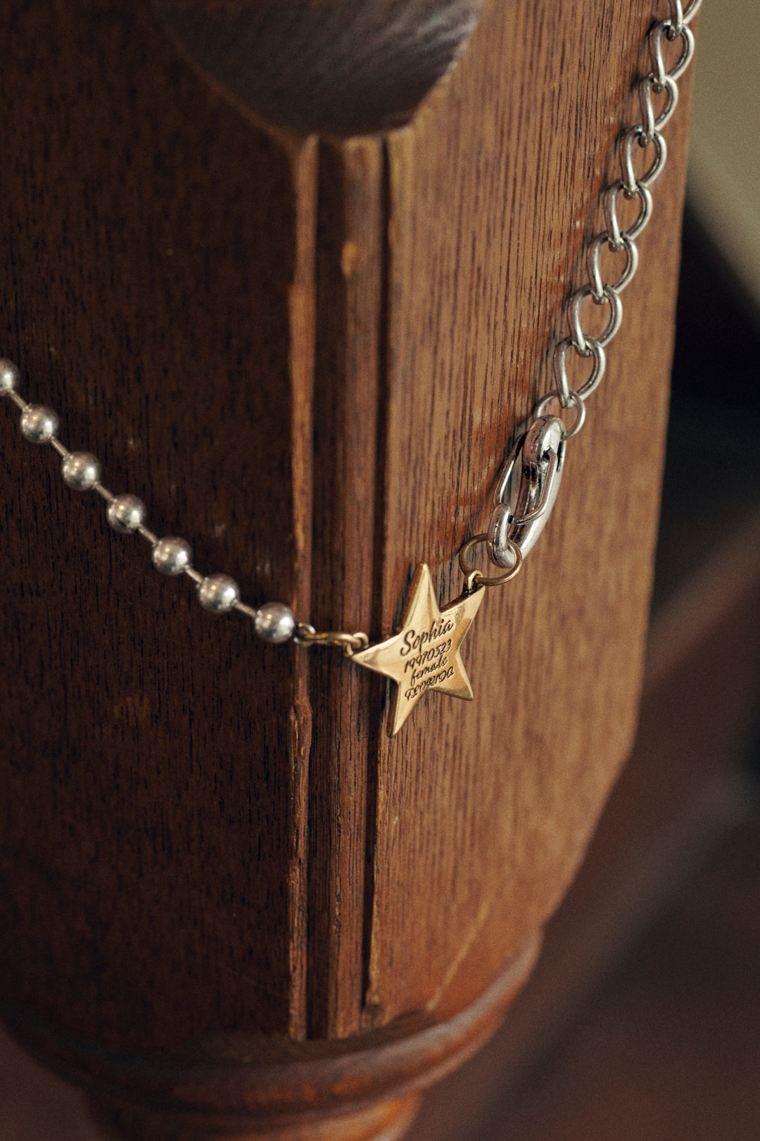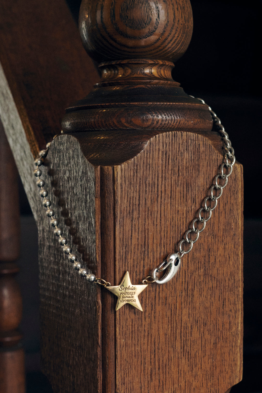 『フロリダに住む犬“ソフィア”』のドッグタグをイメージした遊び心のあるチャームと、フックモチーフをチェーンに組み合わせたデザイン。