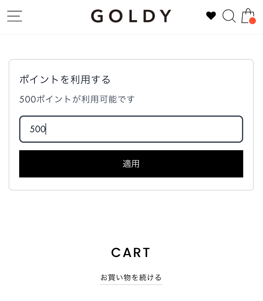 カートページにて、利用するポイントを入力後、「適応」をクリックしていただくと、ご使用可能です。