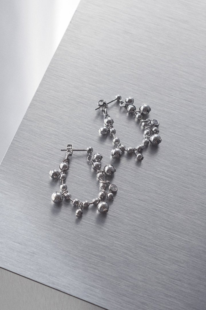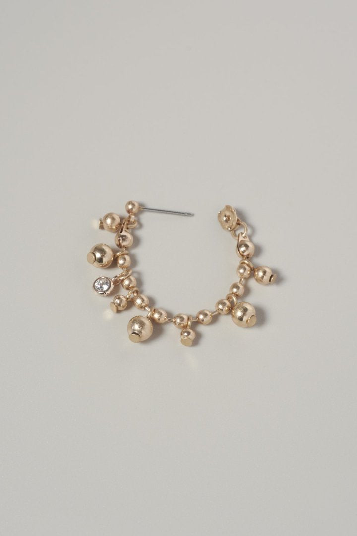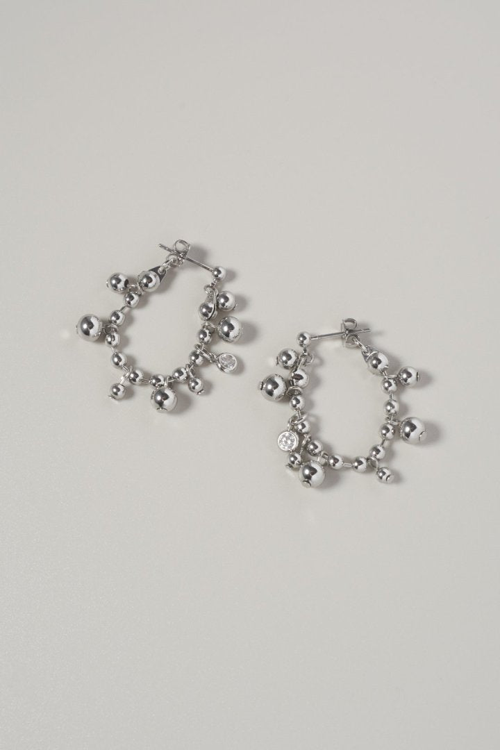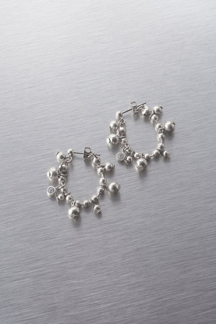 キュービックジルコニアがアクセントになったボールチェーンをフープピアスに仕上げたデザイン。
