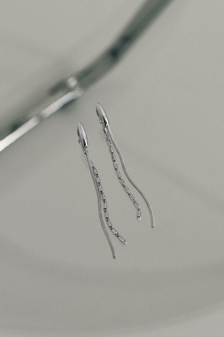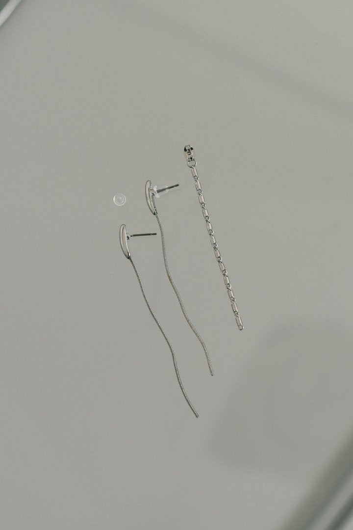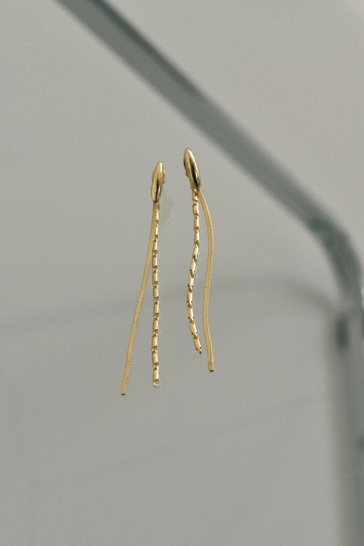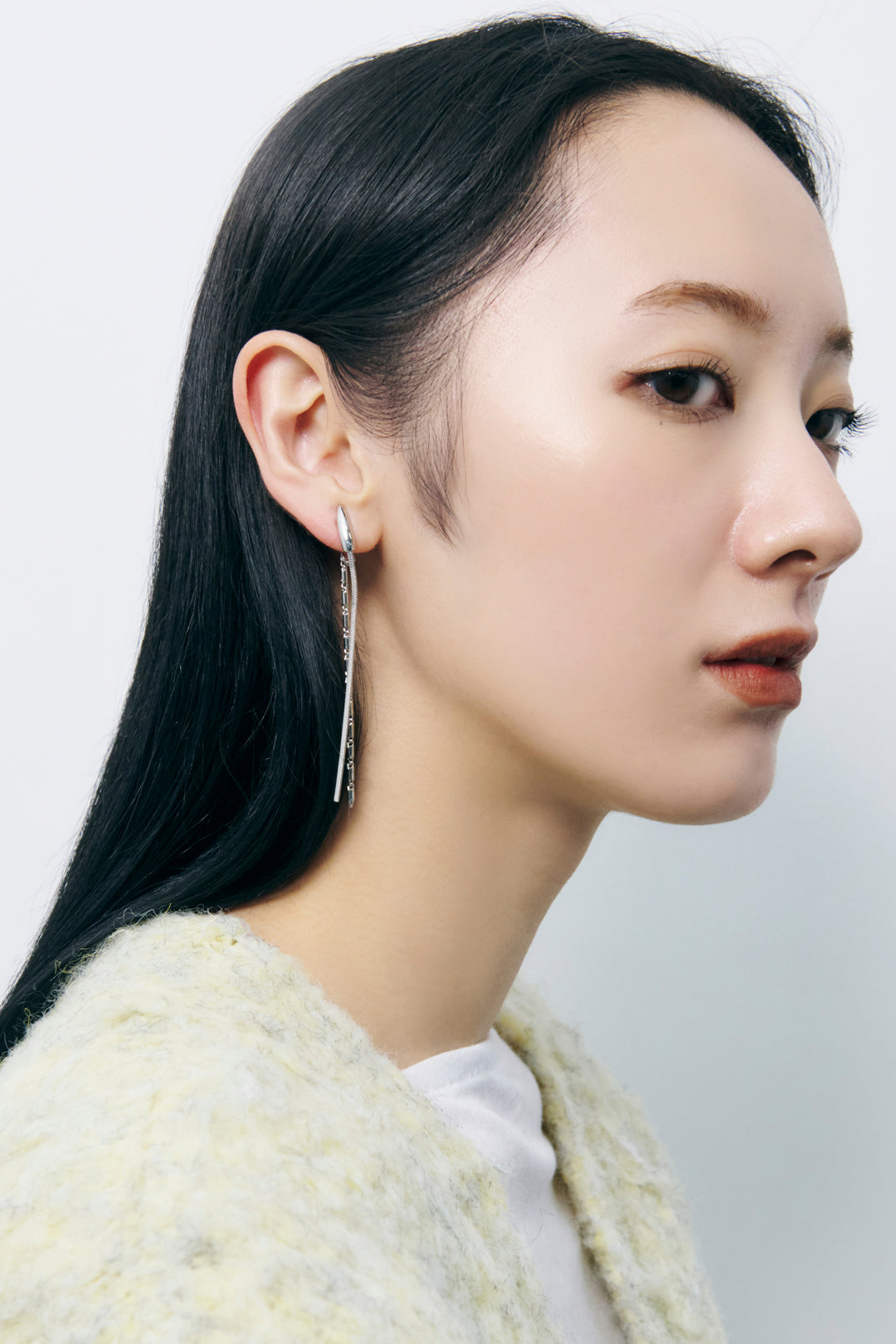 バックキャッチと一体となったチェーンを外すことで、シンプルなスネークチェーンのロングピアスとしても使えて、気分でスタイリングを変えられる2WAY仕様です。