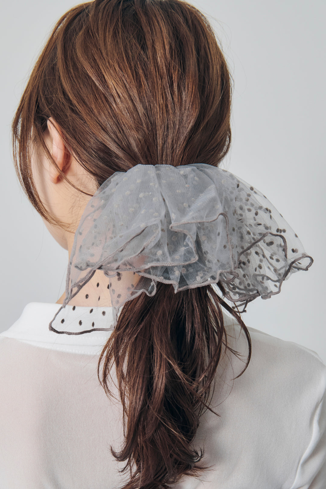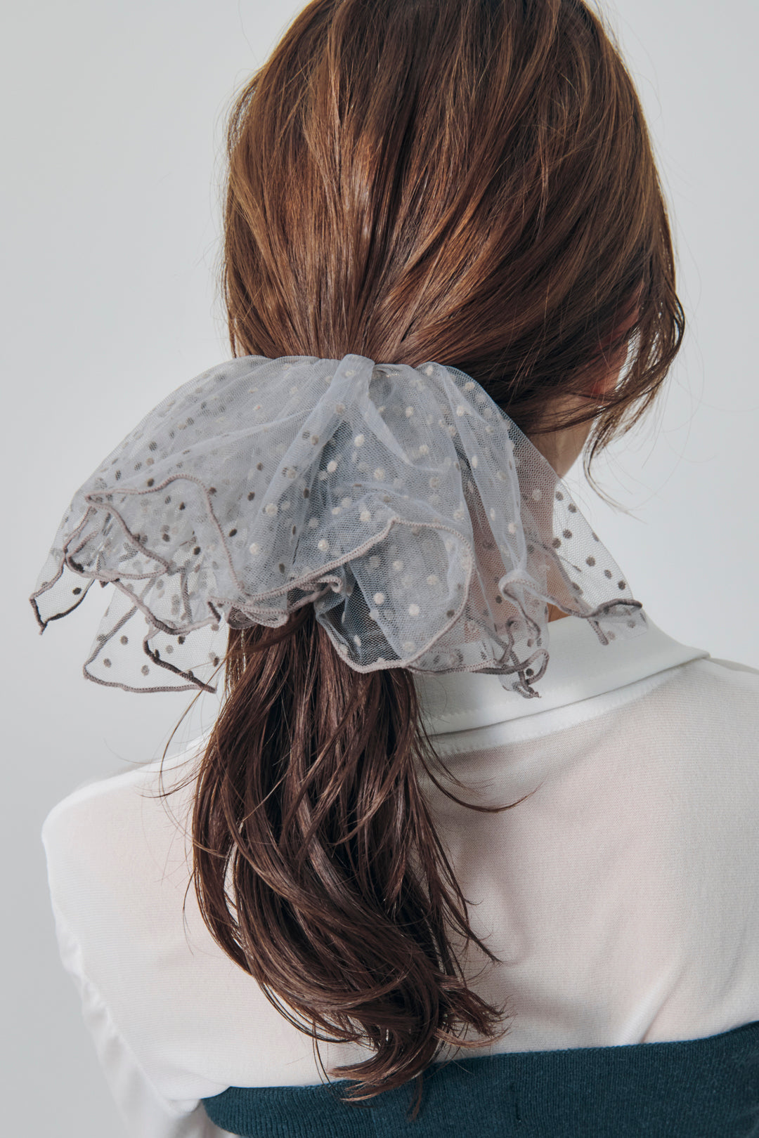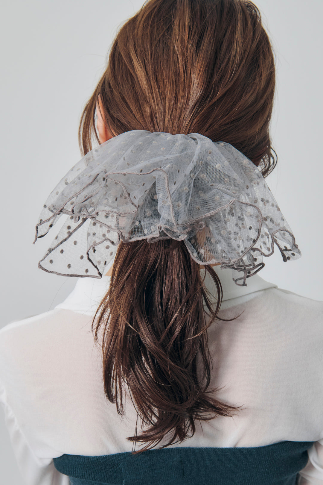 【GOLDYオリジナル】GOLDYオリジナルデザインのバレッタ・ボリューミーなフリルで華やかな後ろ姿に・ドット柄×シアー生地が大人可愛い・普段使いはもちろん、結婚式などオケージョンシーンやパーティーシーンのヘアアレンジにも◎トレンドライクなドット柄のフリルをバレッタに仕上げた、存在感のあるデザイン。