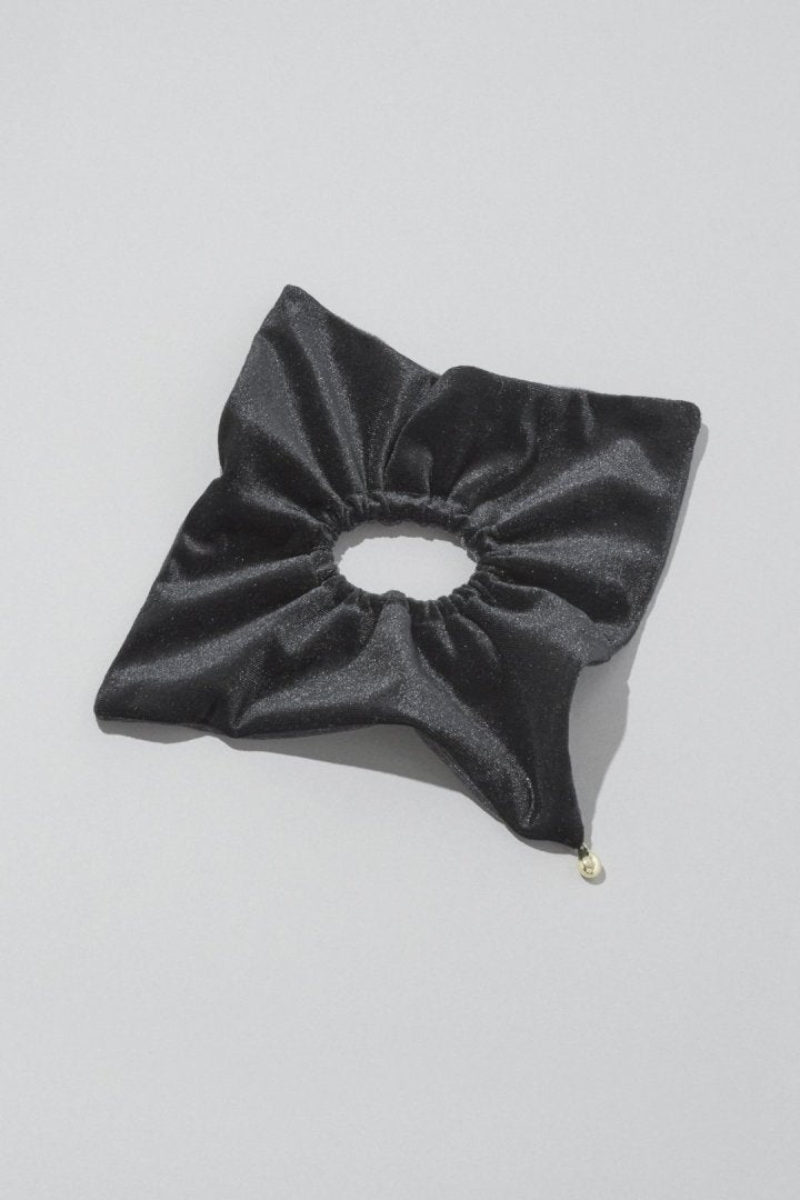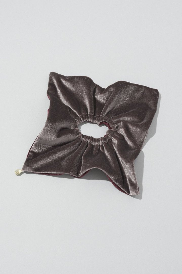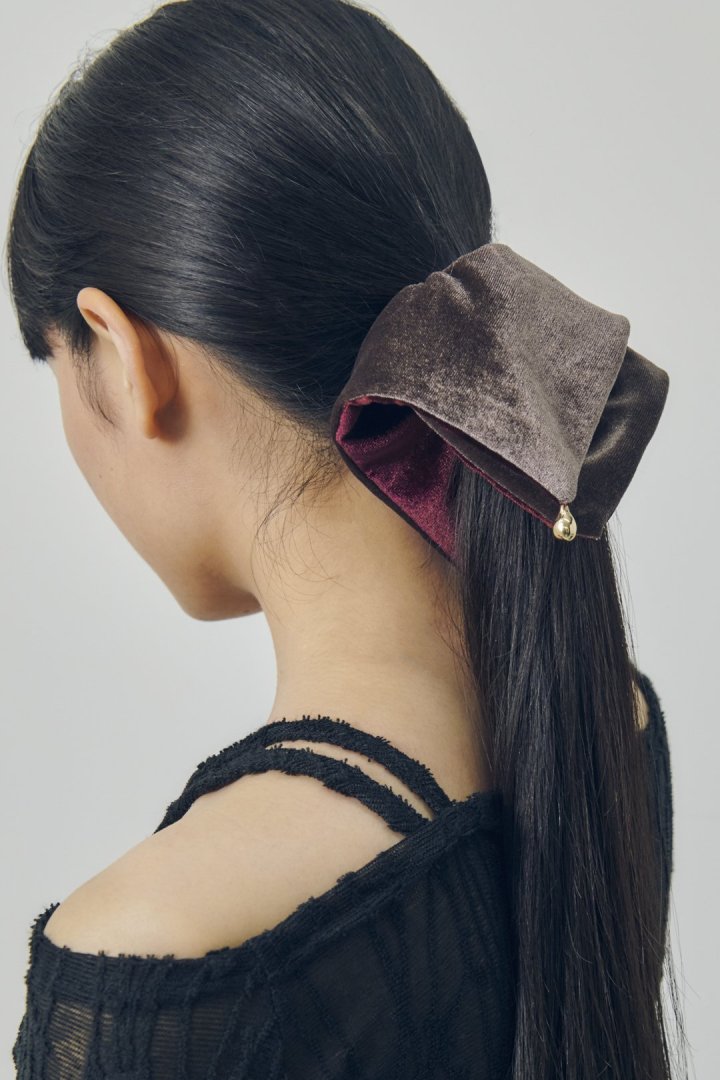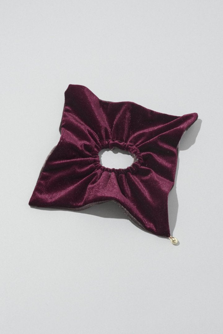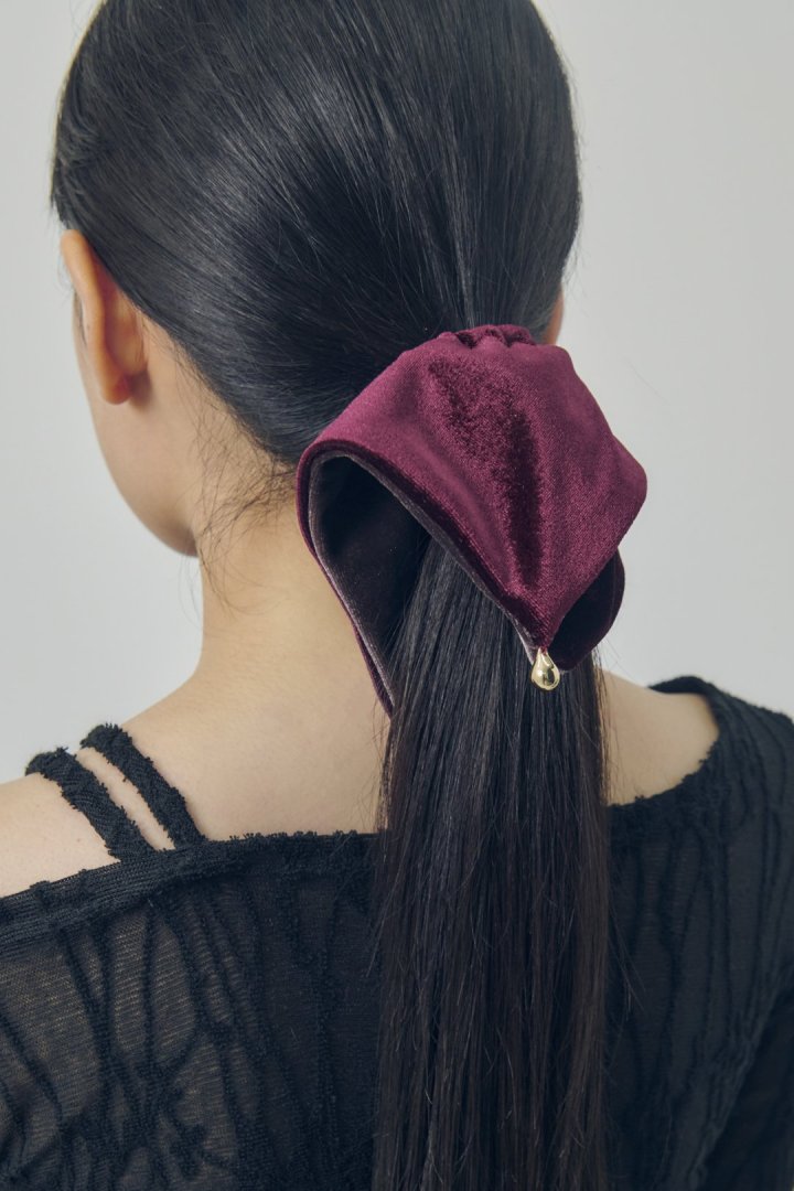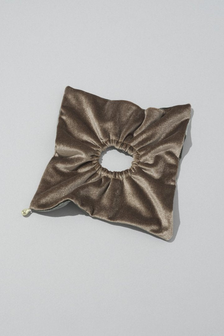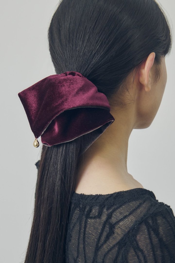 上品な光沢のベロア生地で、スクエア形に仕上げたシュシュ。