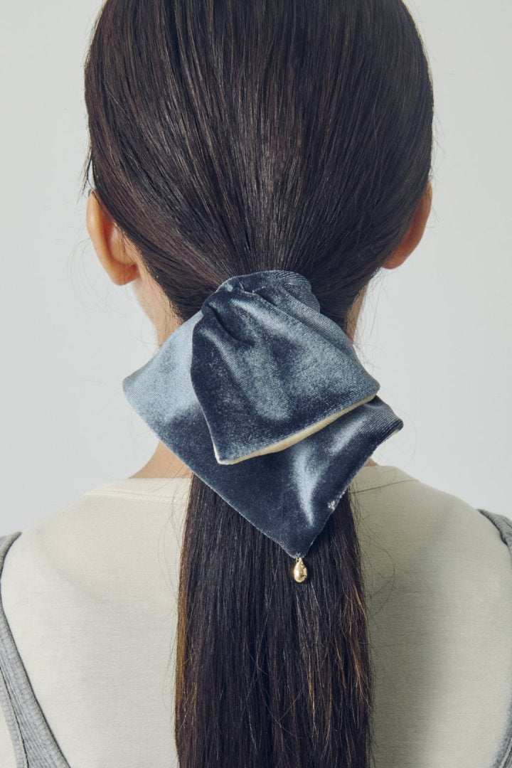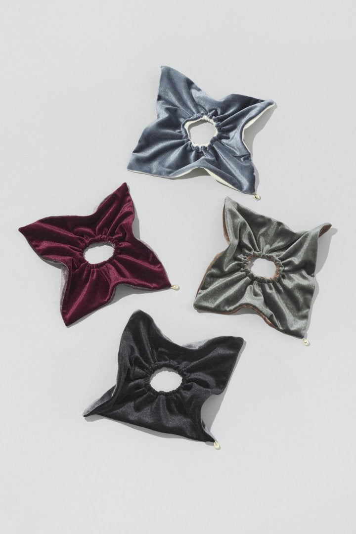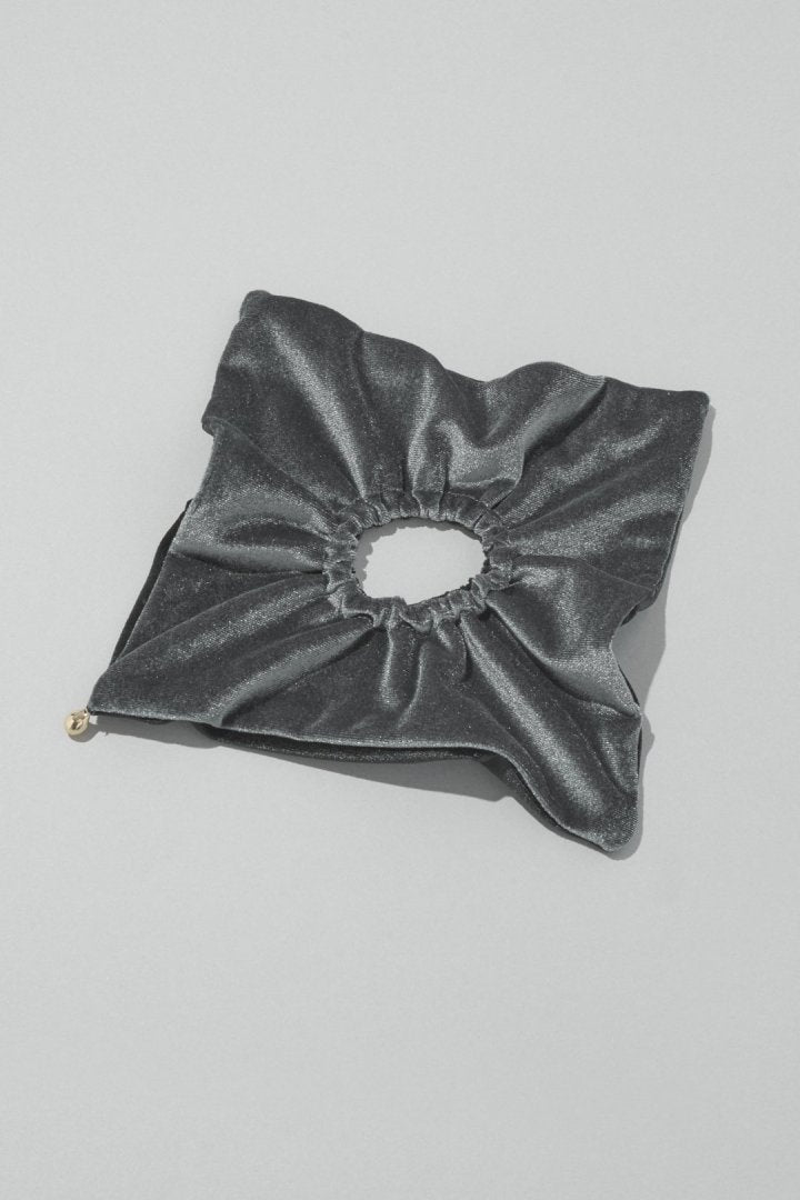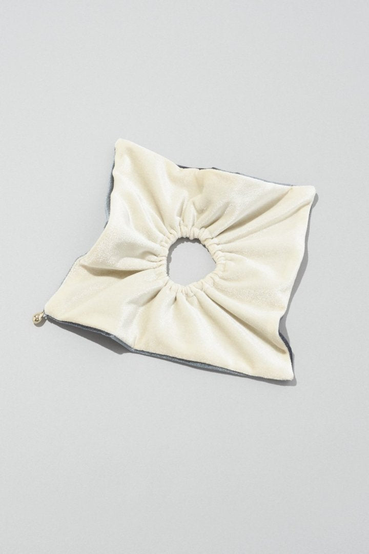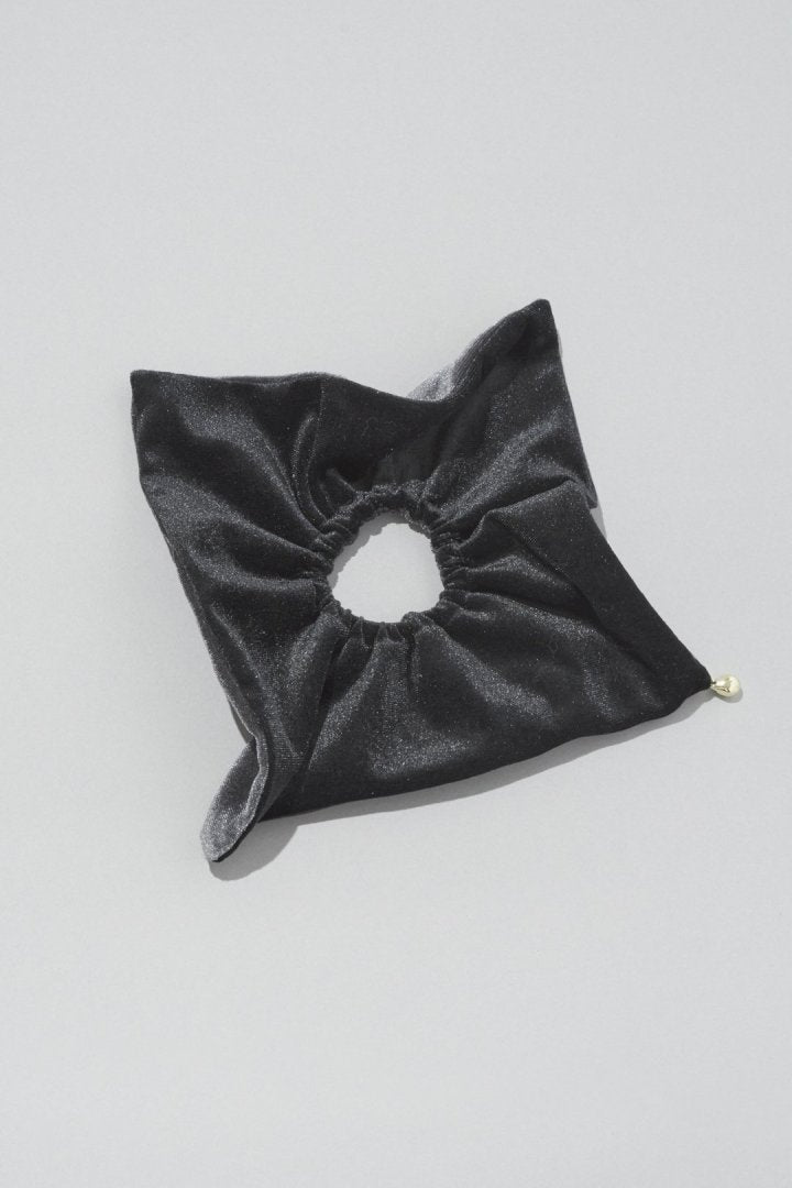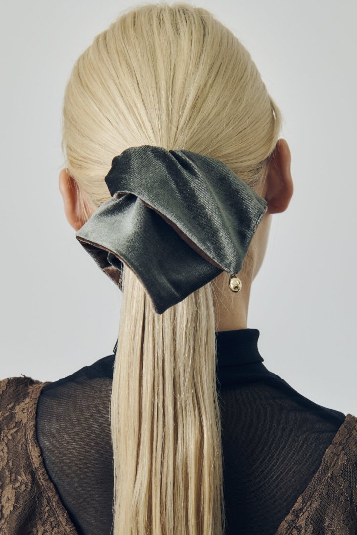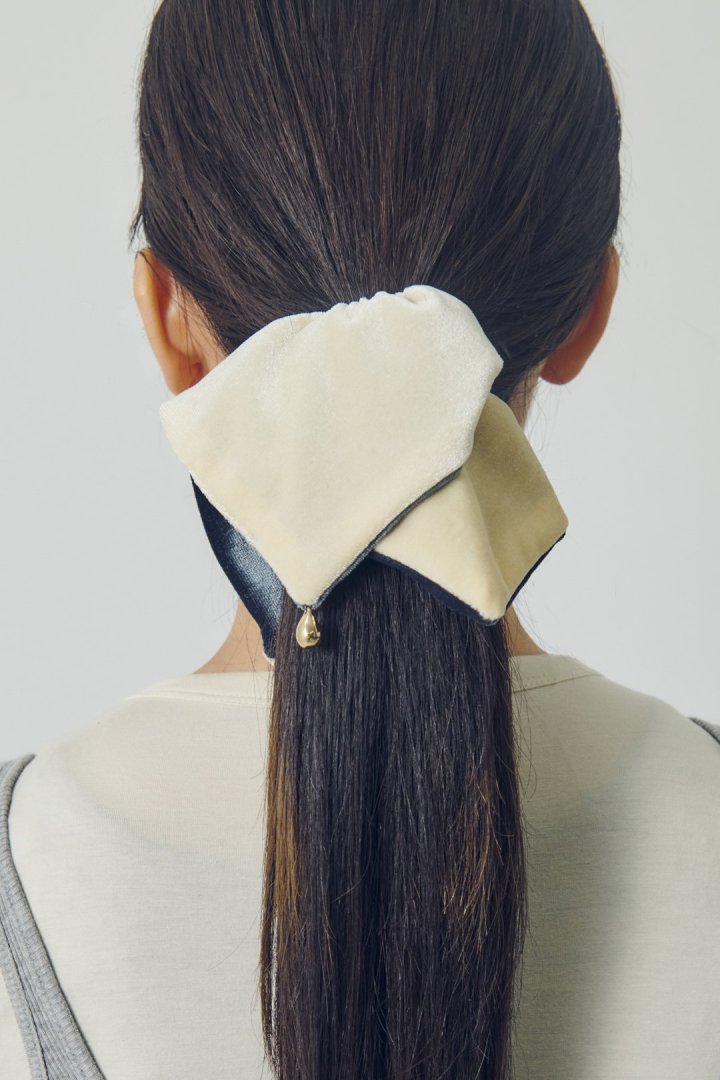 上品な光沢のベロア生地で、スクエア形に仕上げたシュシュ。