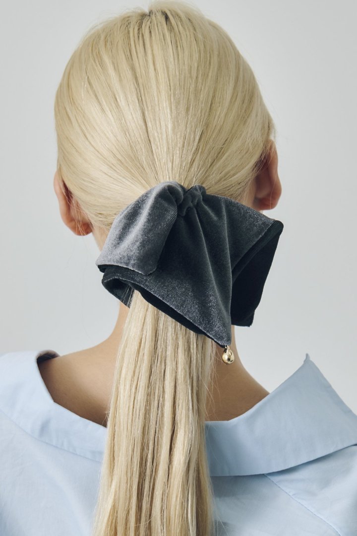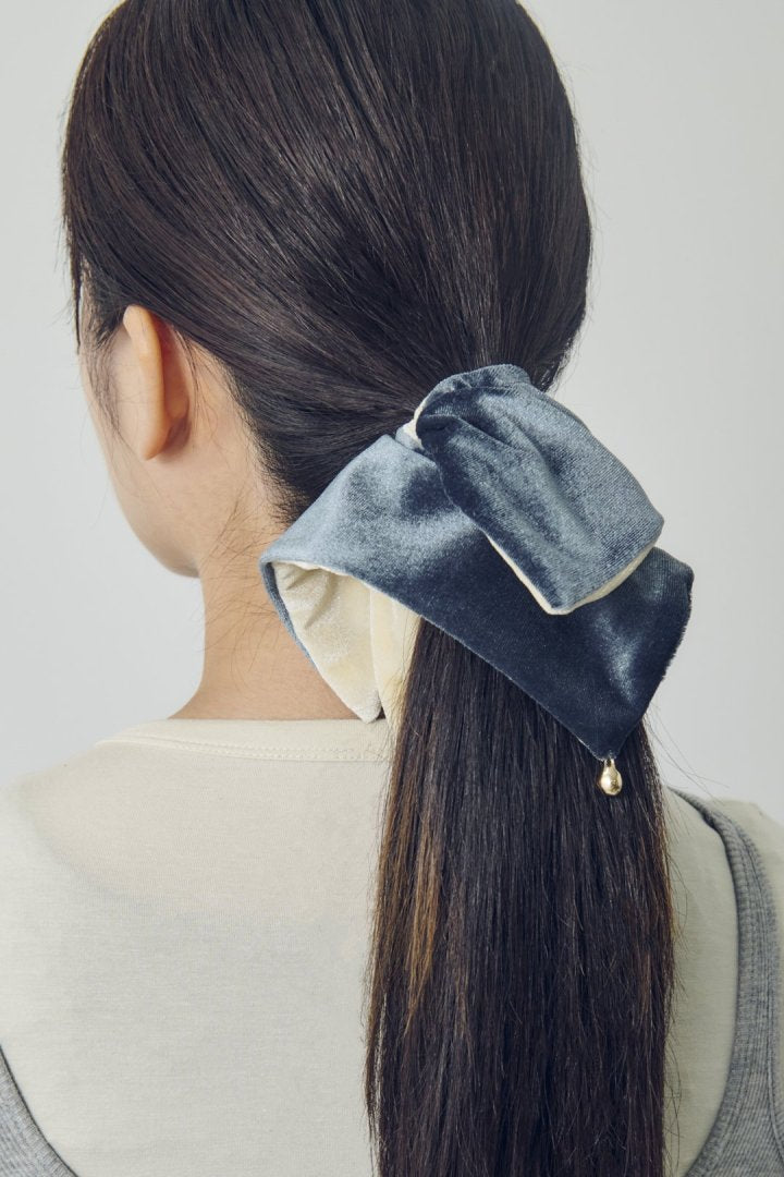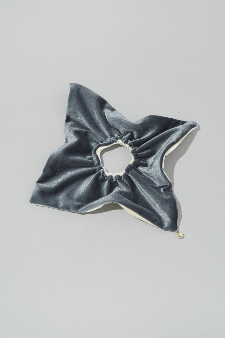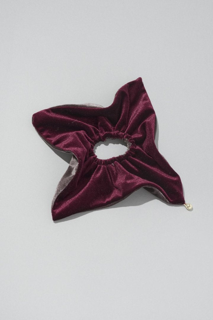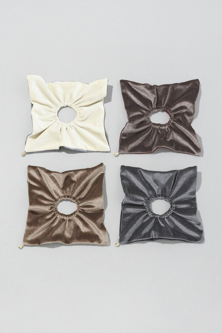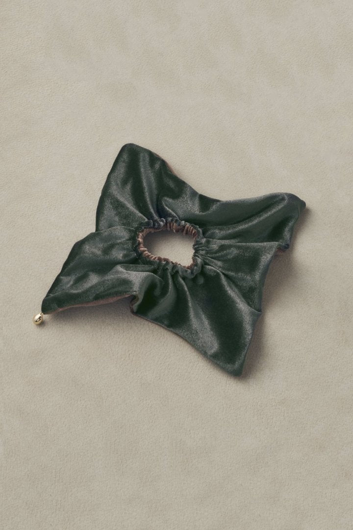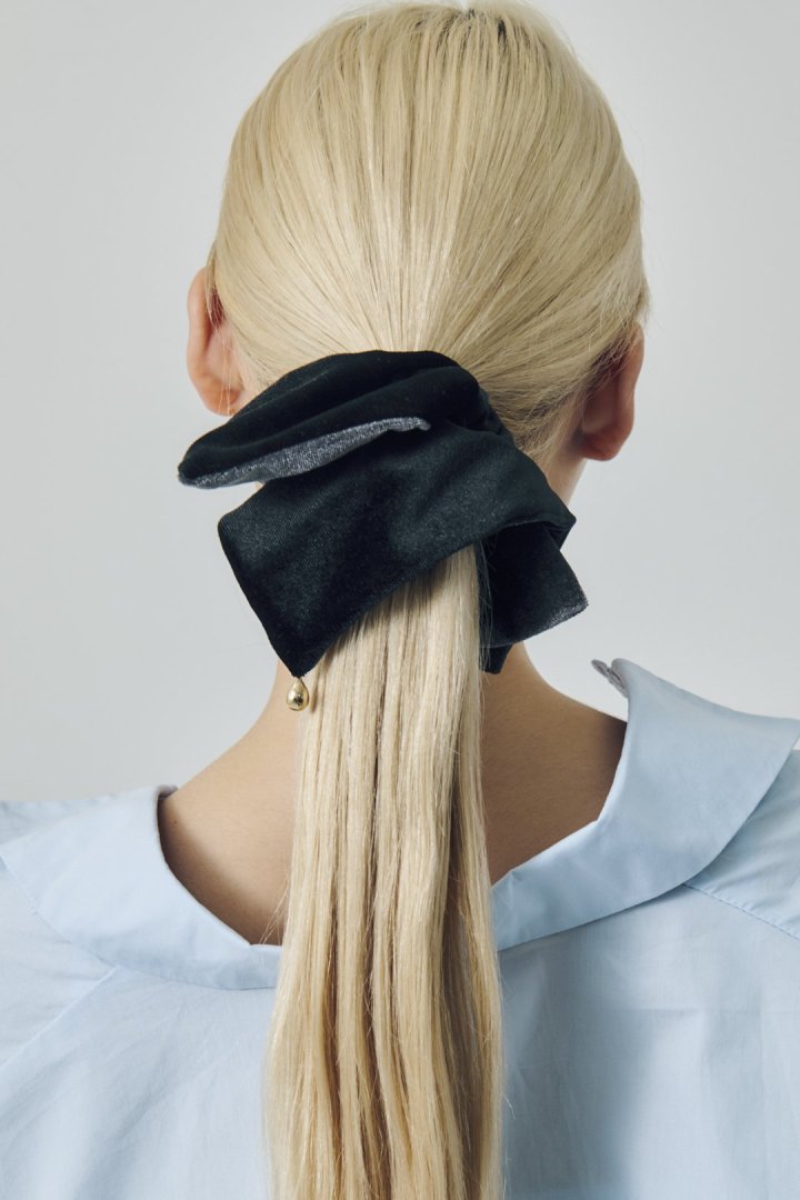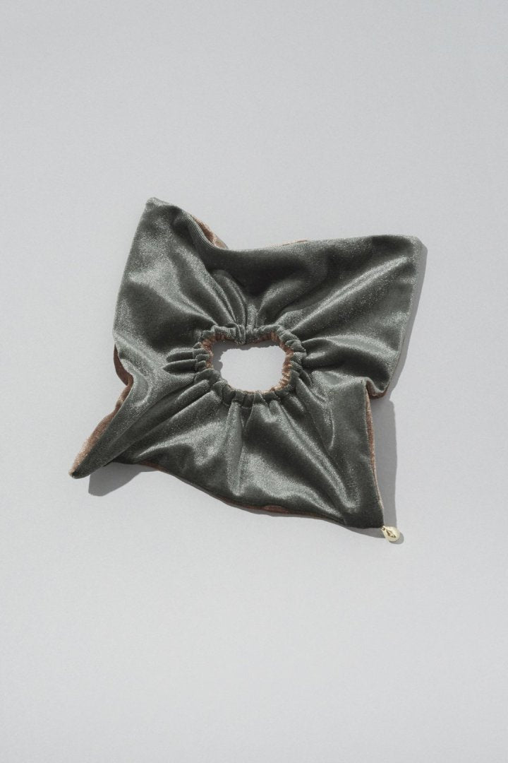 上品な光沢のベロア生地で、スクエア形に仕上げたシュシュ。