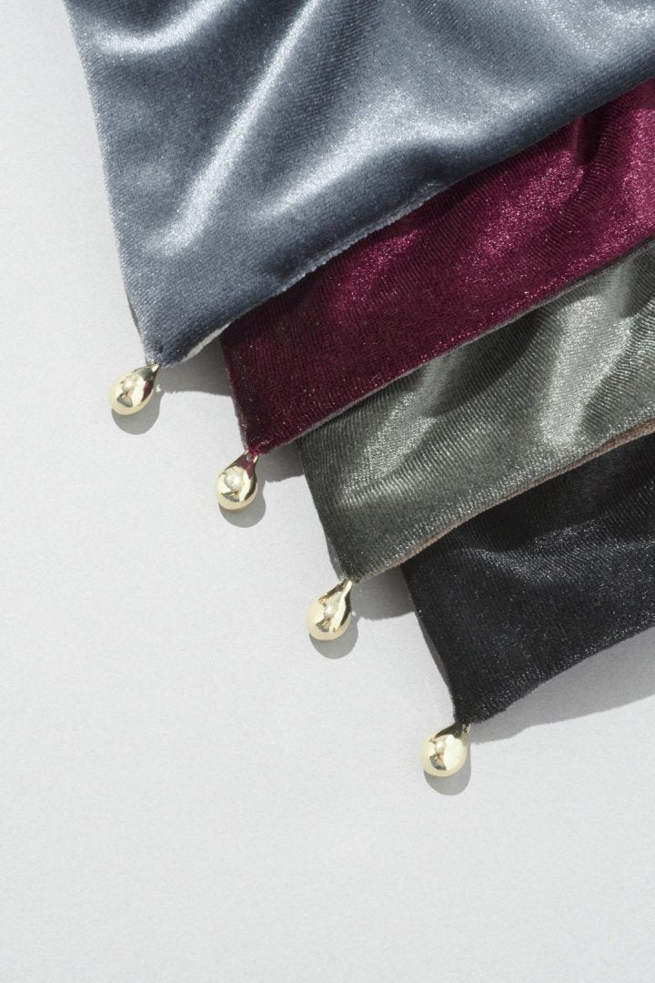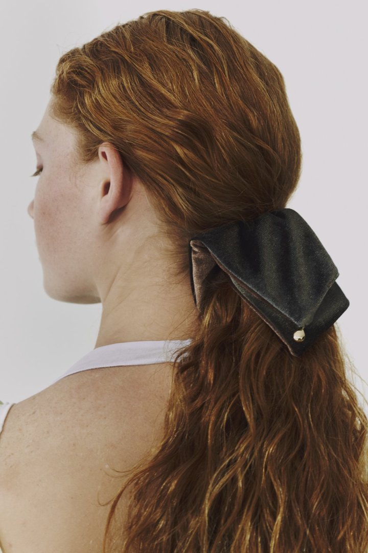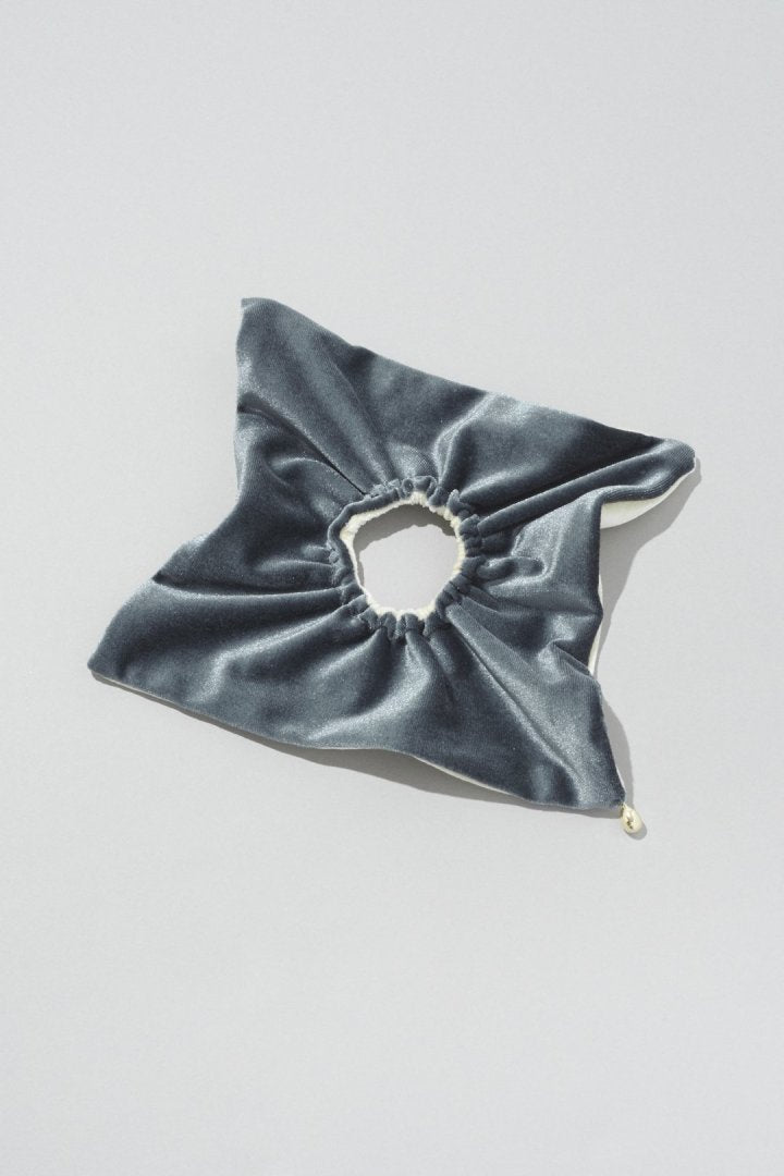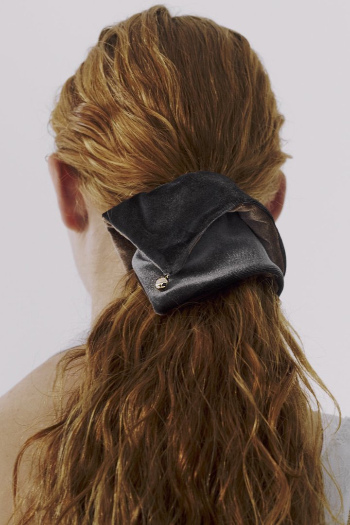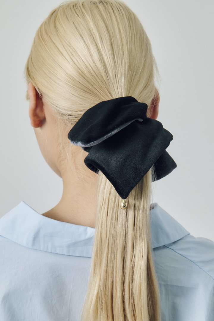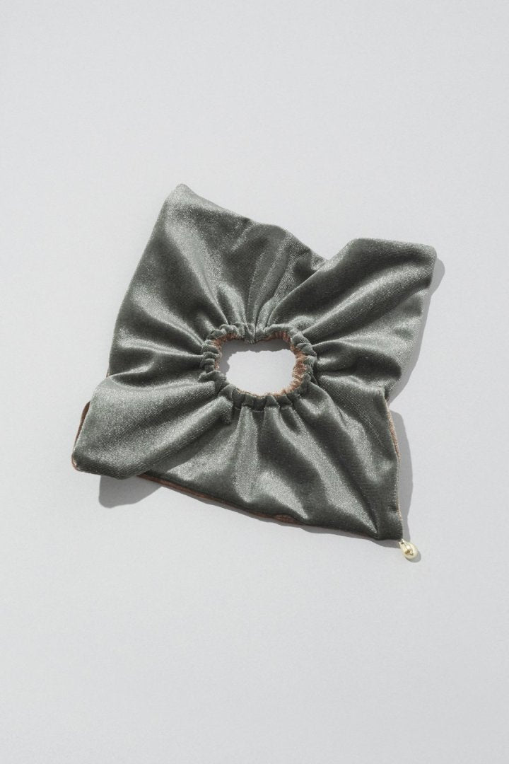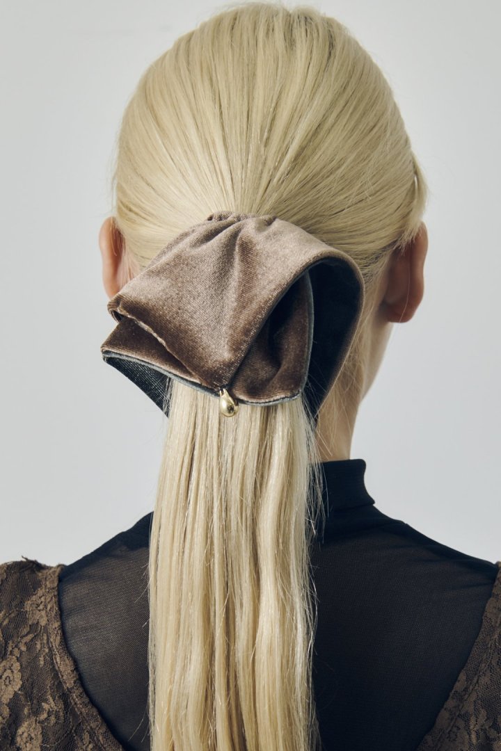 上品な光沢のベロア生地で、スクエア形に仕上げたシュシュ。
