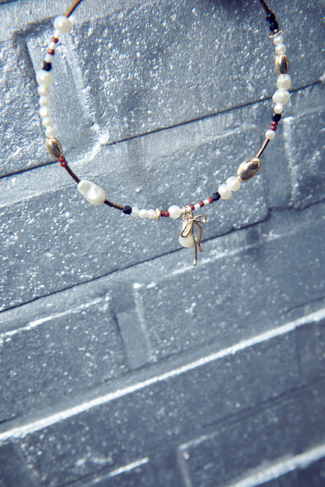 パールやビーズをあしらったネックカフに、さまざまなモチーフのチャームを組み合わせたデザイン。