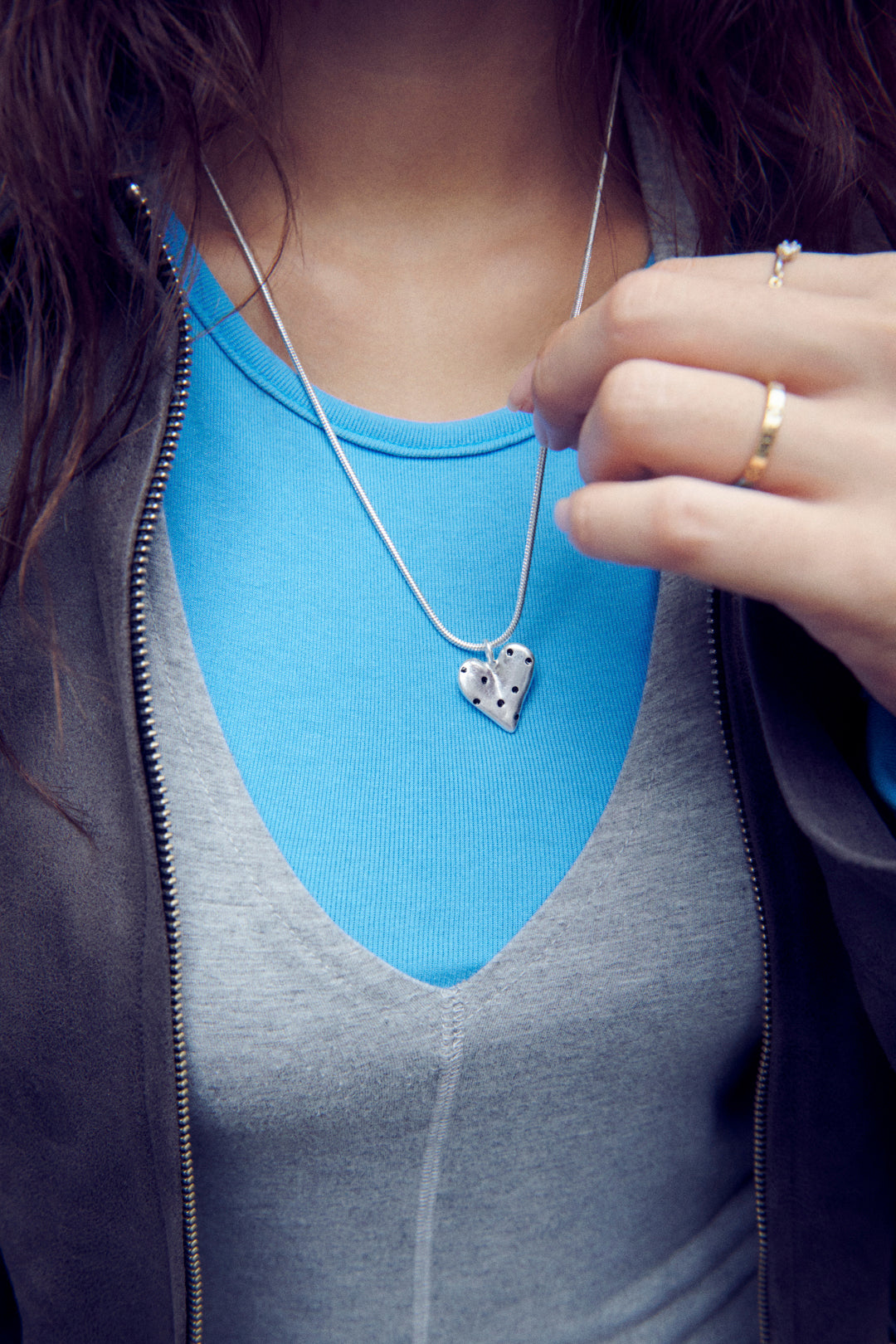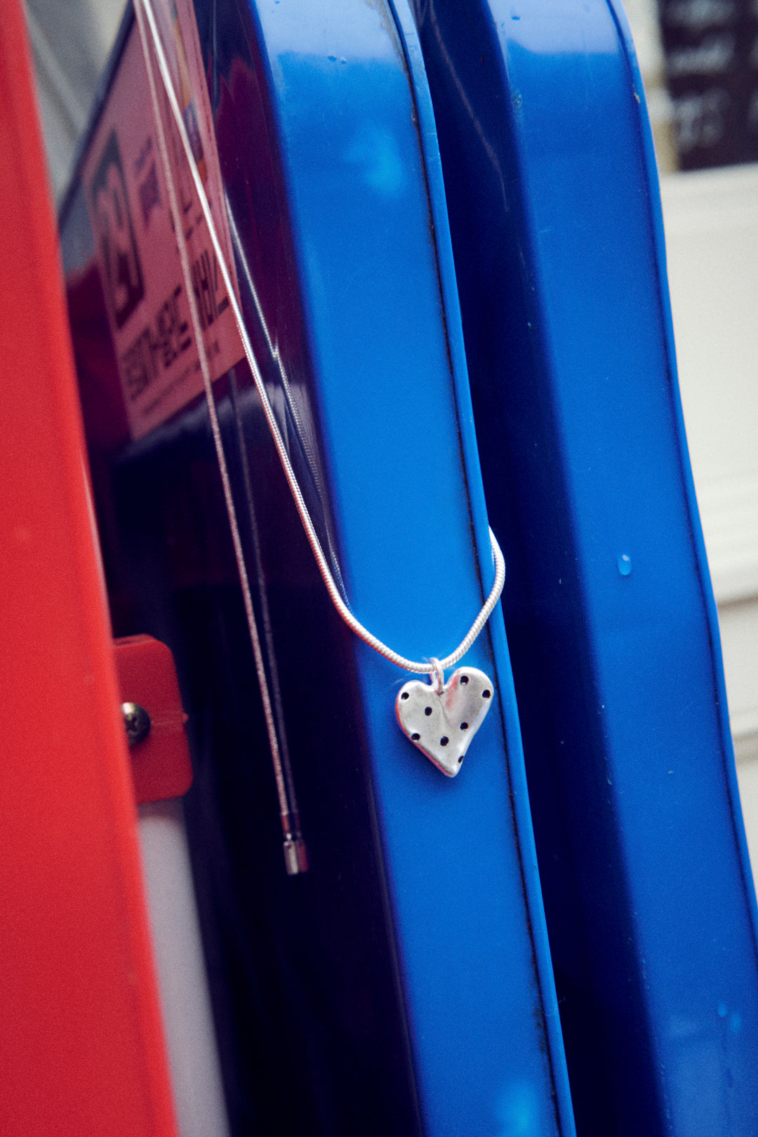 スネークチェーンのネックレスに、ドット柄が施されたハートモチーフを組み合わせたデザイン。
