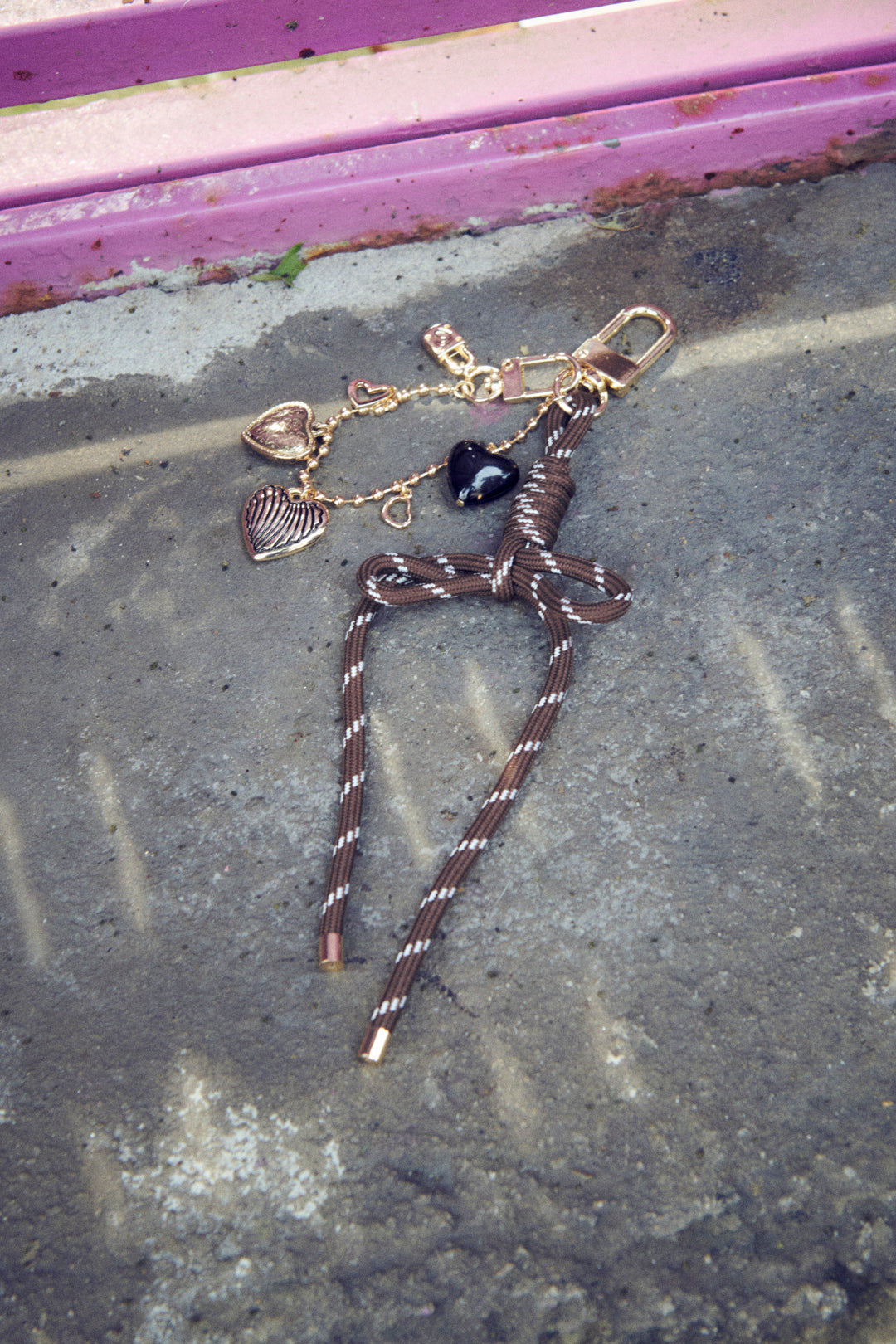 さまざまなハートモチーフが連なったボールチェーンと、ロープのリボンを組み合わせたトレンド感のあるデザイン。