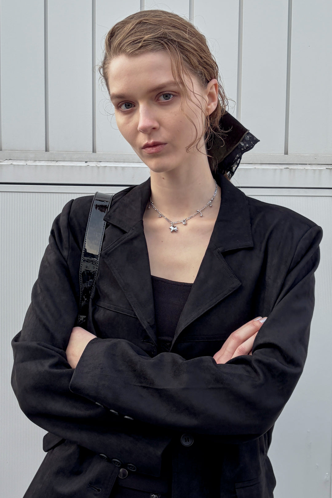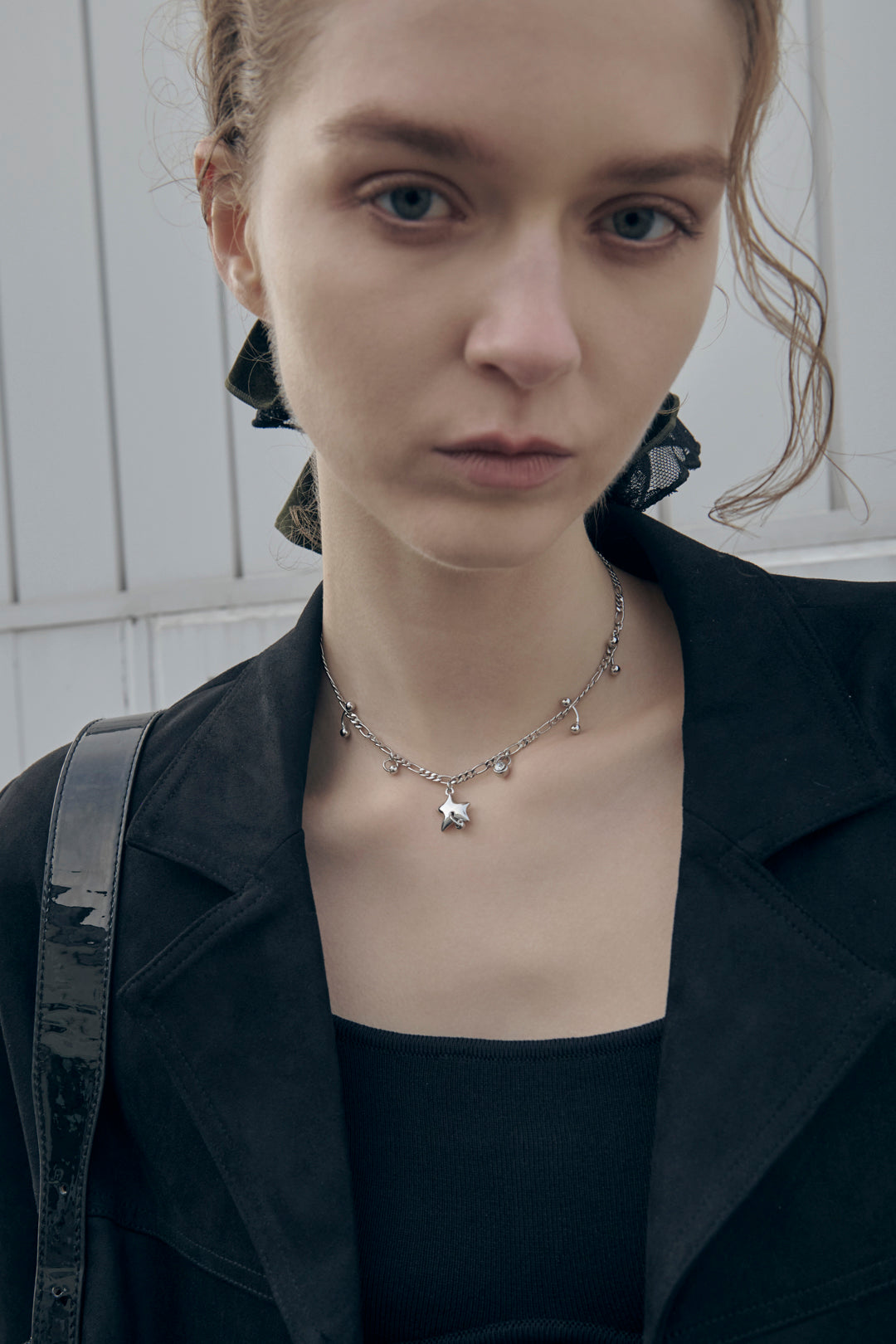 星やバーベルモチーフ、ビジューのチャームがアクセントになったトレンド感のあるデザインは、程よいボリューム感で首元のアクセントに。