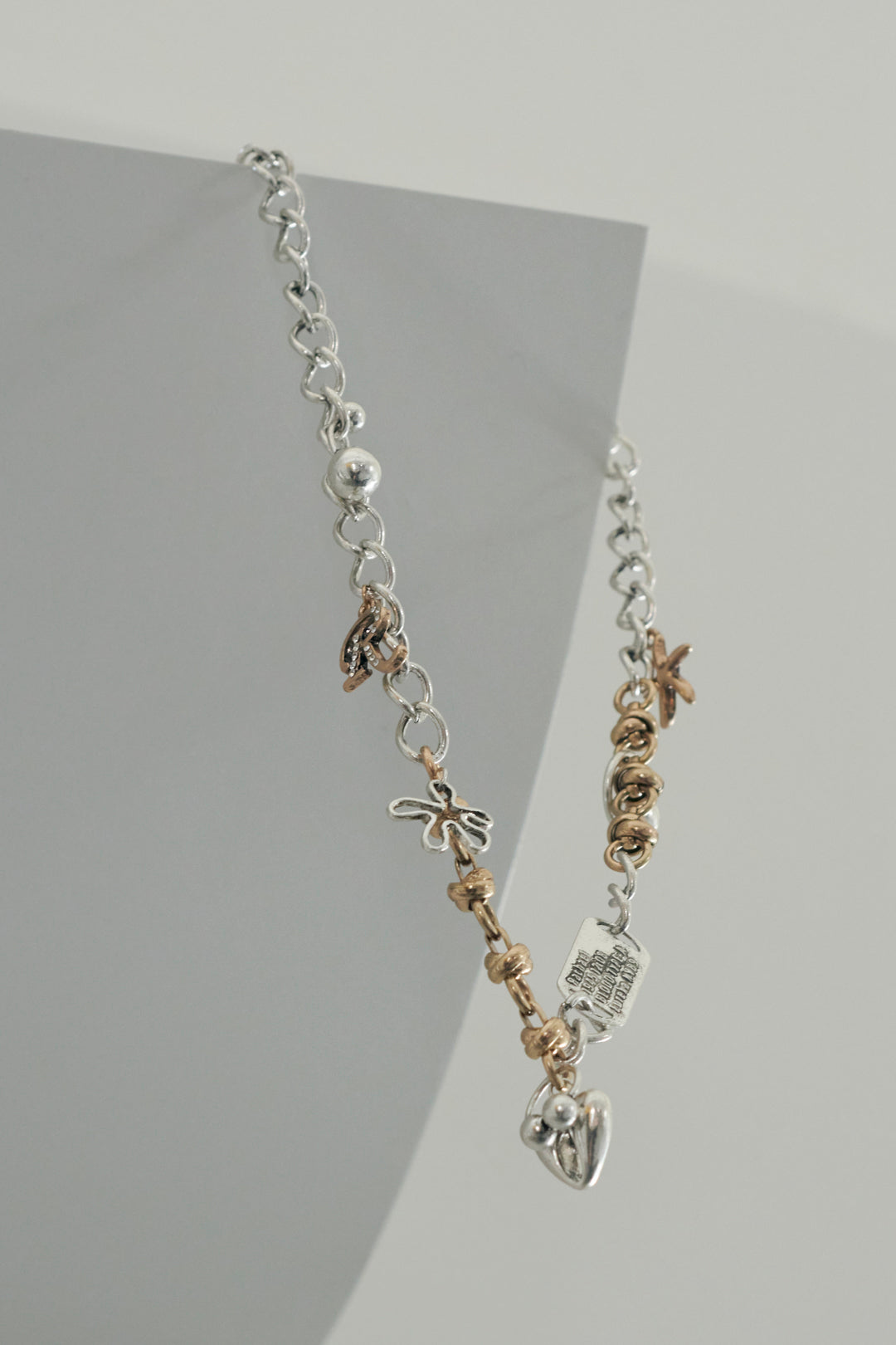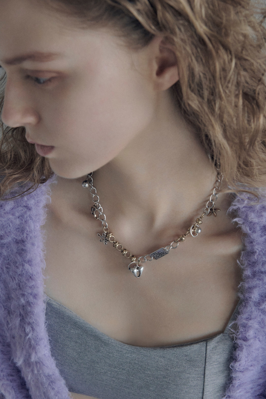 エッジの効いたチェーンネックレスに、ハートやイニシャル、バーベルモチーフなど、さまざまなチャームを組み合わせたデザイン。